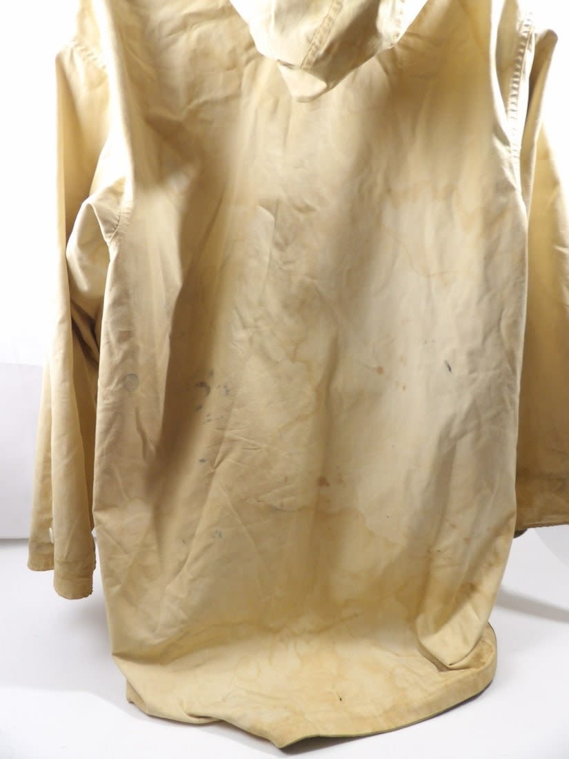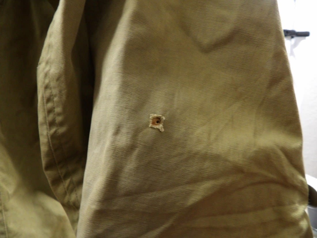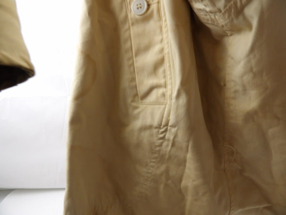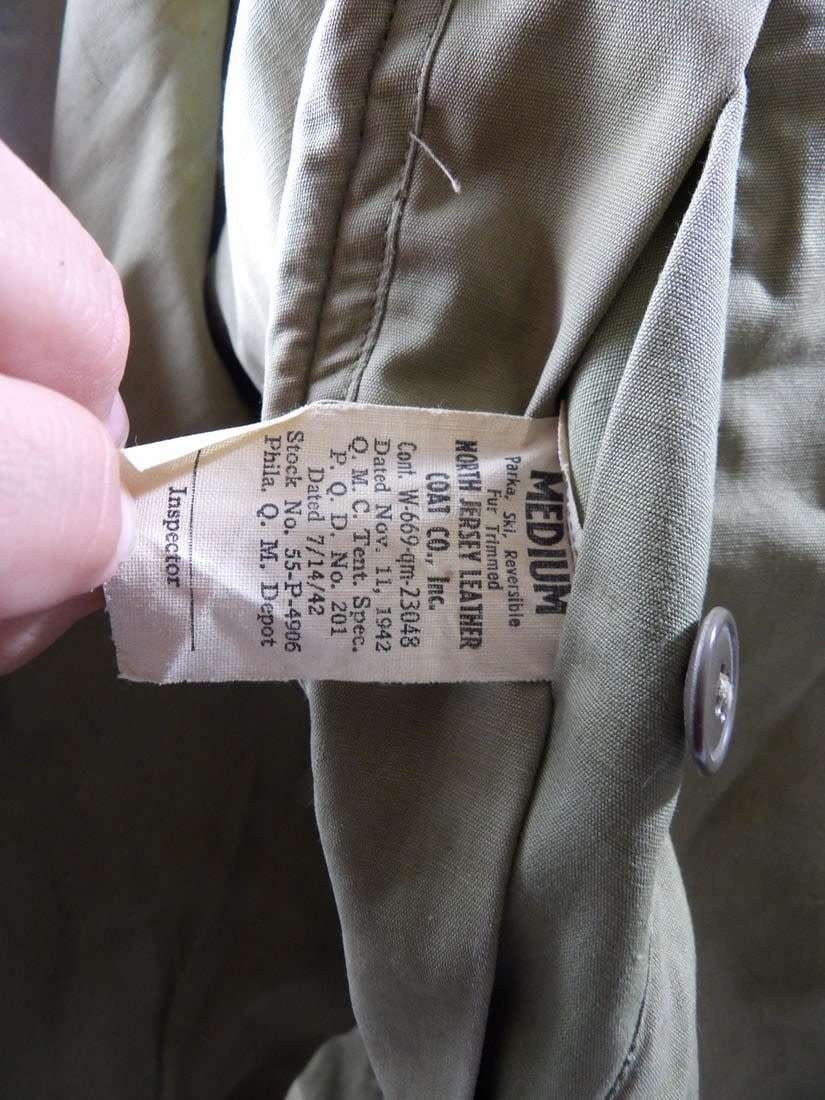 Made by the North jersey leather Coat Company. Couple stains on back and small hole on sleeve. Reverse white side shows lots of Sweat Staining