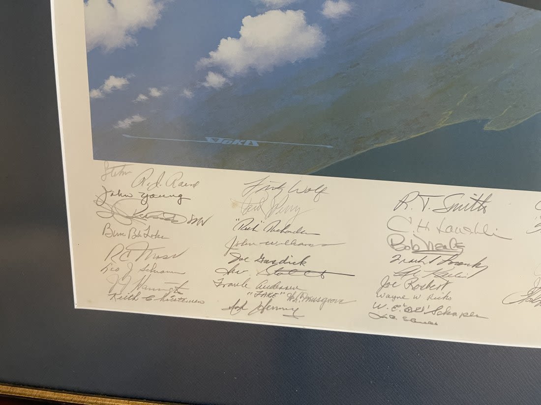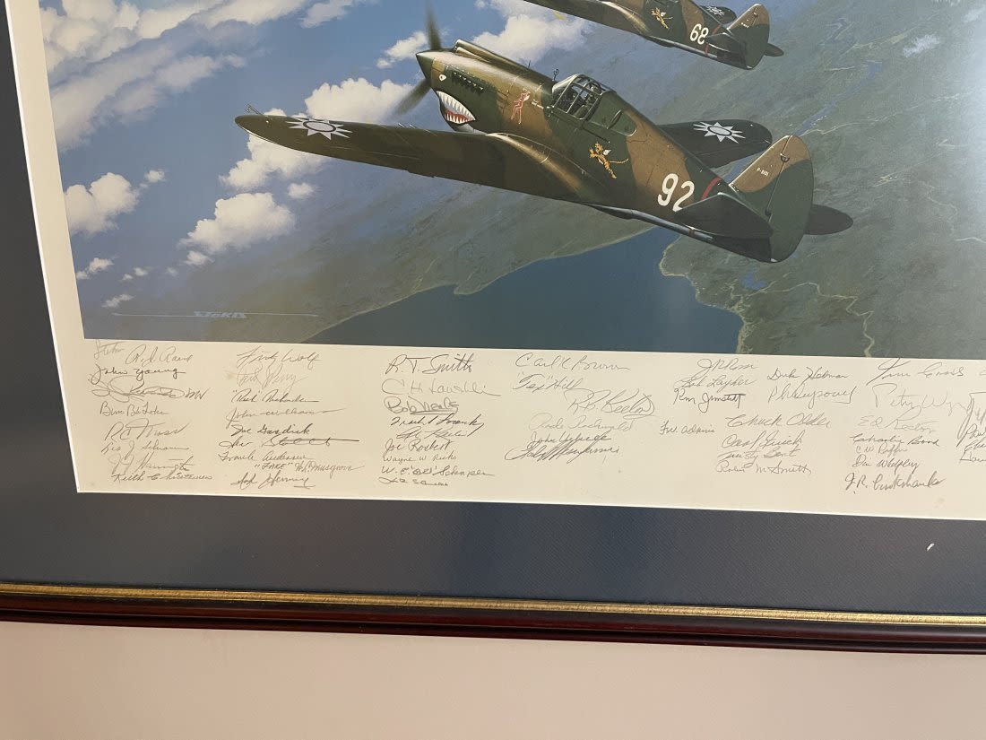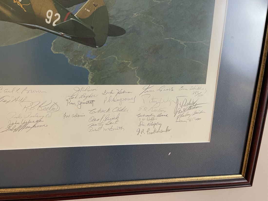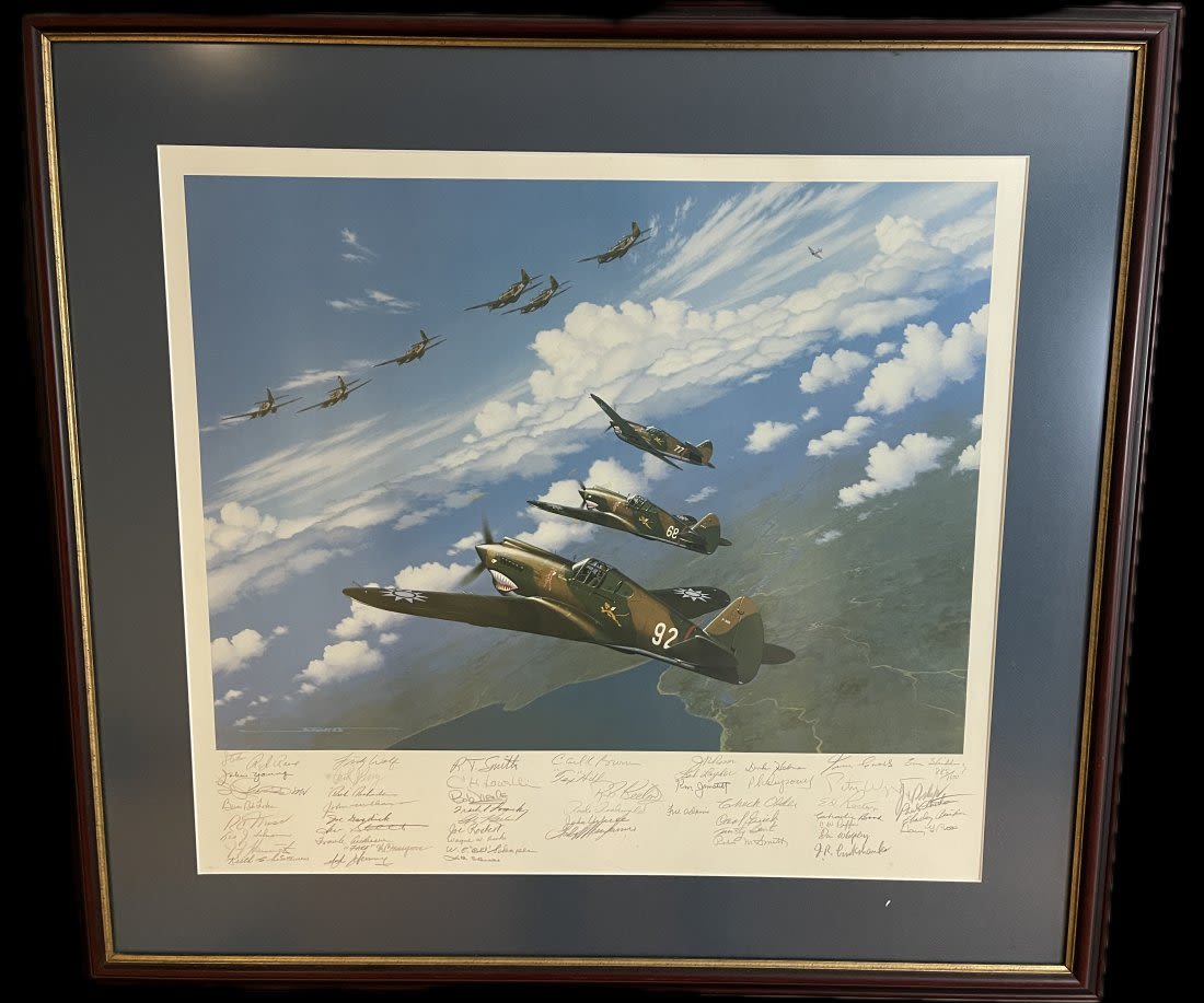 Full-color limited edition print featuring the Flying Tigers battling over Rangoon. The copies offered by the Flying Tigers Association are the only ones with more than 50 AVG members’ signatures. Features the planes of Duke Hedman, Chuck Older, and R.T. Smith. Will ship FramedImage size 25 x 18.5Overall size 30 x 26
