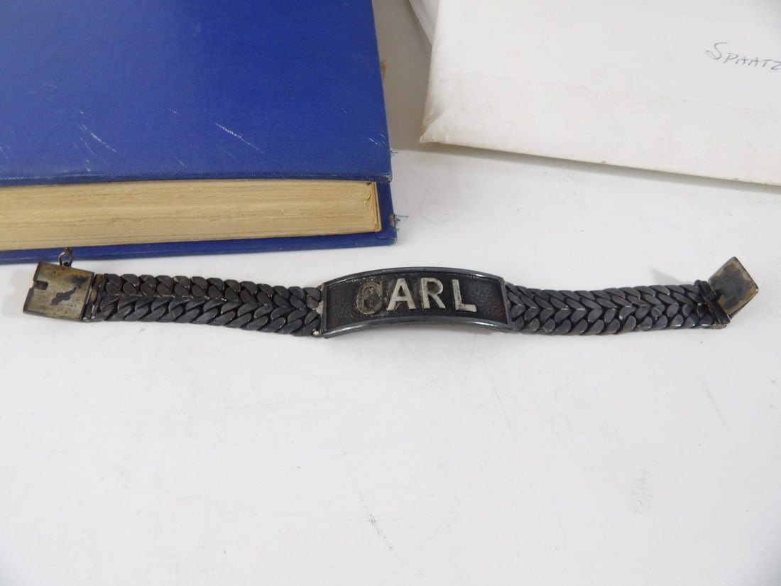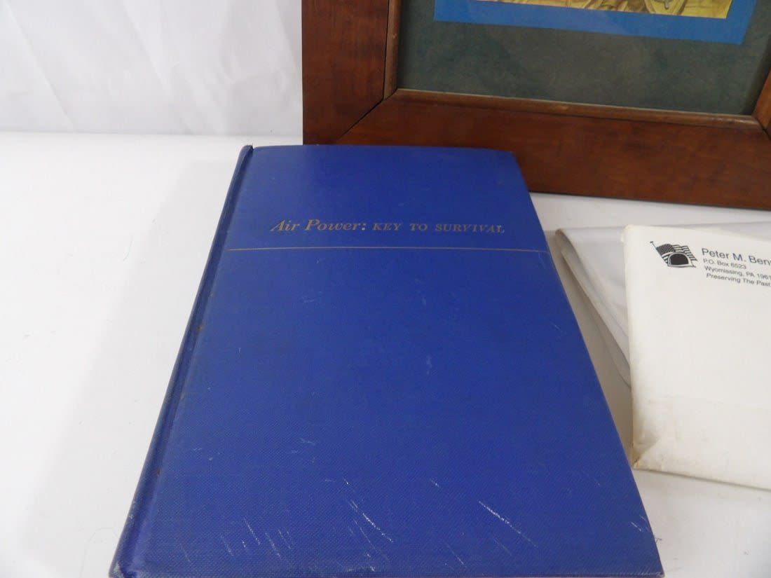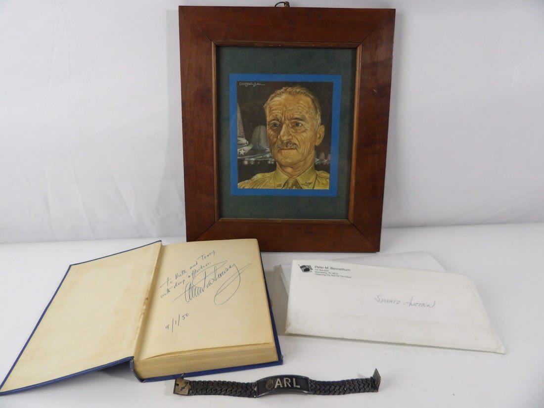 Includes Items from his Personal Estate that were sold off in 2006. Winner Will receive printed digital Documents from that auction. Also included is a Framed Art piece featuring Spatz. His personal Id Bracelet and a book from the generals Personal library. Air Power: Key to survival. The book is inscribed to The general and his wife and is Autographed.