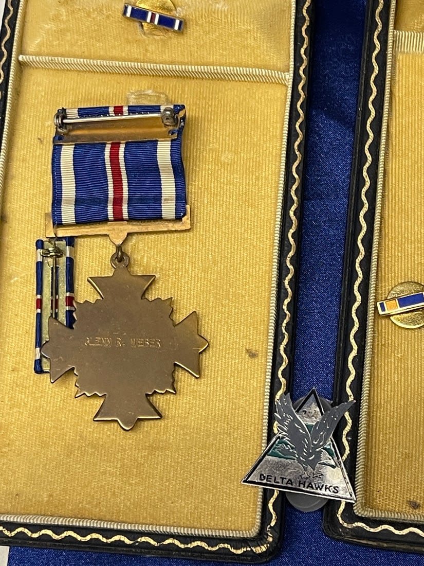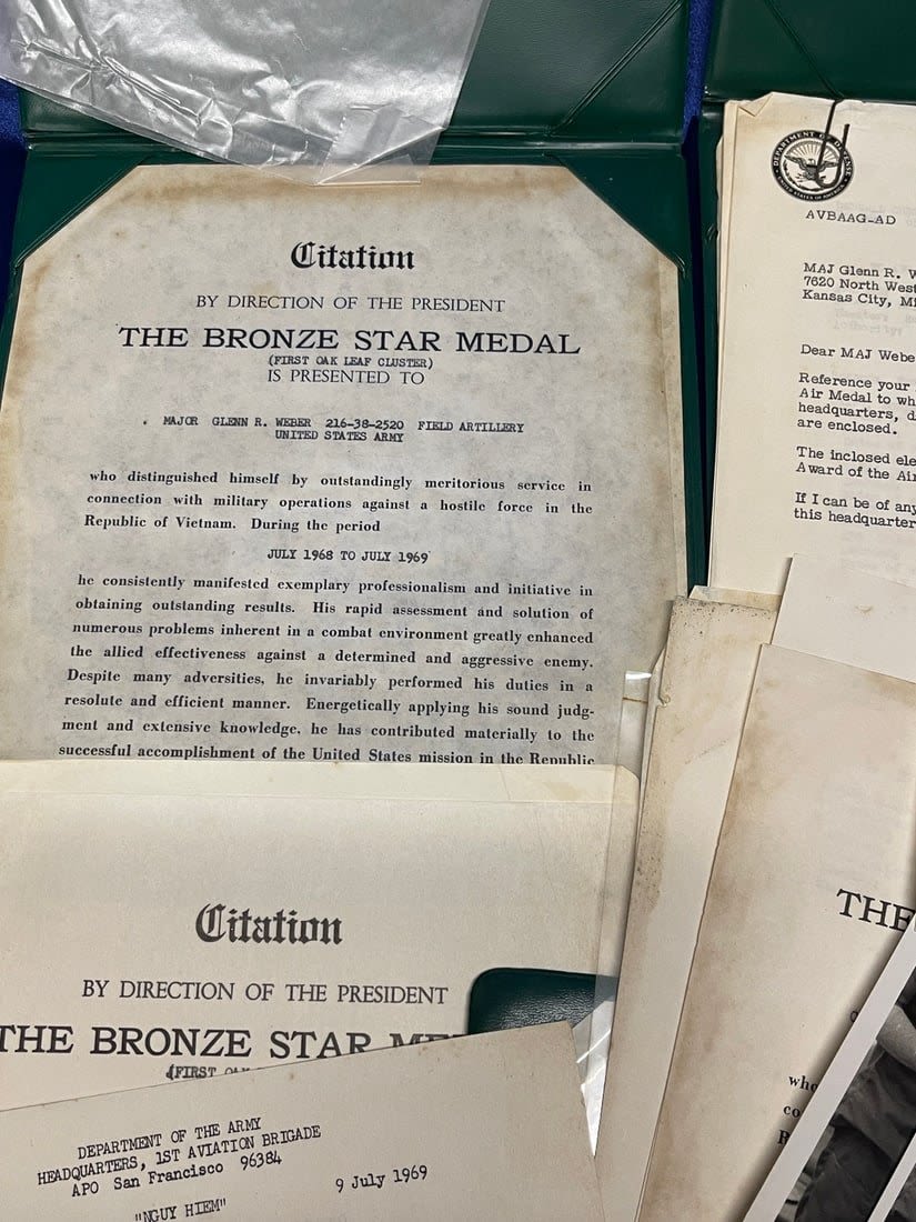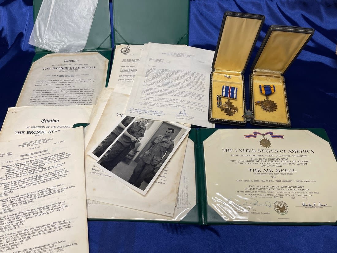 Maj. Weber served with the 244th Assault Helicopter Company’s, Field Artillery unit. The lot includes citations for the DFC, AM and Bronze Star (medal is not with the group). The DFC is engraved. The lot also includes a beer can 244th AHC Di.