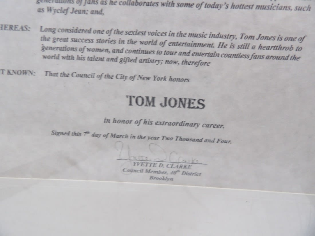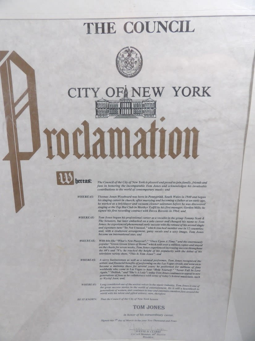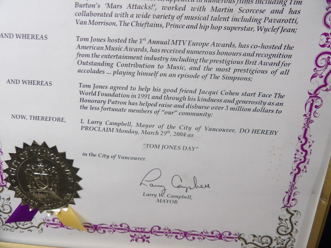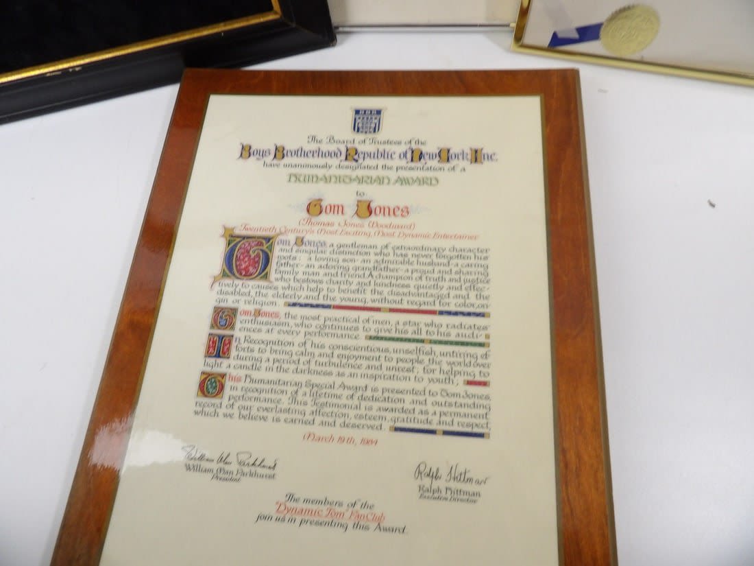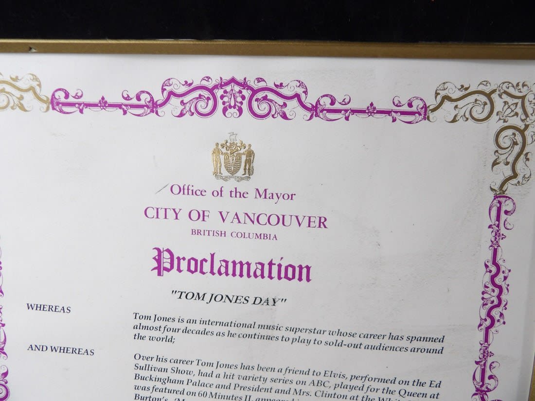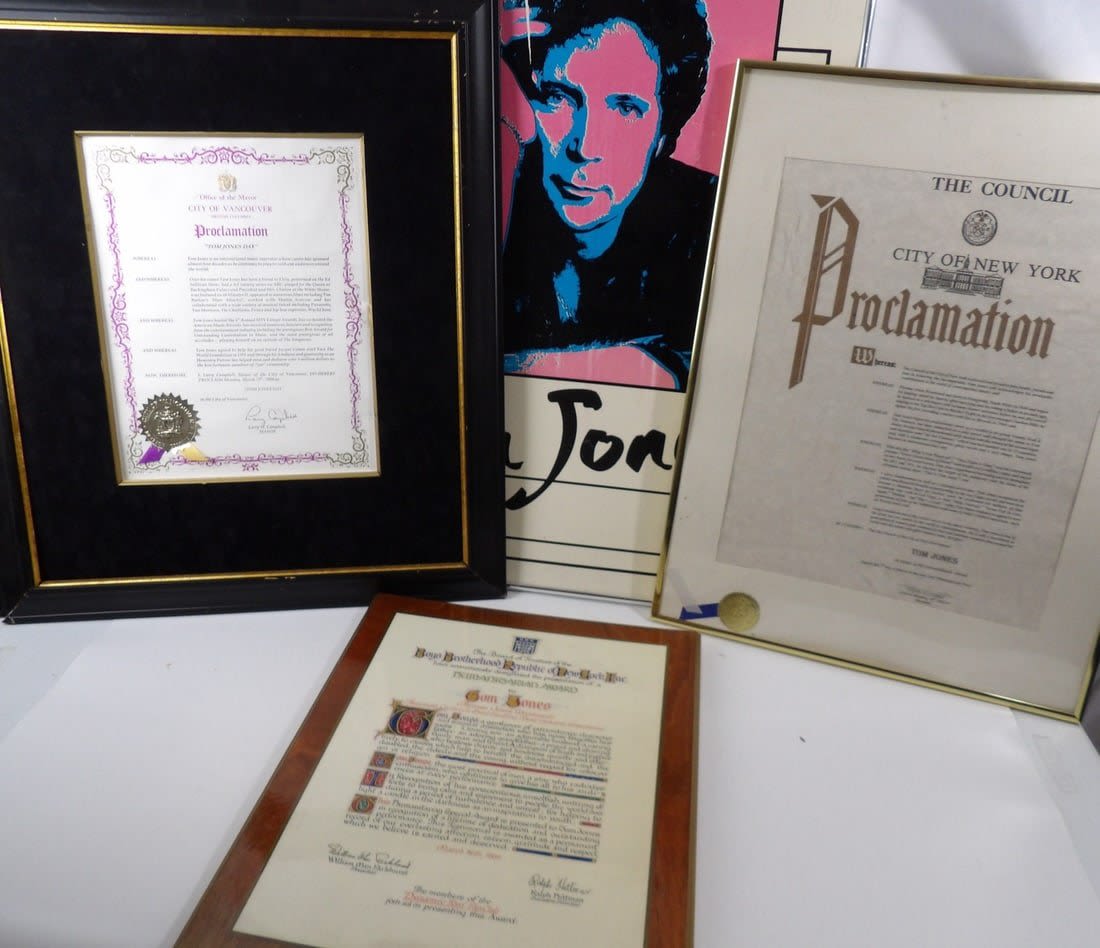 These items were located in an abandoned storage unit. These are proclomation awards for Tom Jones Day in Various Cities. Also included is a poster. Please notate damage and stains on pieces.