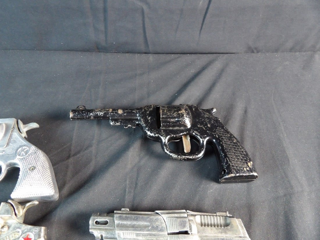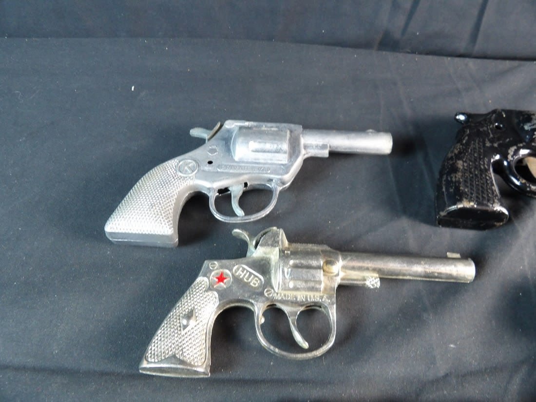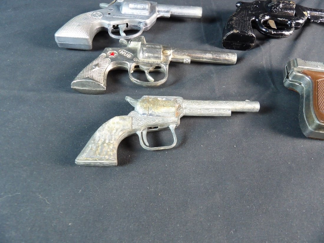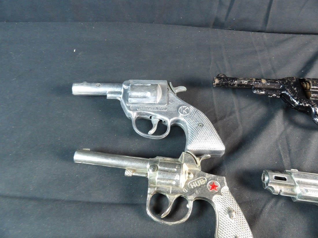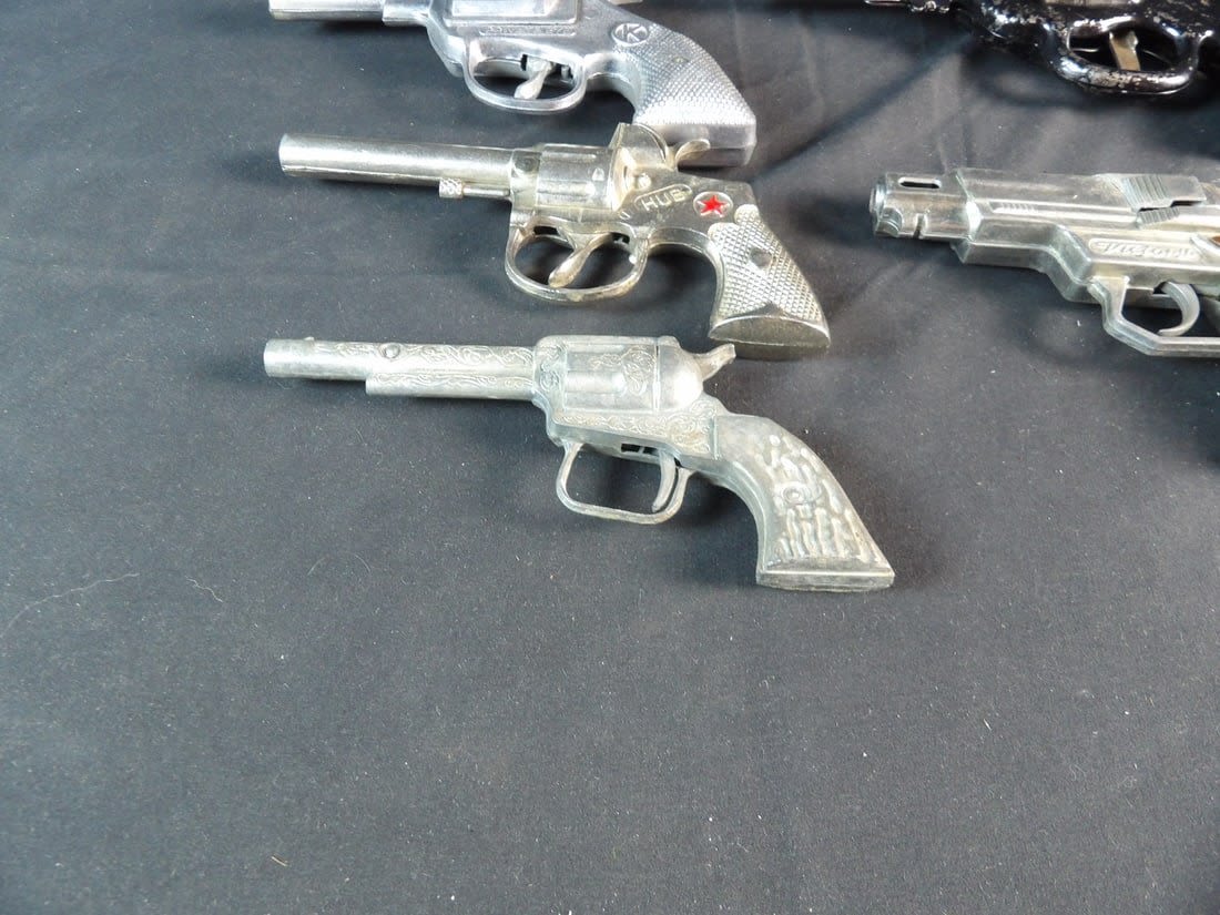 Hubley, Kilgore private eye, Victory, Made in hong kong and more. All work except for Black revolver. May need cleaning on others.