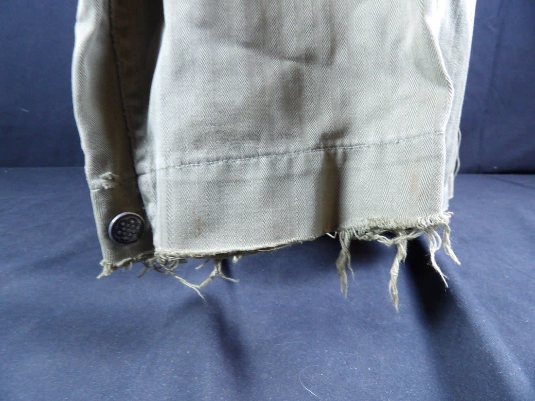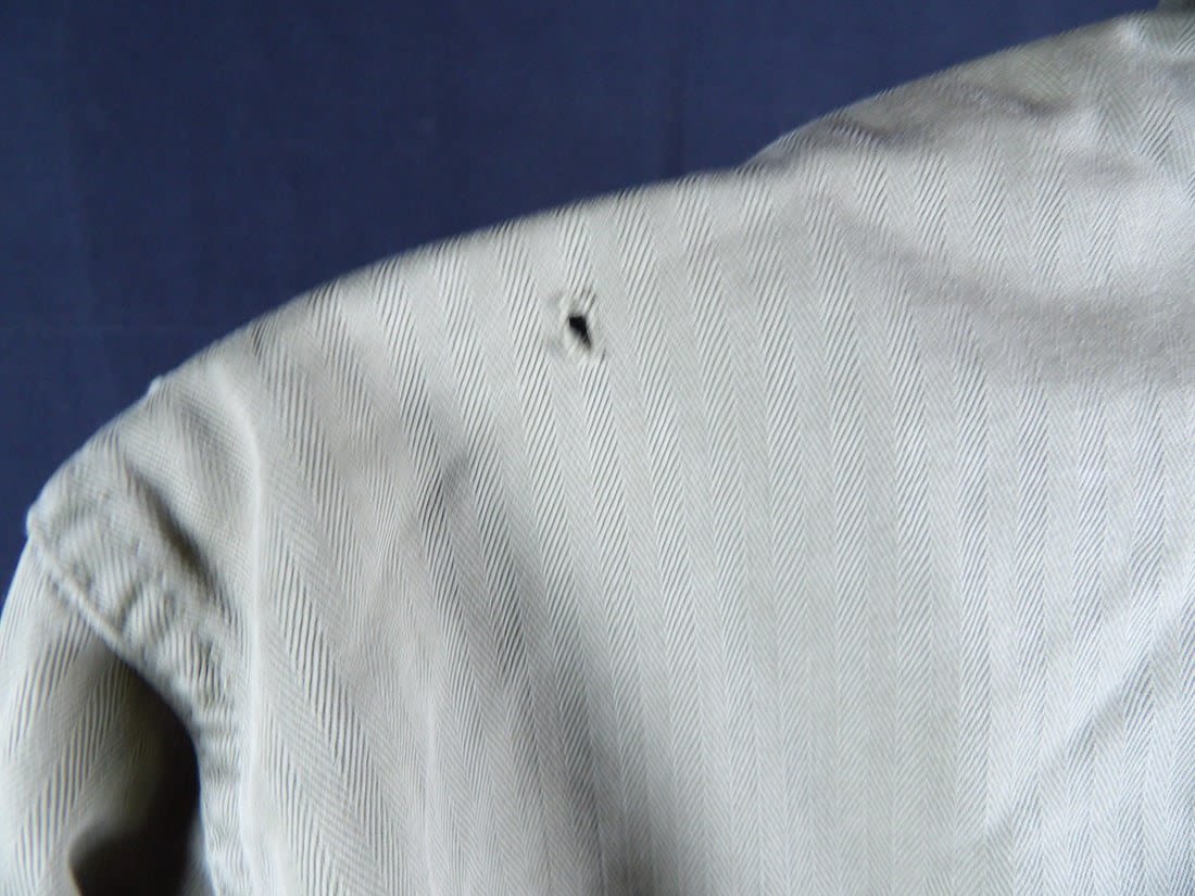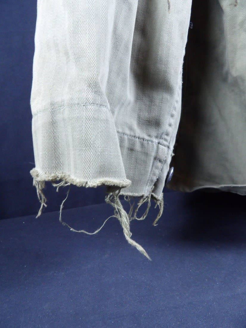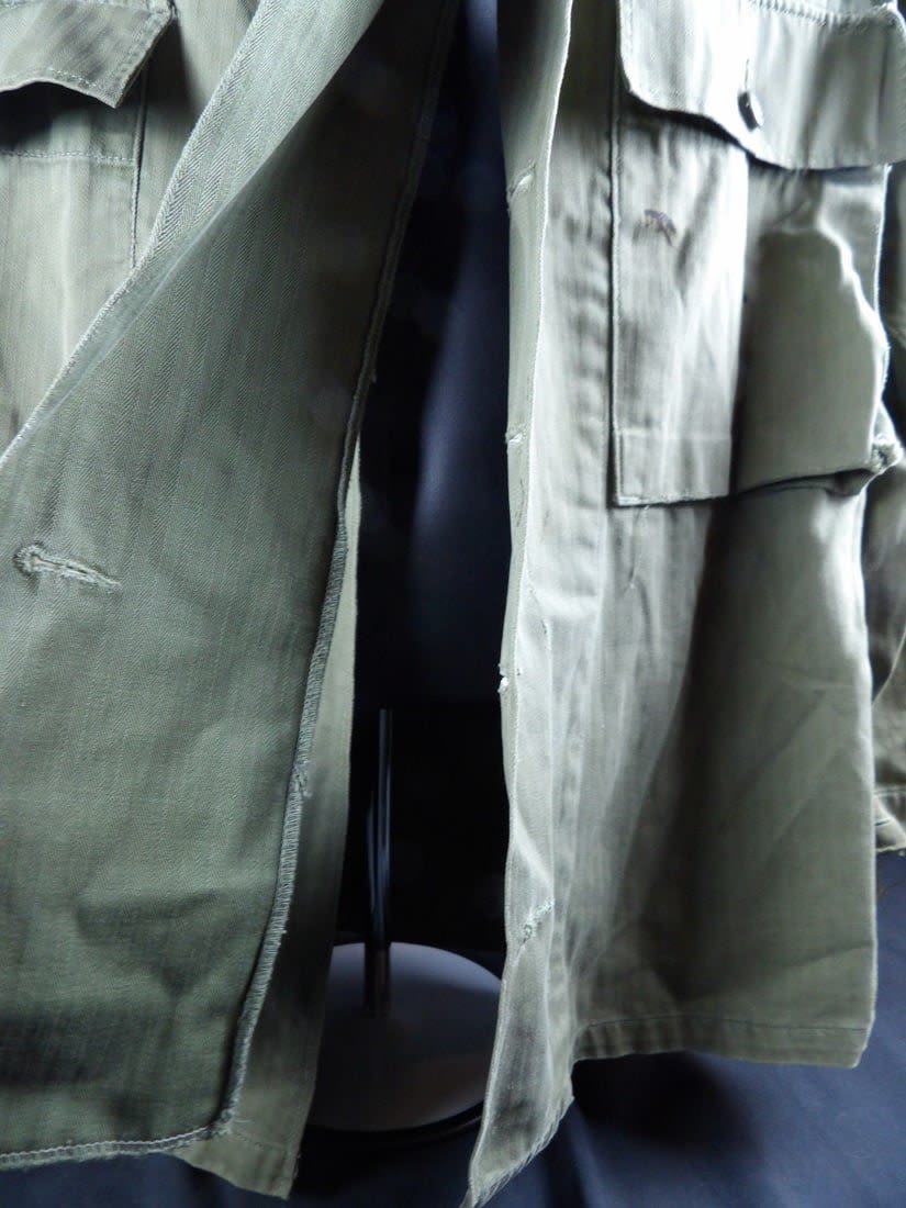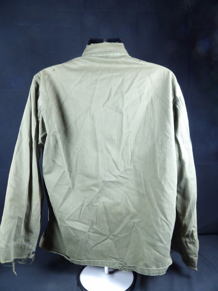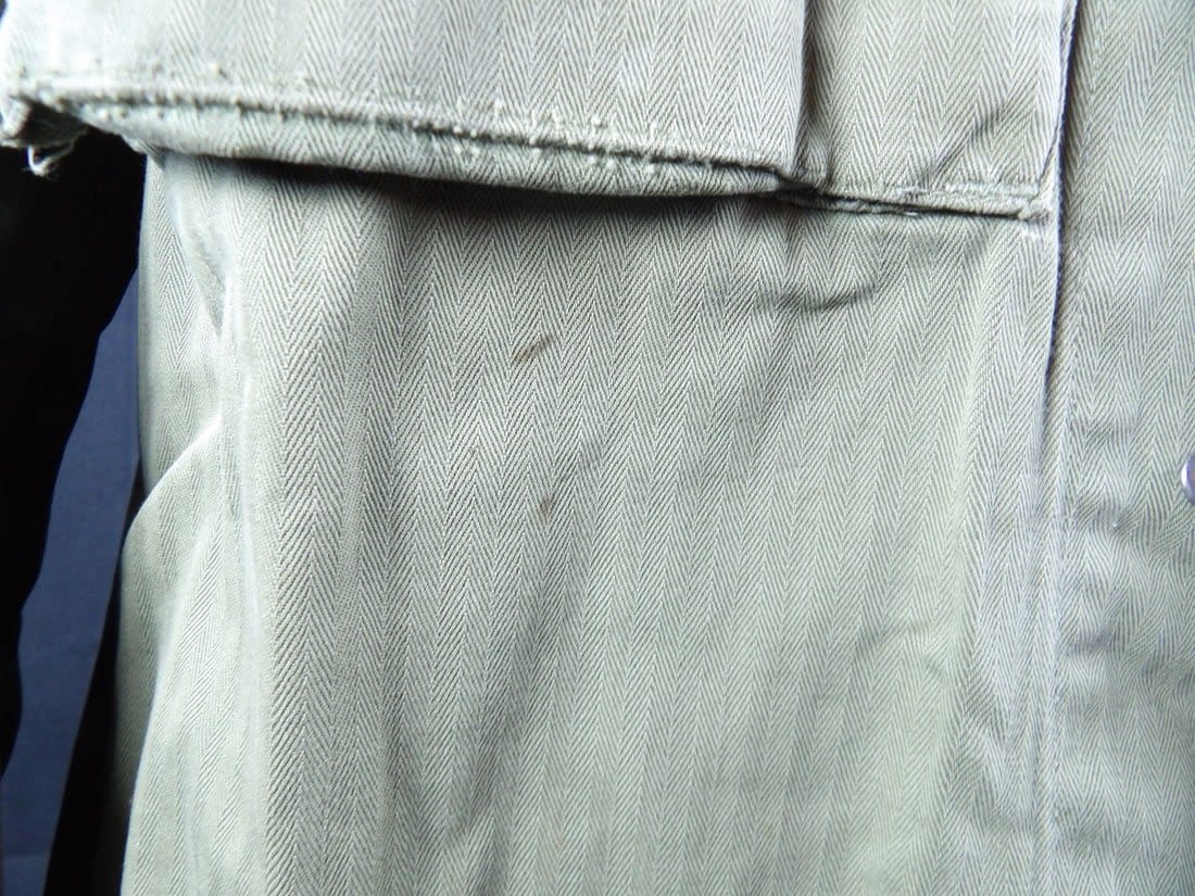 Signs of wear on cuffs, collar and pockets. Black stains on multiple sections of shirt. 40r size. Gas flap has begun to seperate from shirt