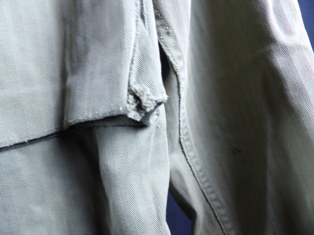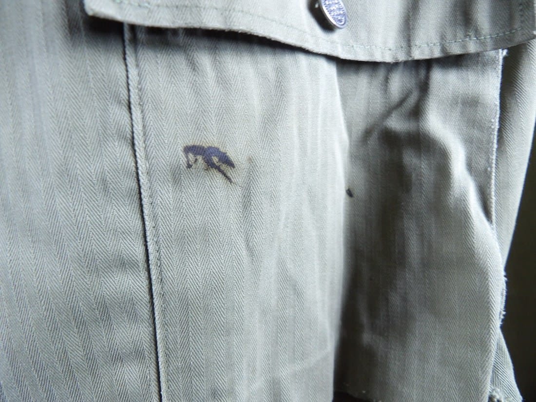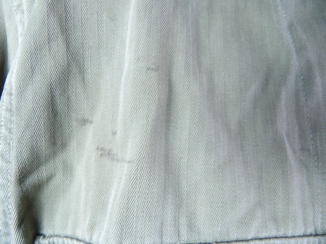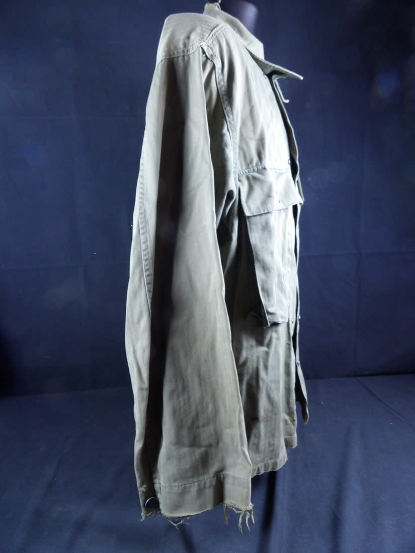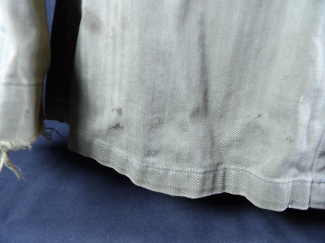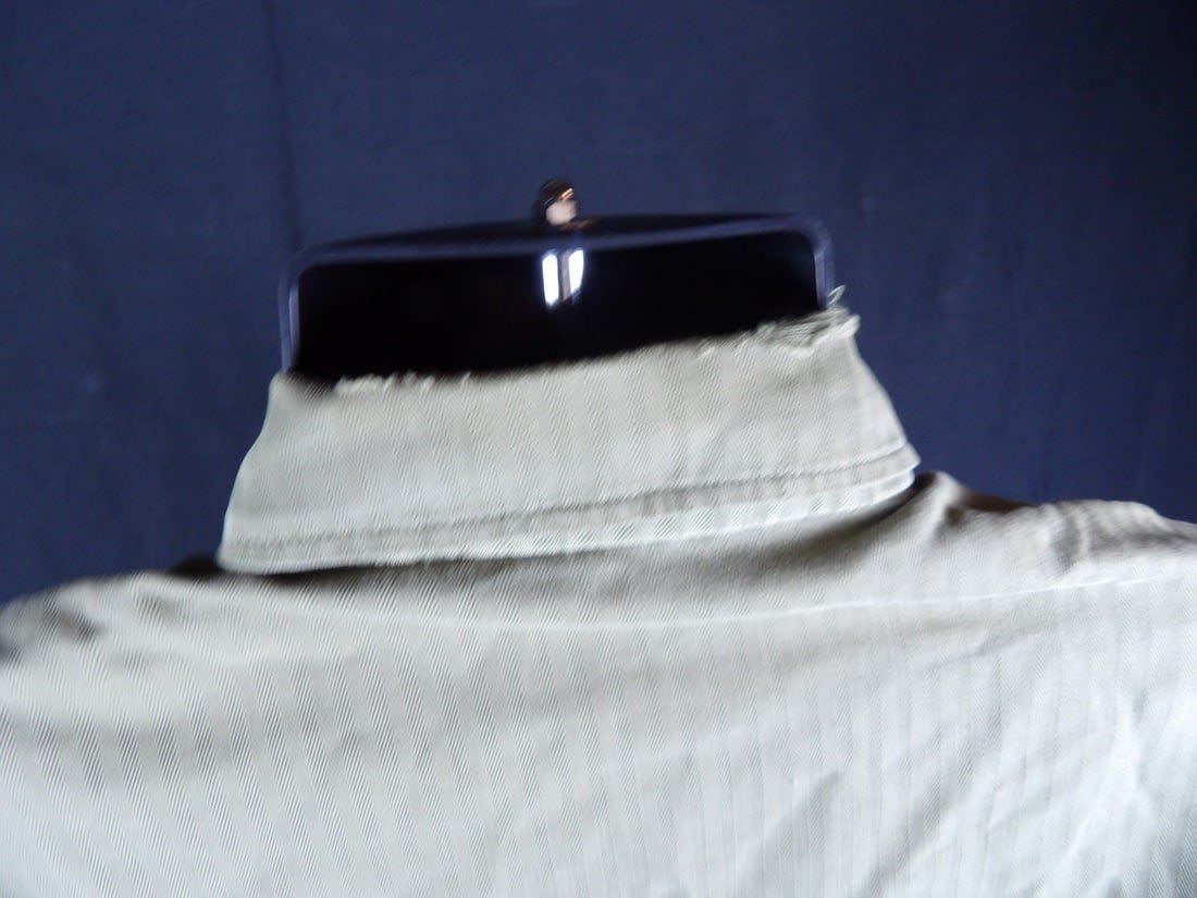 Signs of wear on cuffs, collar and pockets. Black stains on multiple sections of shirt. 40r size. Gas flap has begun to seperate from shirt