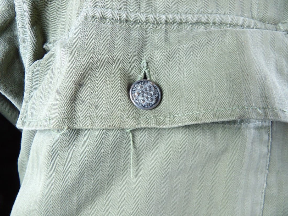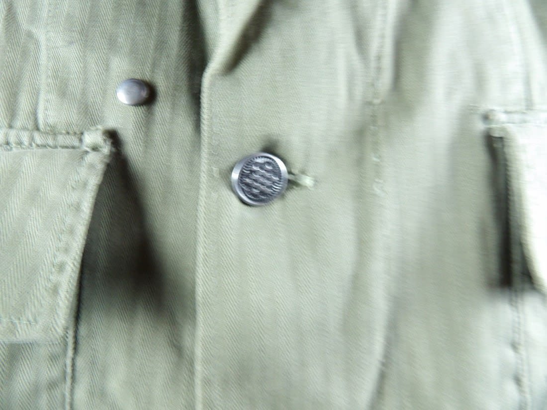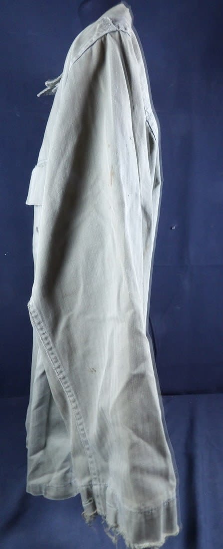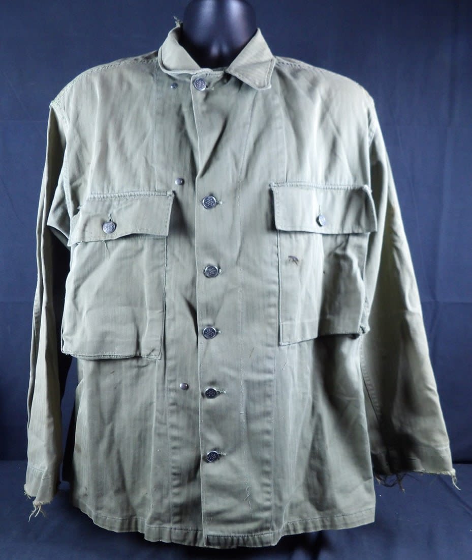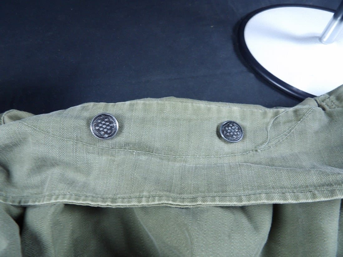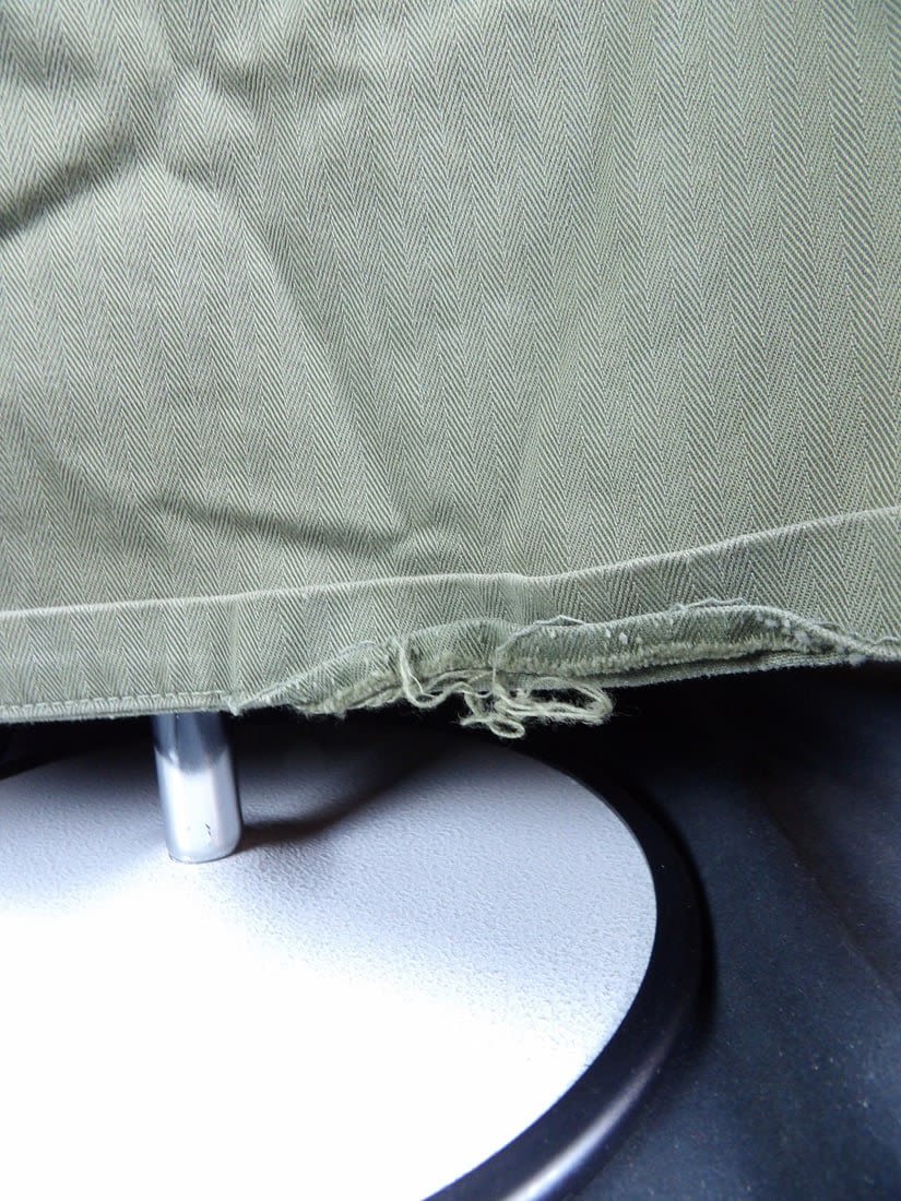 Signs of wear on cuffs, collar and pockets. Black stains on multiple sections of shirt. 40r size. Gas flap has begun to seperate from shirt