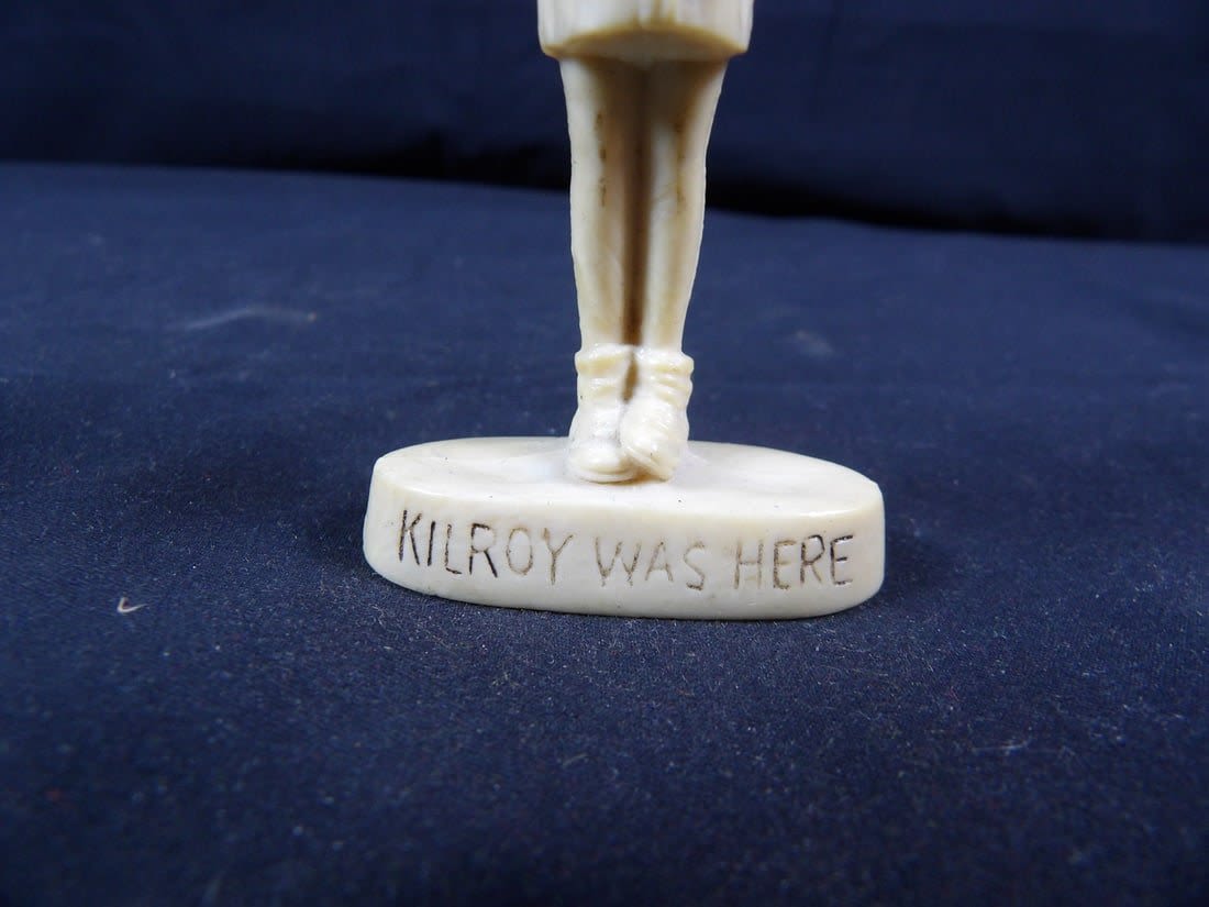 Resin made. Roughly 4". Kilroy was graffiti character made up in WW2 and is loosely associated with american servicemen