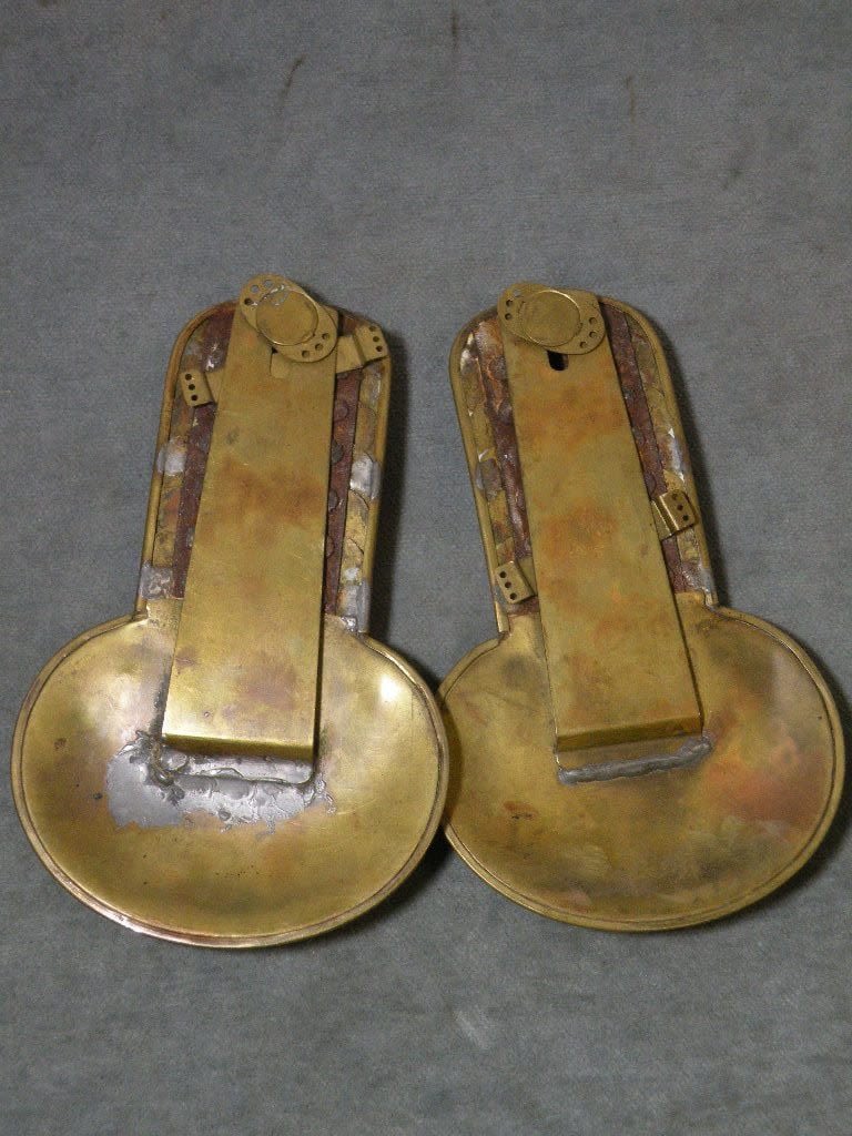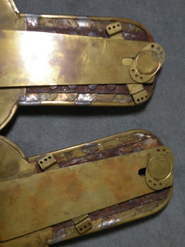 Civil War enlisted shoulder scales for Privates. Very good condition. Light artillery, cavalrytroops, and some NCO’s, musicians and privates of infantry units went to thefront decorated with brass scales on their shoulders. Made of brass, there are six scales attachedto a pan, held together with a thin iron sheet, a brass strip soldered to thepan, and attached to the bottom with a thumb turn, would fit under a brass clipsewed onto the jacket.
