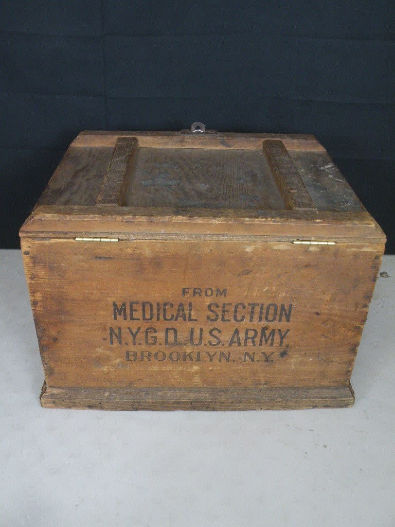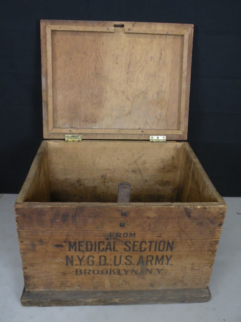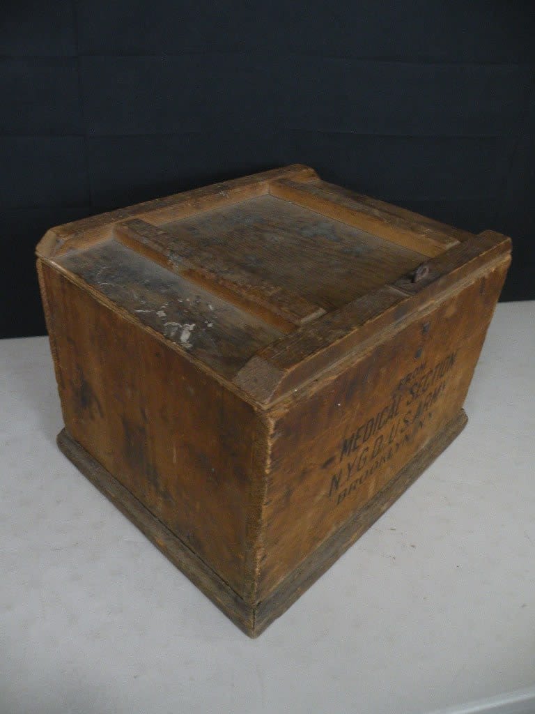Fantastic Spanish American War Medical Chest for alcohol. This chest would have contained grain alcohol and was kept in this padlocked chest as Soldiers could get into the supply and drink it! Only one I have seen. This one was shipped to New York Regiments in the field. Approx 19 inches in length.