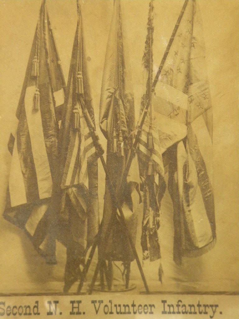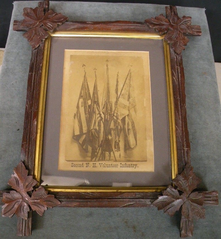 Very rare cabinet photo of the colors of the 2ND New Hampshire Volunteers. Frame measures 15 inches. Image area that is exposed is 8 x 5.75. Obviously the overall size is a bit larger.