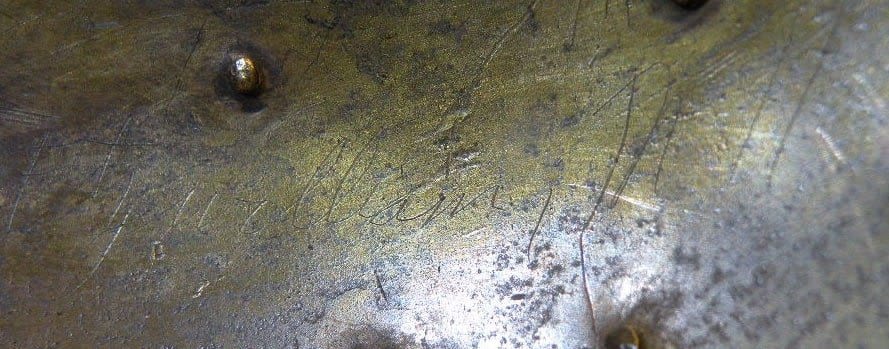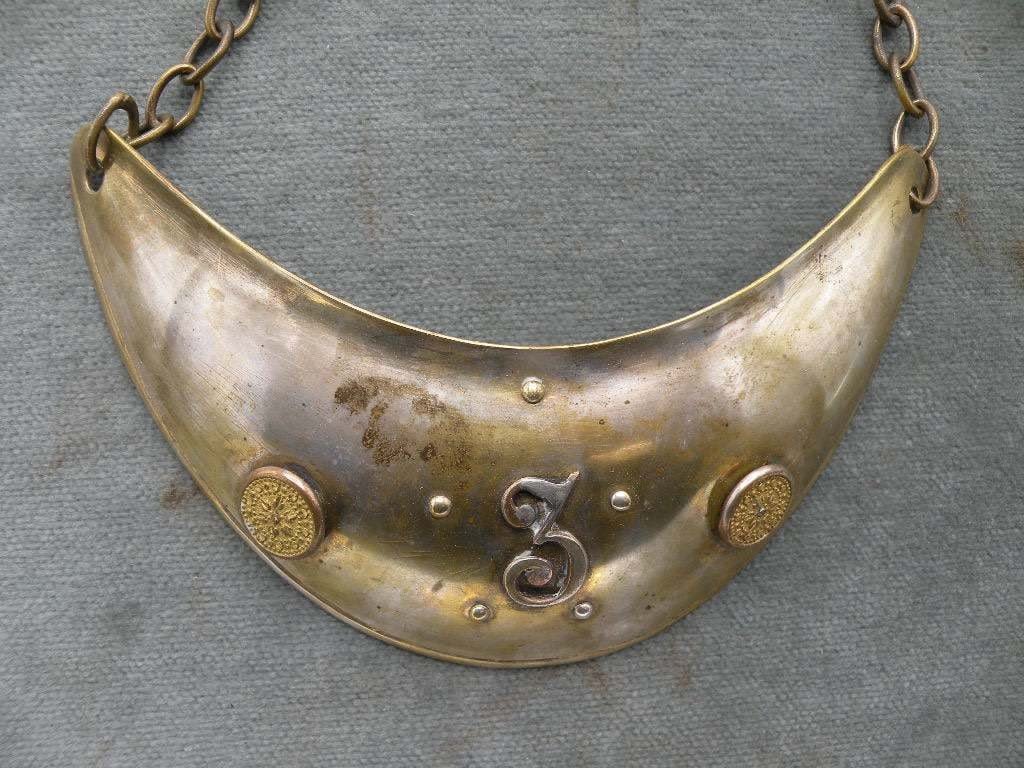 Rare 1830s-40s Officers gorget for a member of the 3RD New Hampshire infantry. Appears to be a recycled captured British 1812 gorget. Scratched into the back. "3RD Regt" N.H." "Co. A". Next line is a name "Jacob Masson"? and below that "Fitzwilliam, NH". Surfaced in New Hampshire last year.