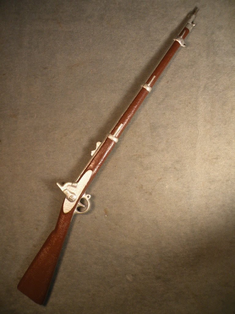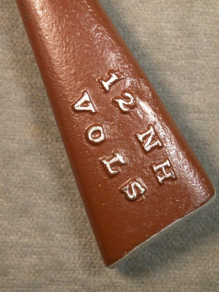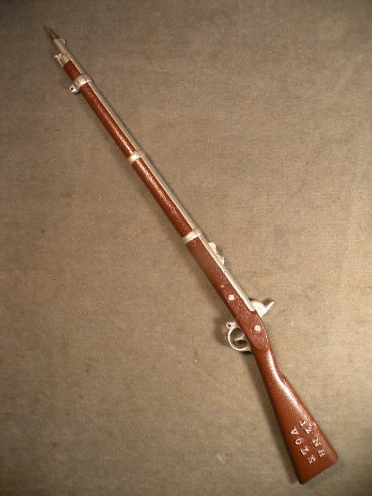 Cast iron Civil War musket with "12TH NH Vols" cast into the butt of the musket. The musket would have been painted gold when created in the 1880s. These were given out at a reunion of the 12TH NH in the early 1880s. Approx 12 inches in length.