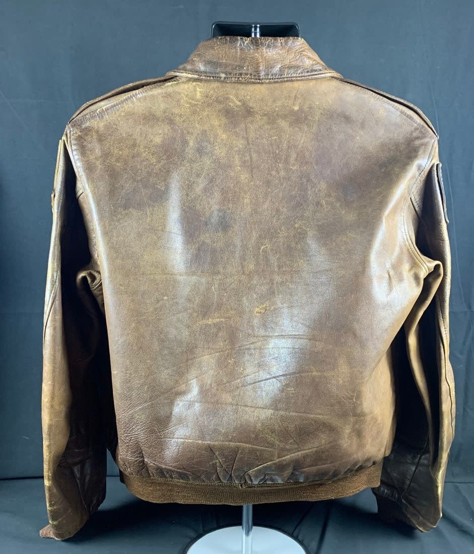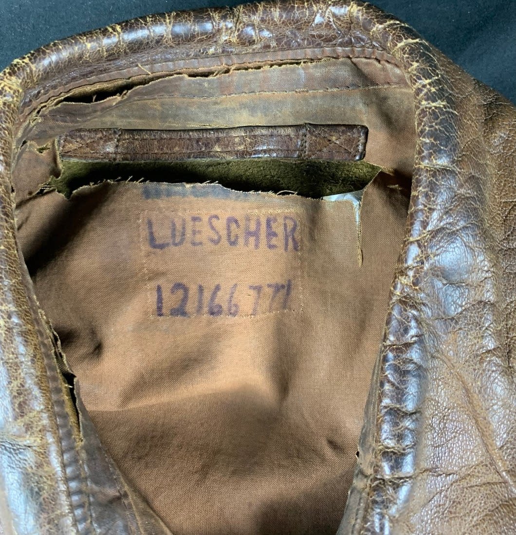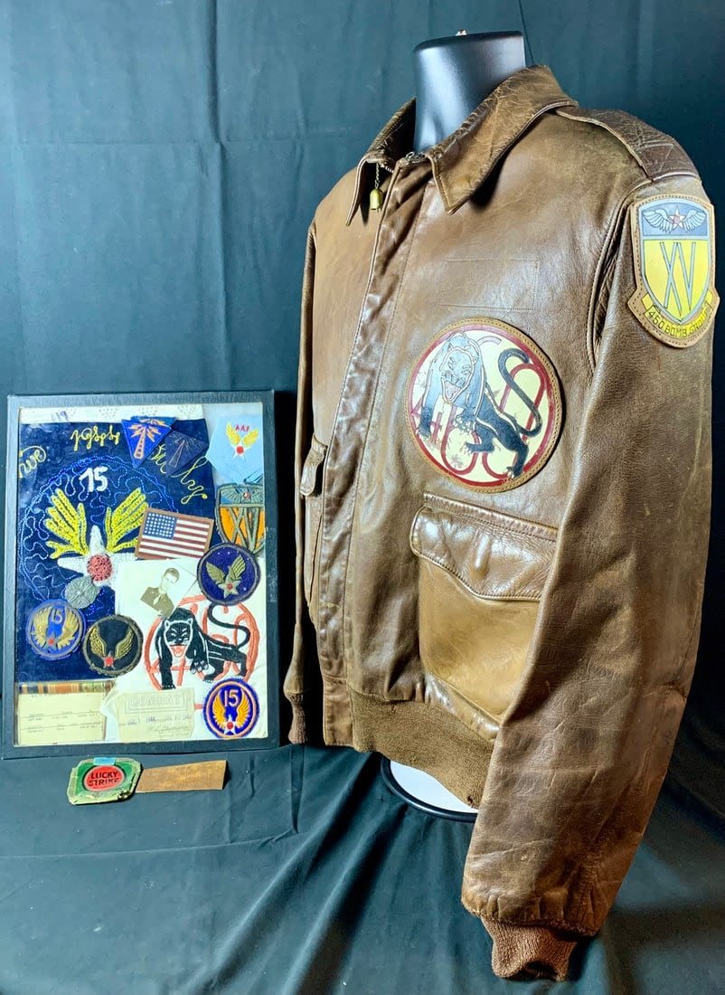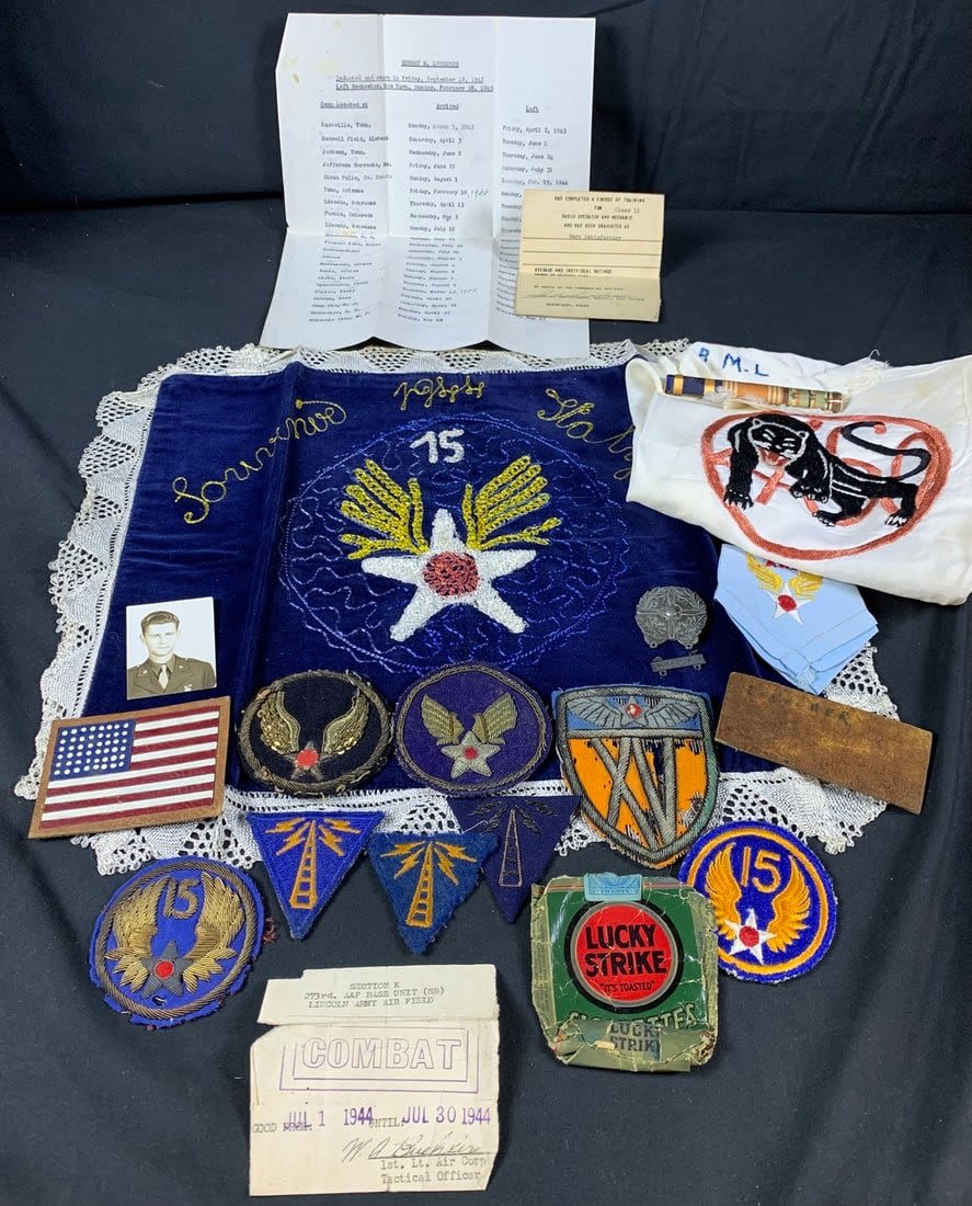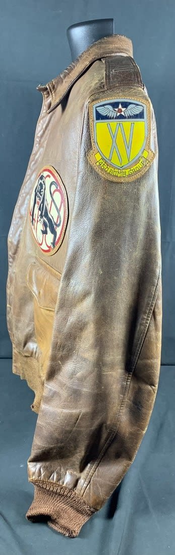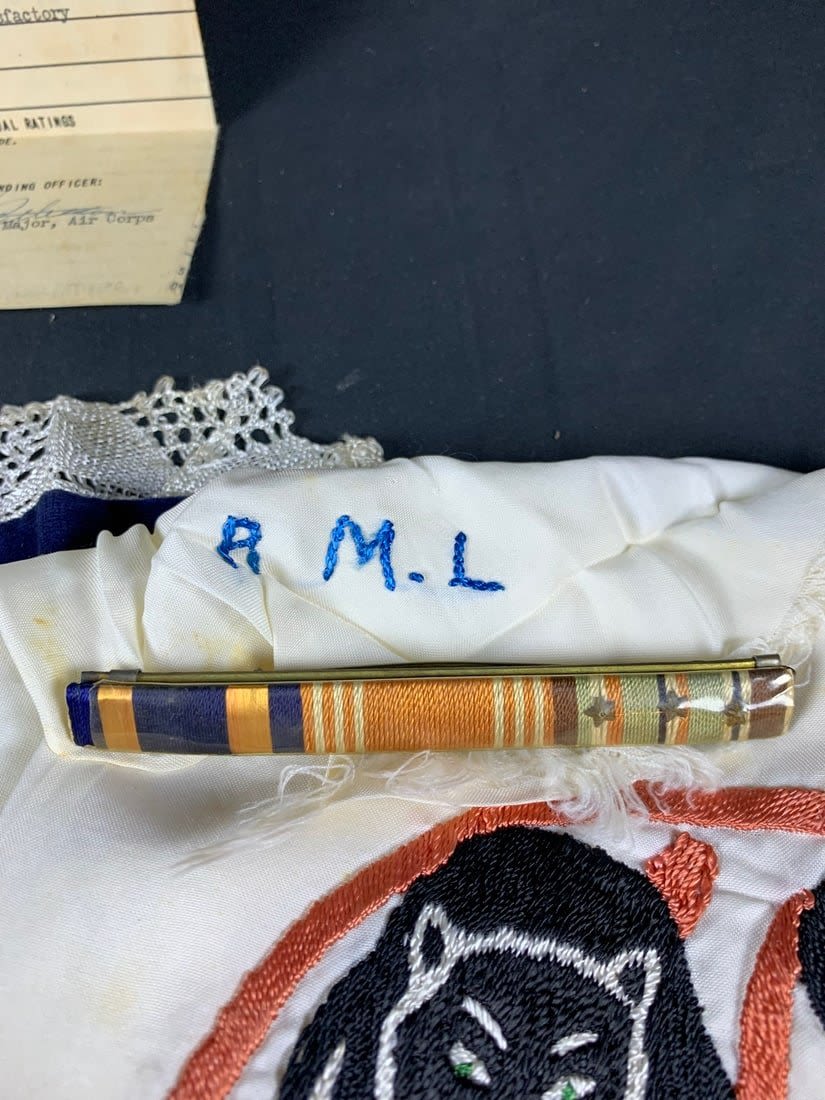 Named to Robert M Luescher. This group includes a beautiful original A-2 with 3 Leather patches. Leather is pliable. name tag is detached but is with grouping. Right sleeve flag patch has started to separate from jacket but still there. Very minimal mothing to waistband and cuffs. Zipper Functions properly. You will also receive an original 460th bomb group bullion scarf which bare Roberts initials. Bullion 15th AF Patches and Theater made ribbon bar. Lastly a beautiful Bullion Sweetheart Pillow Case. Please note some of the loose patches do show signs of mothing