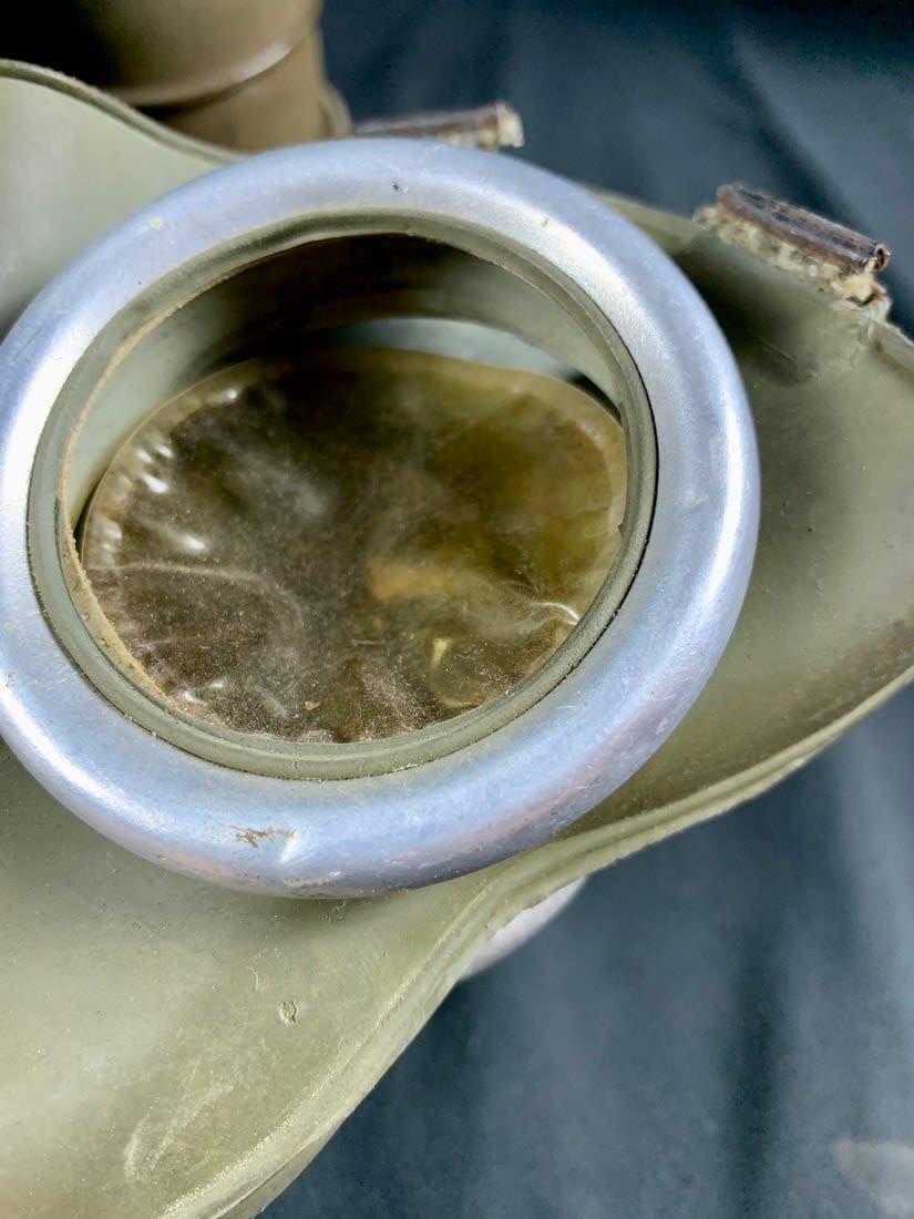 Please note bottom of container is partially torn. lenses of gas mask have started to separate from mask