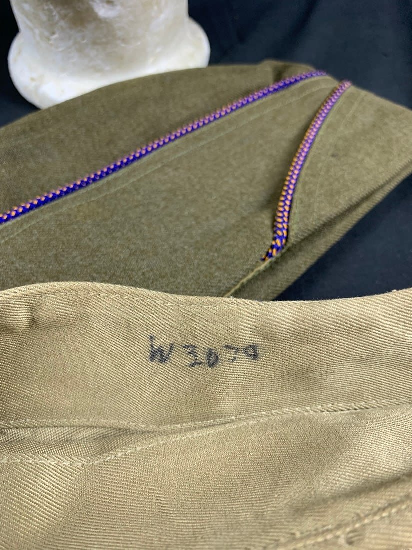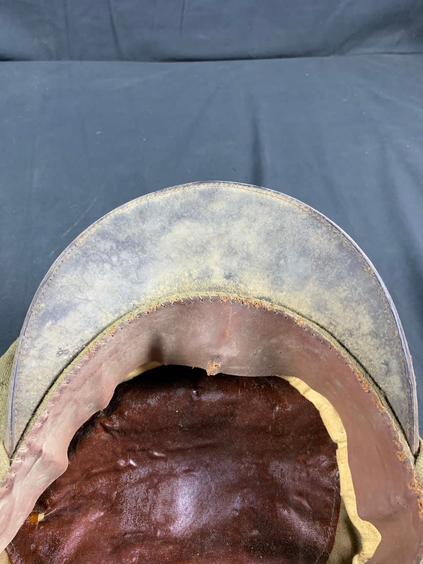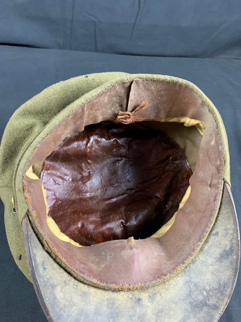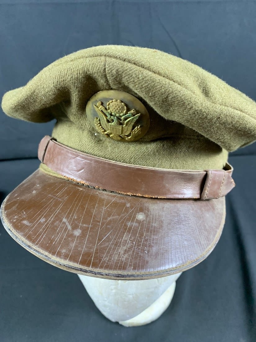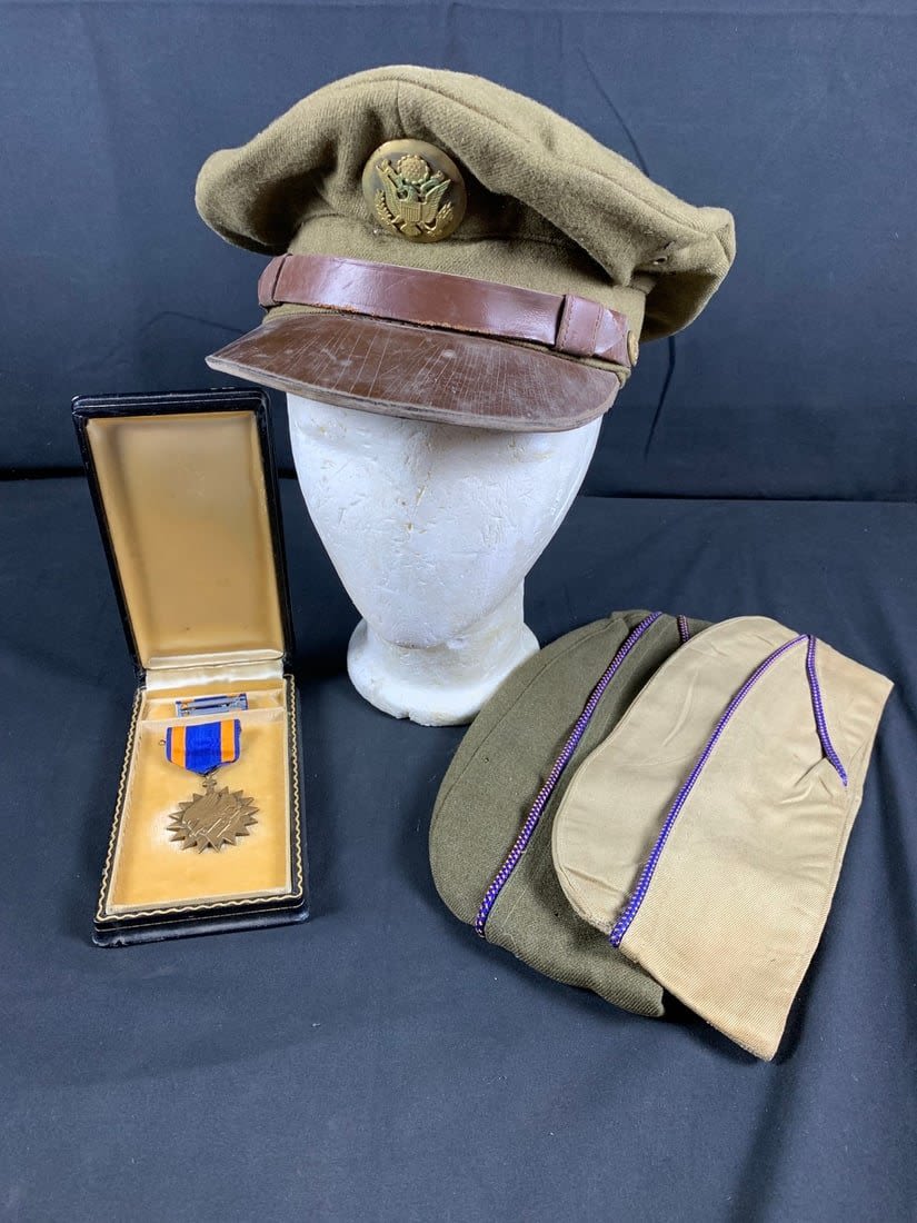 Visor shows moth nips and leather sweatband is stiff. Air medal is not named or numbered. Lot also includes to garrison caps.