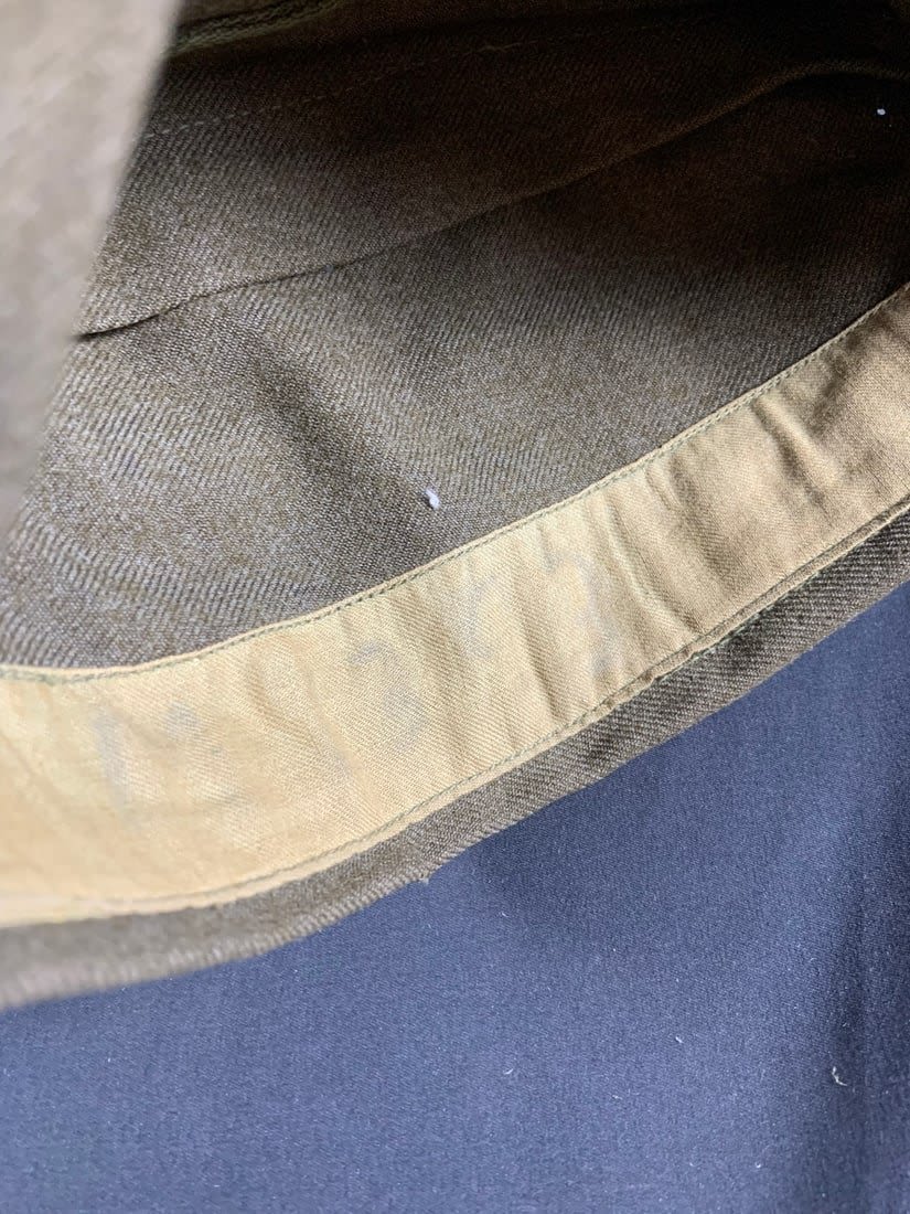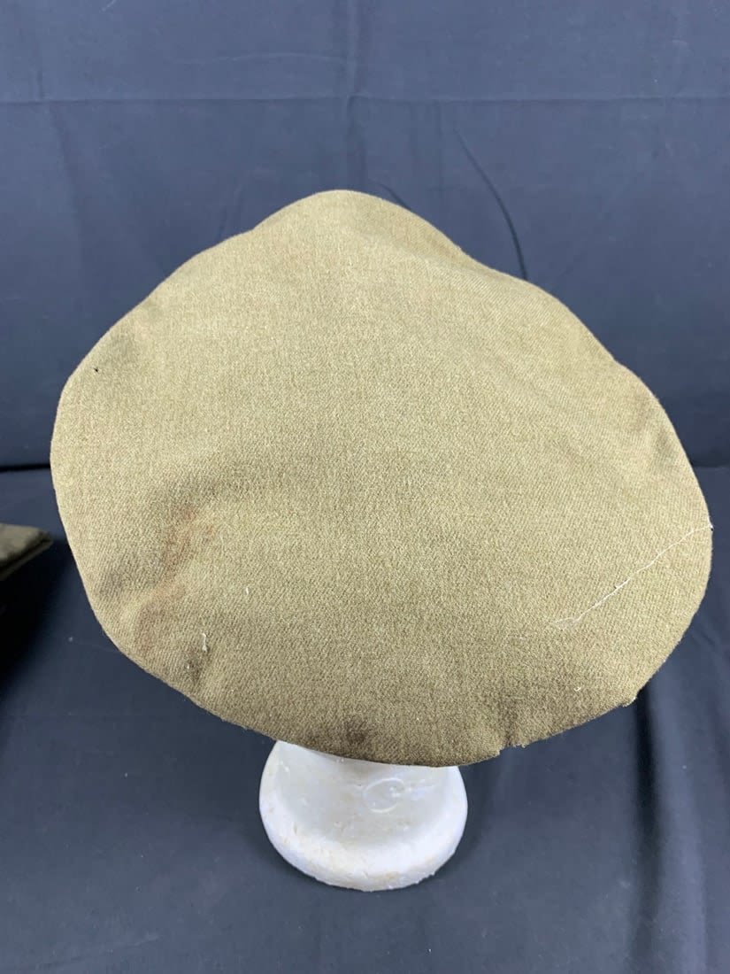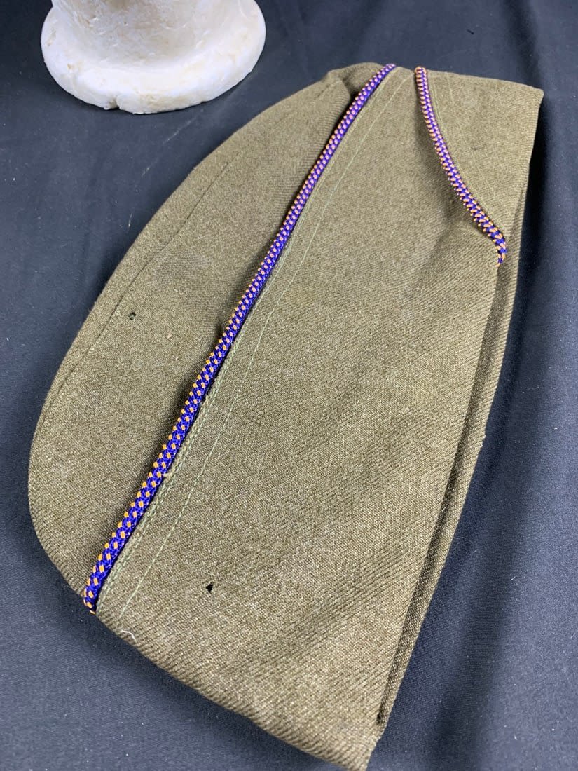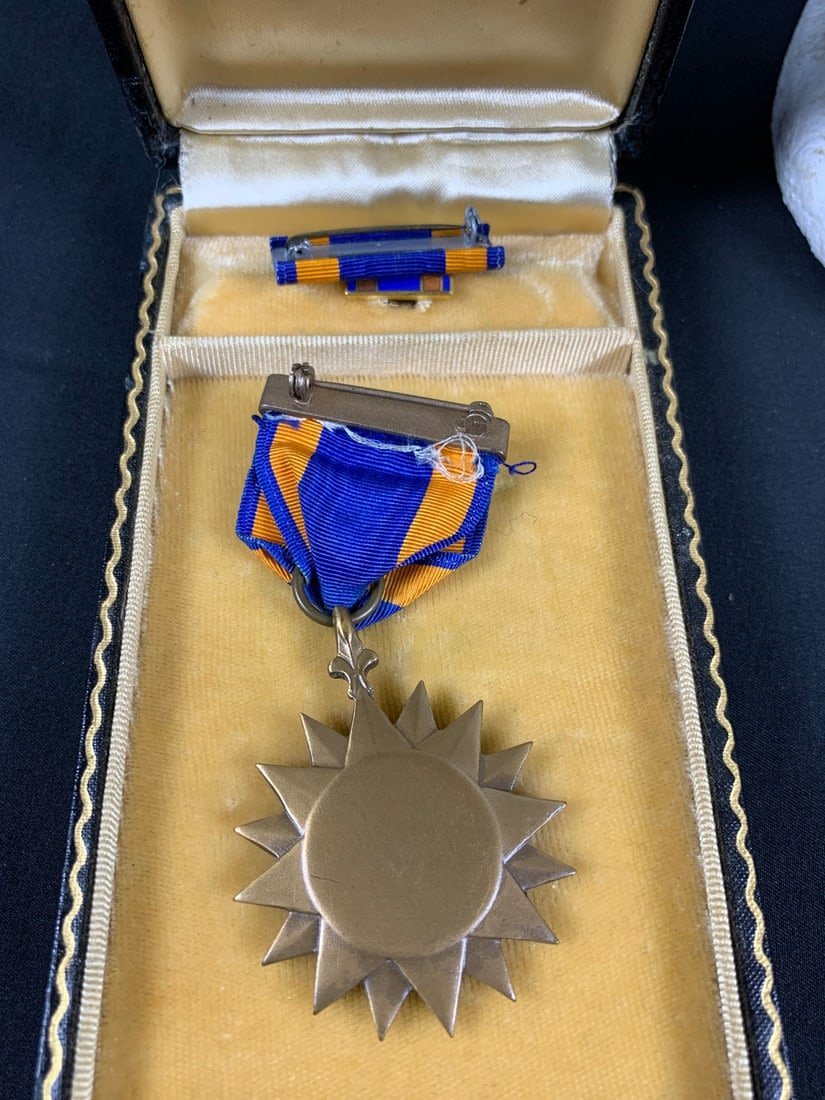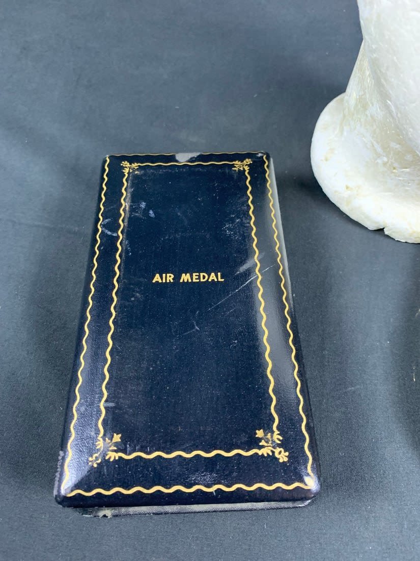 Visor shows moth nips and leather sweatband is stiff. Air medal is not named or numbered. Lot also includes to garrison caps.
