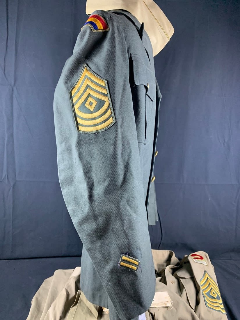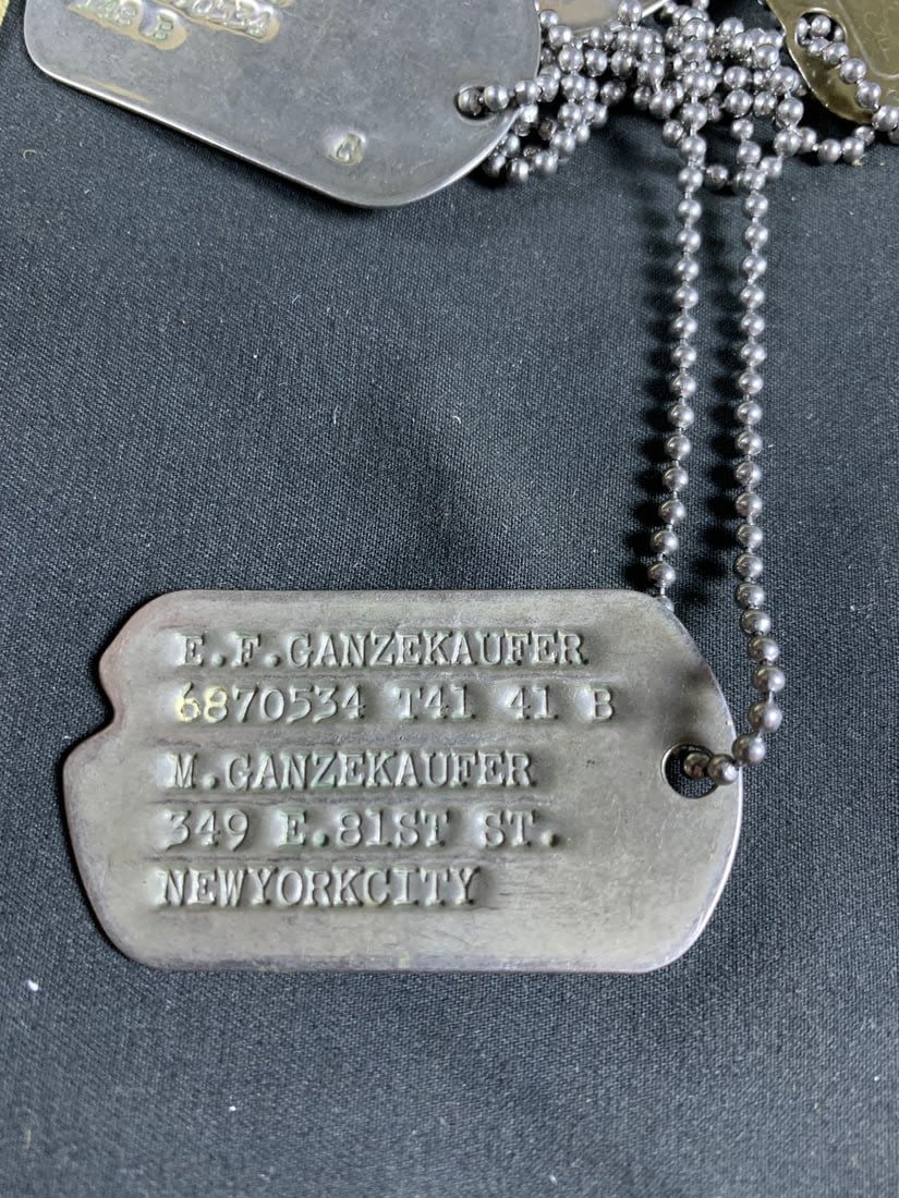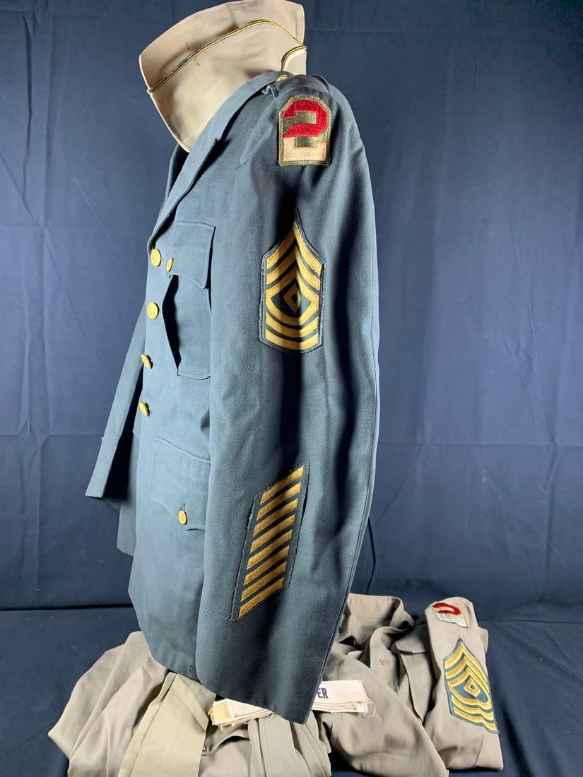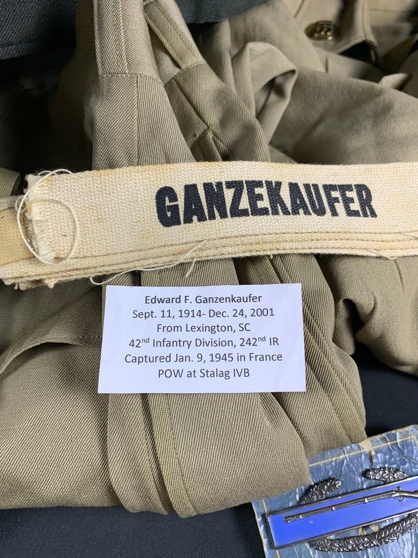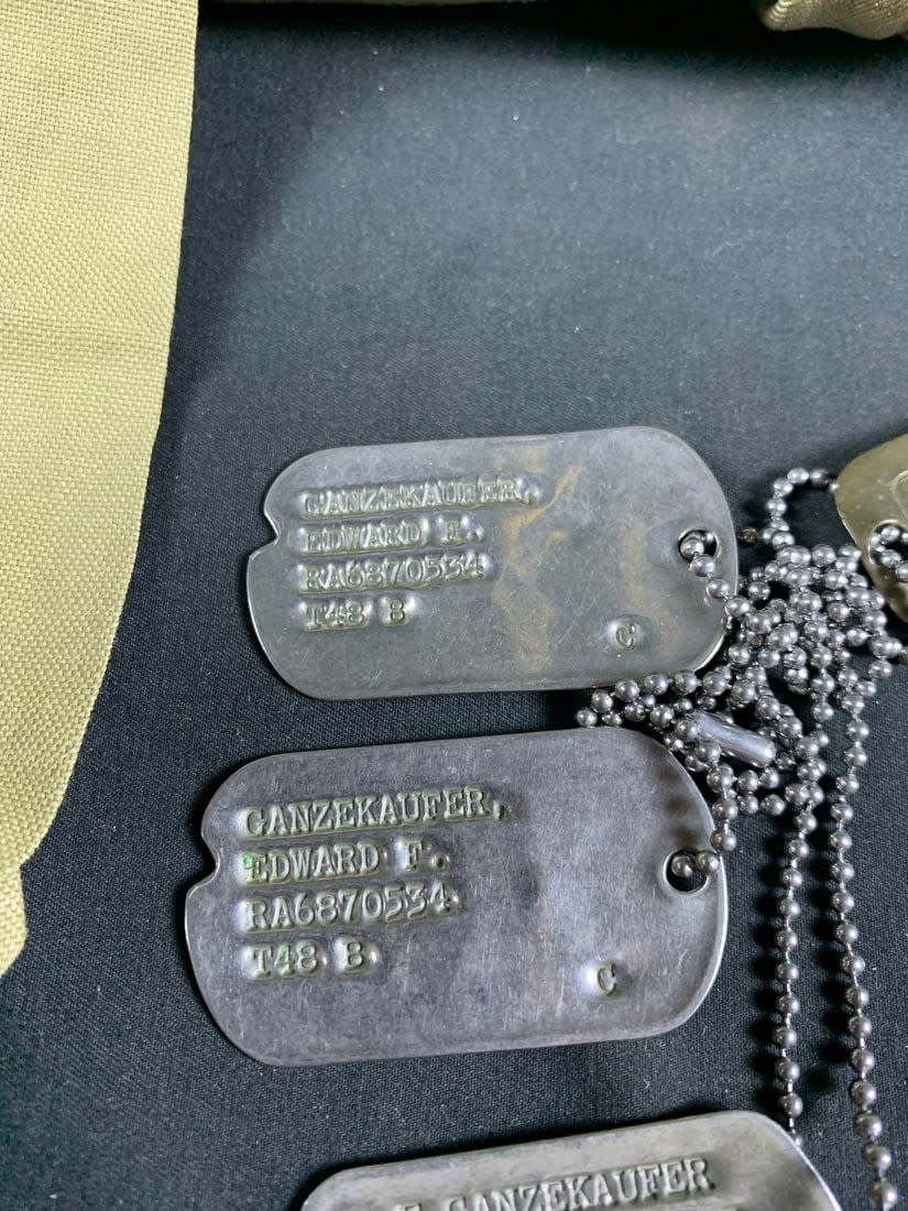 Named to Edward F Ganzekaufer. During WW2 he would become a POW at Stalag IVB. Included in this group is his 1950s dated 4 pocket uniform. Shirt, pant, tie and garrison cap all laundry numbered to him. Original WW2 and Post WW2 dog tags and some extra insignia. Some staining and snags on uniform. No name on jacket.