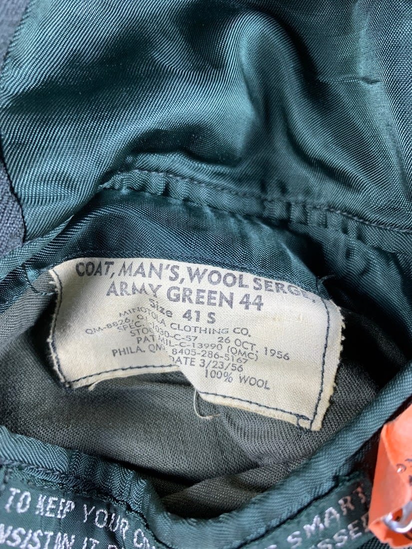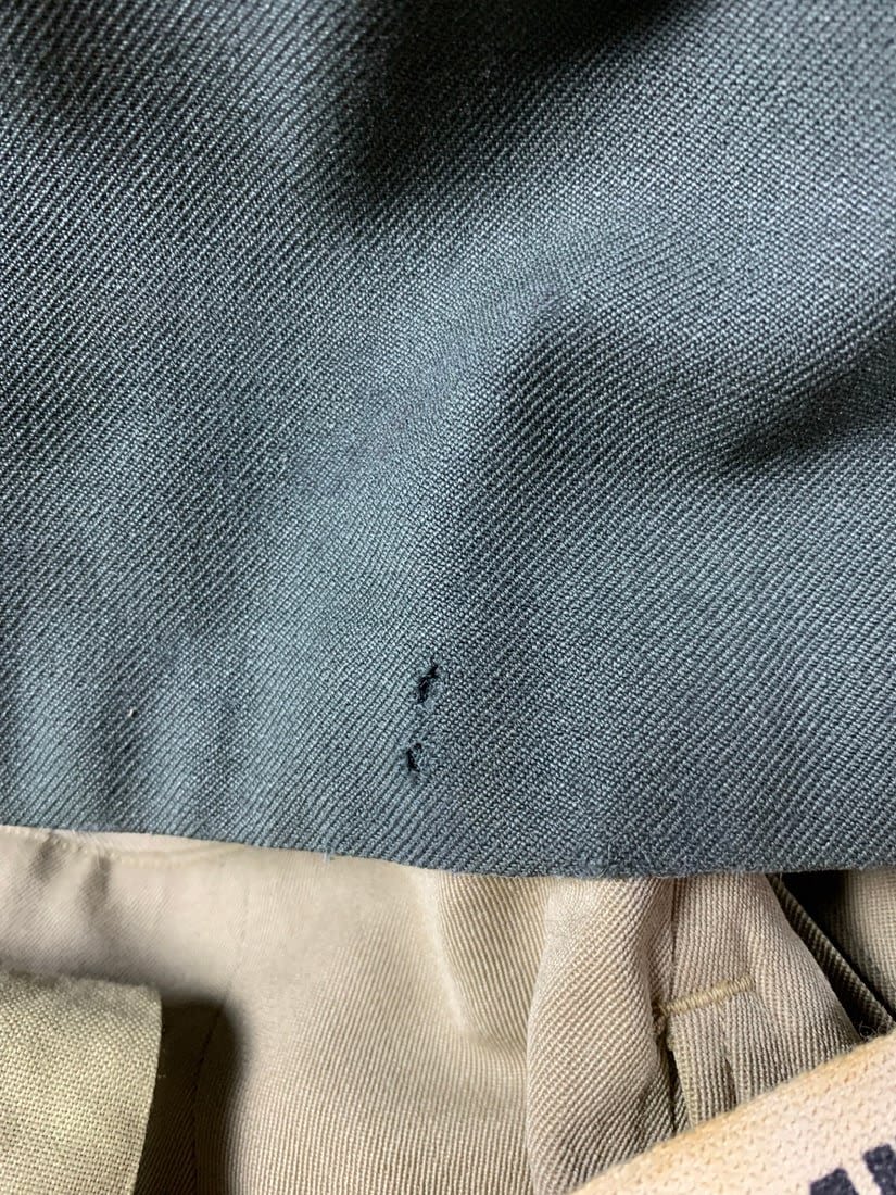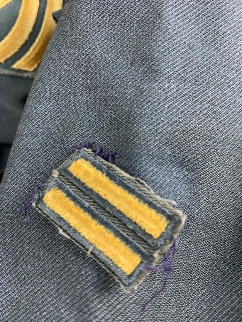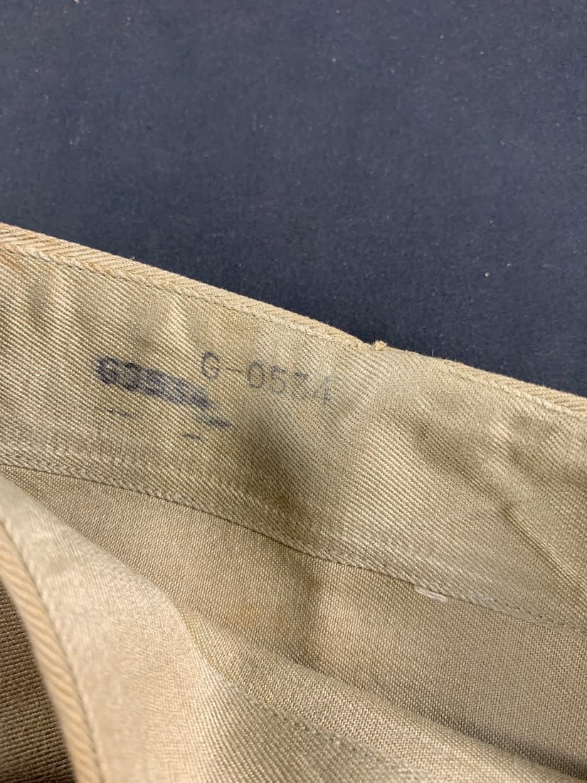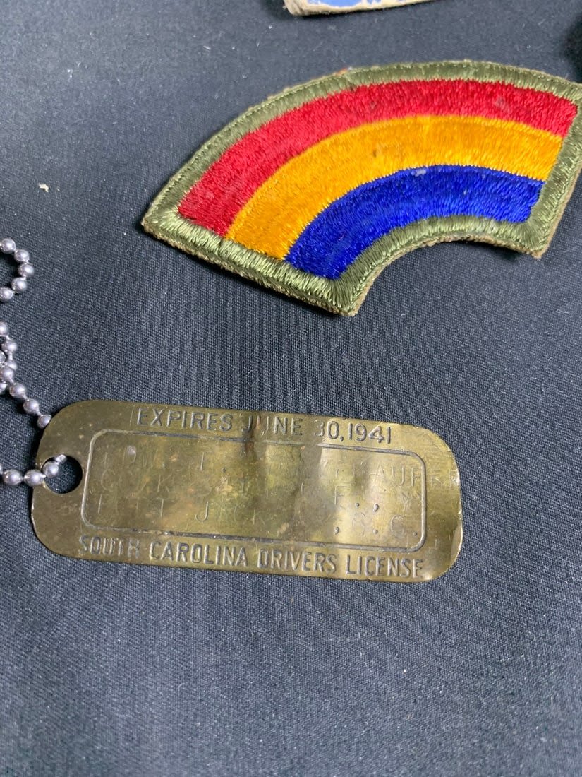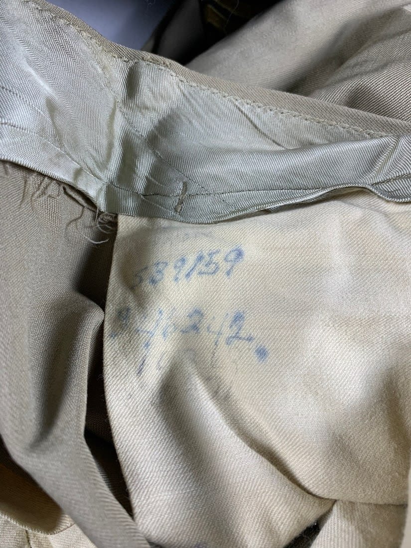 Named to Edward F Ganzekaufer. During WW2 he would become a POW at Stalag IVB. Included in this group is his 1950s dated 4 pocket uniform. Shirt, pant, tie and garrison cap all laundry numbered to him. Original WW2 and Post WW2 dog tags and some extra insignia. Some staining and snags on uniform. No name on jacket.