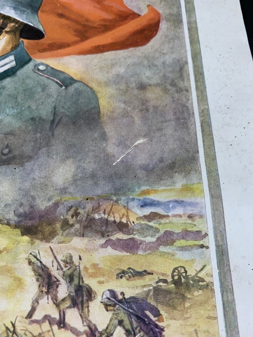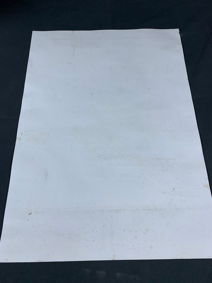 Roughly 12"x17". Light staining and scratches on artwork on right side