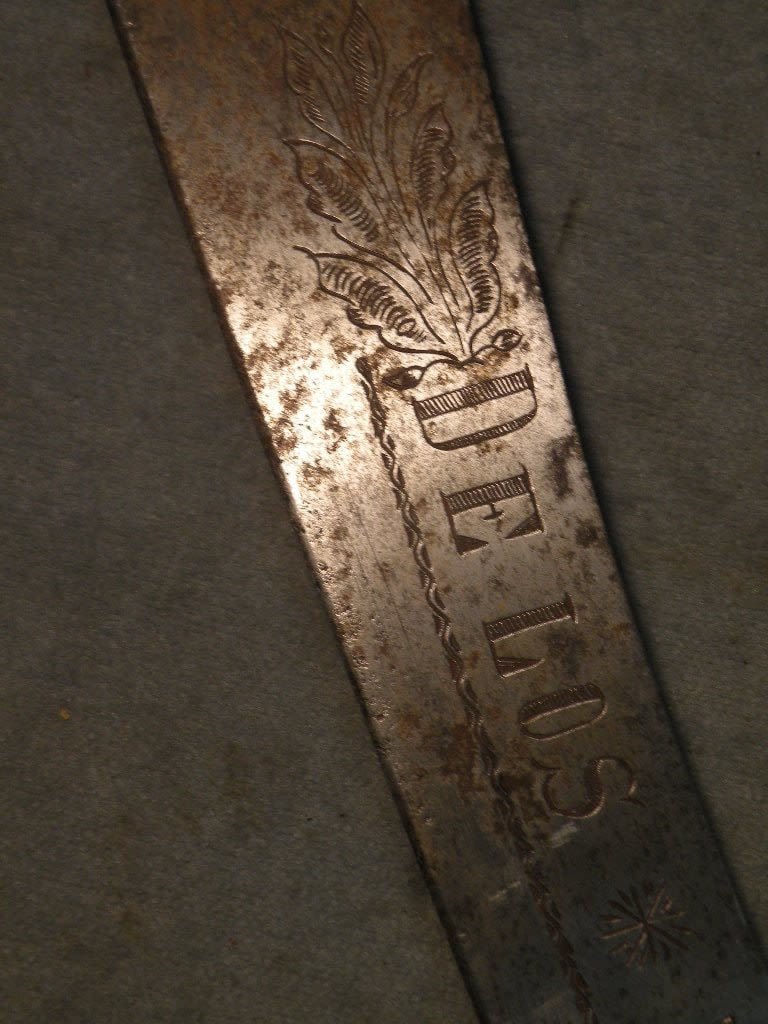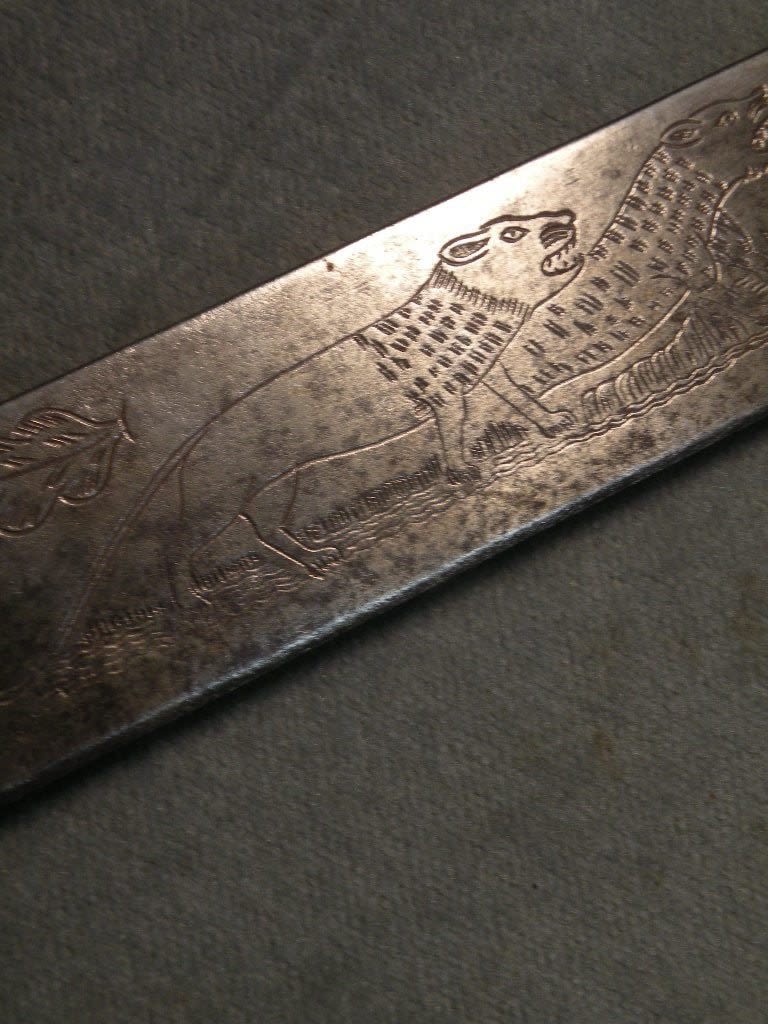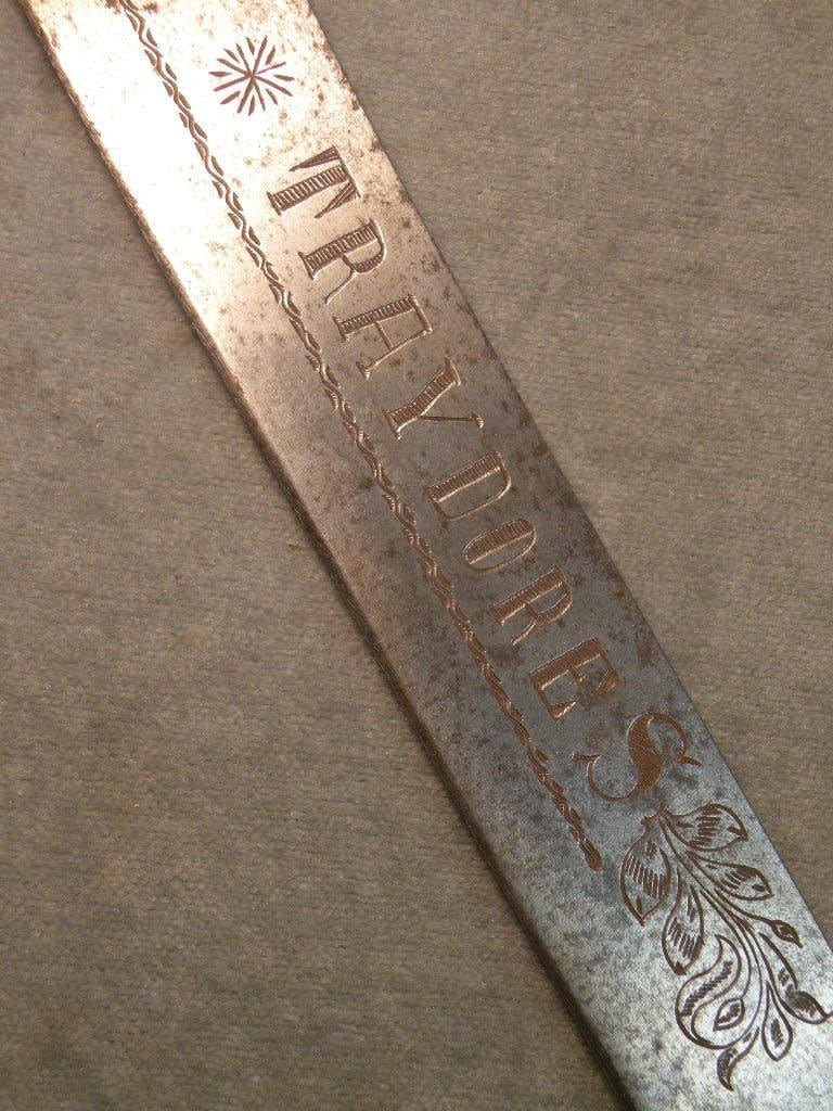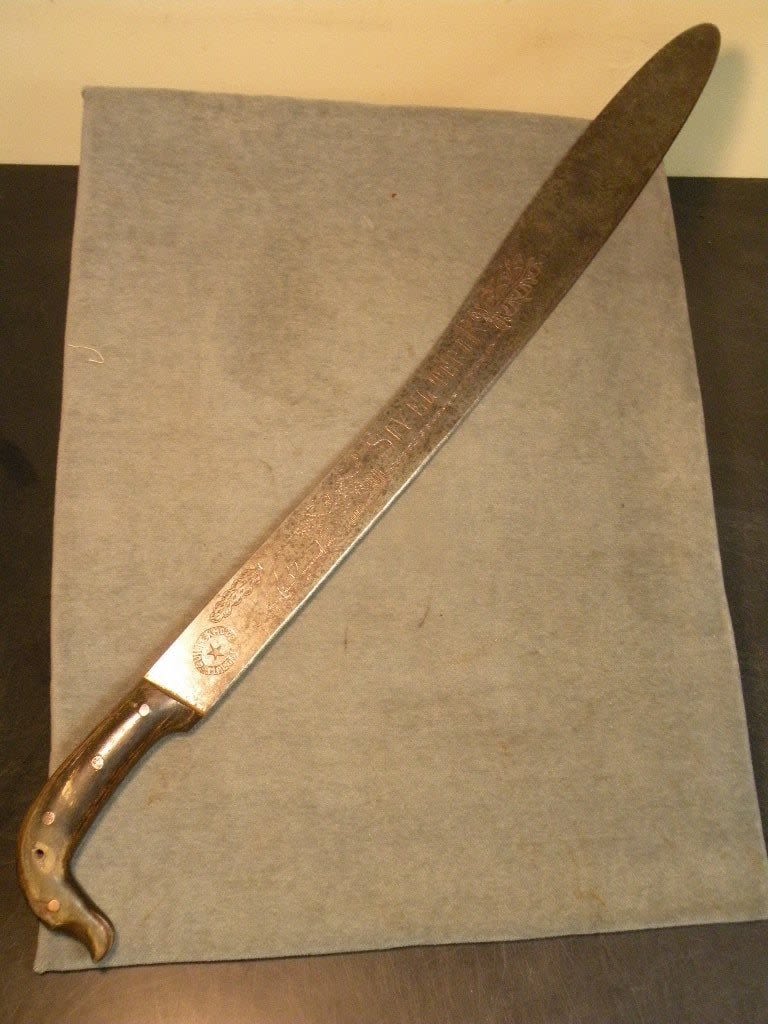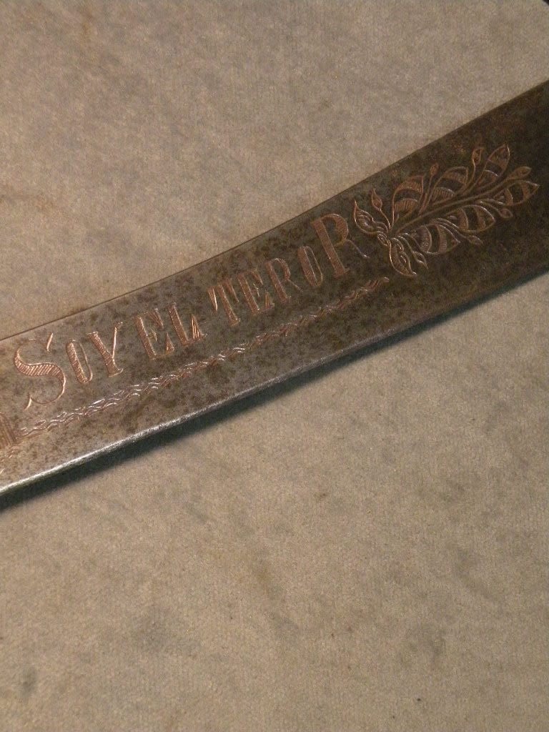 Phenomenal Mexican Revolution, Punitive Expedition, machete with bold engraved a wild lion like creatures with the slogan "Soy el Teror De Los Traydores" which loosely translates "Death to the Traitors". It is unclear if this was carried by Government supporters referring to Pancho Villa’s men as the "traitors" or if it was carried by one of Villa’s men who looked upon the men supporting President Caranza as traitors. One of the most interesting Mexican Revolution its I have ever seen.