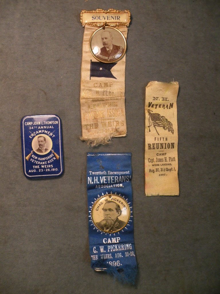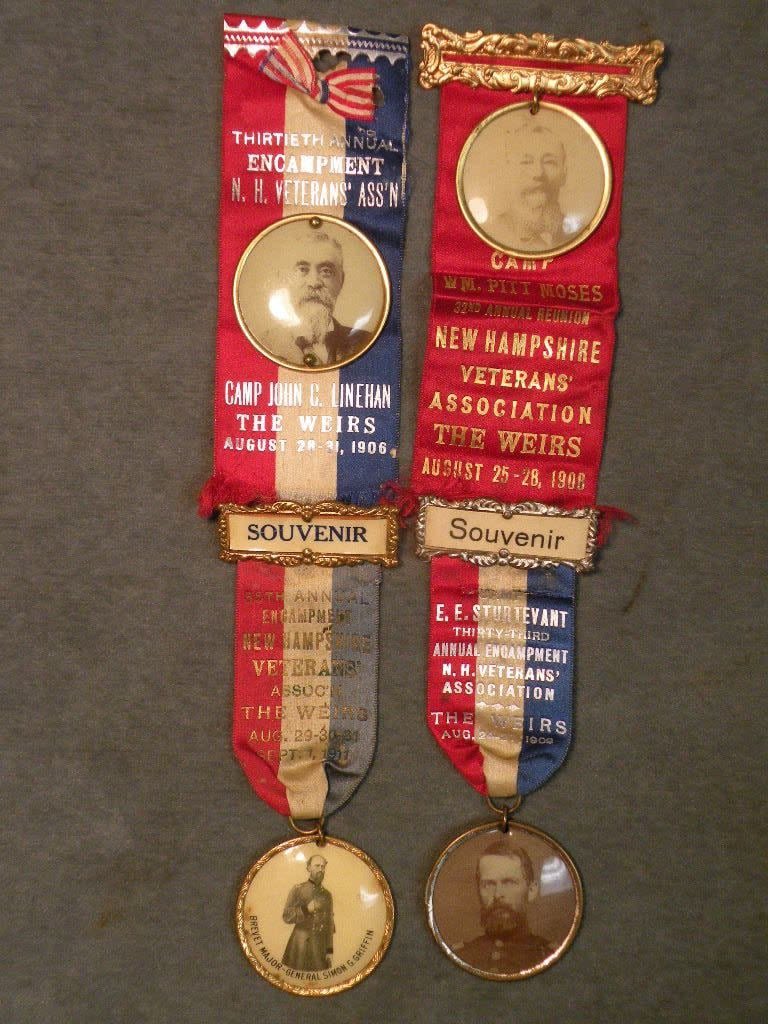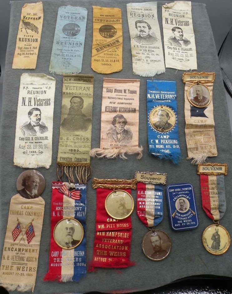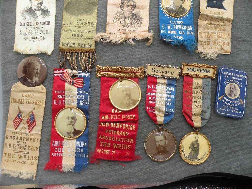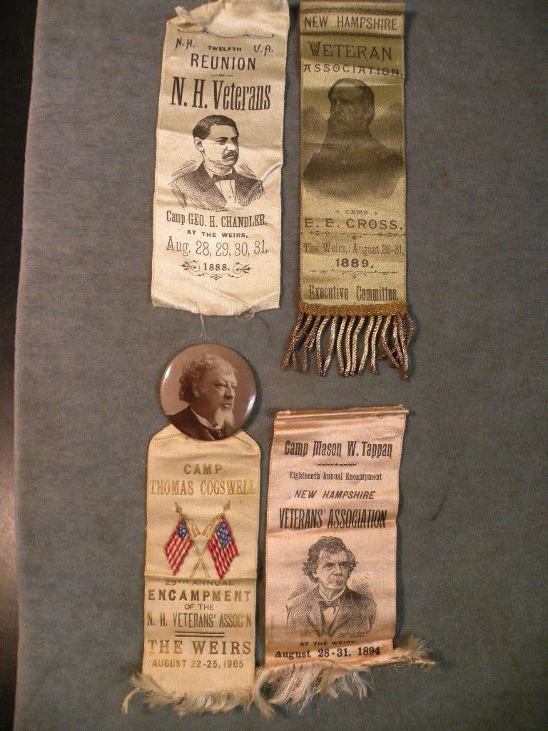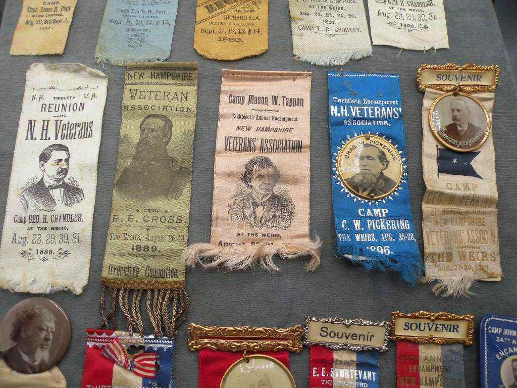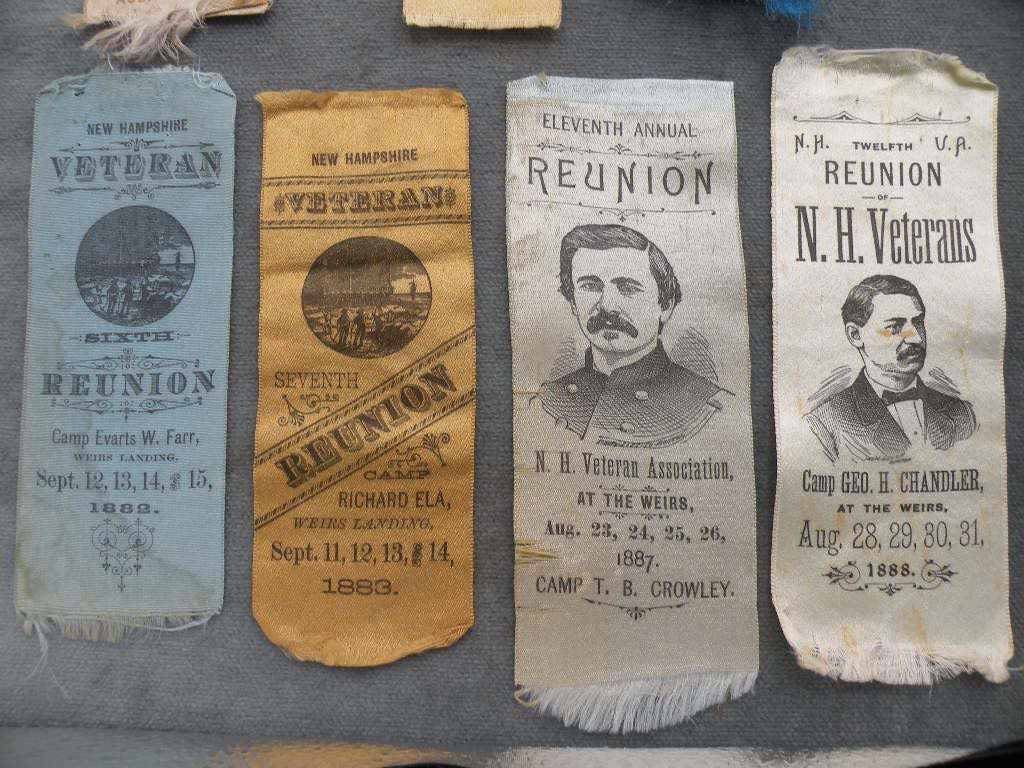Selection of 16 different Civil War Veterans Reunion Ribbon. Each year the regiments would come together at Weirs Beach in Laconia, New Hampshire where they had a large dedicated compound with Regimental Houses, amphitheater, mess hall and more. Unique in the world of GAR state Reunions.
