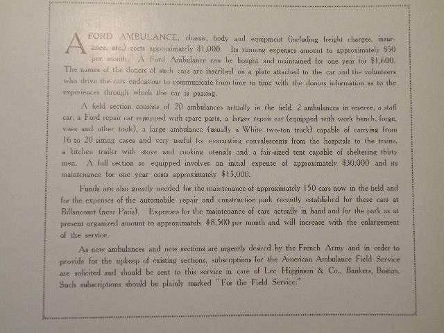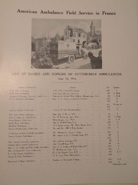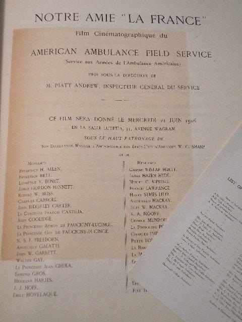 Very scarce large format American Field Service film program from the French premier, of their Fund Raising film. This film was then used all over the US to raise funds. This program also contains the list of Ambulances and donors as of the date of the film, 1916. Some discoloration from the insert to one page and the inside cover and some margin stains.