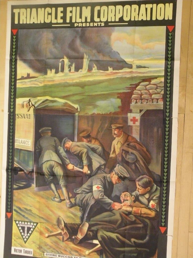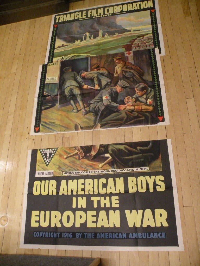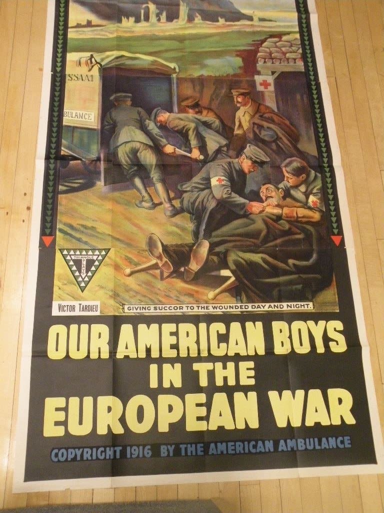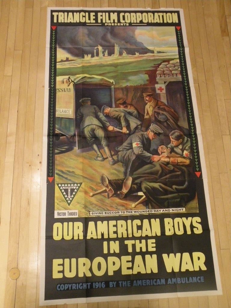 Extremely rare WW1 poster for the American Field Service fund raising film, "Our American Boys in the European War". This 3 sheet poster is unused and measures a bit over 7 feet in height when assembled. Some fold splits and some edge wear at the very top, otherwise excellent overall. Needs to be mounted. I believe there are only 4 of these in existence.