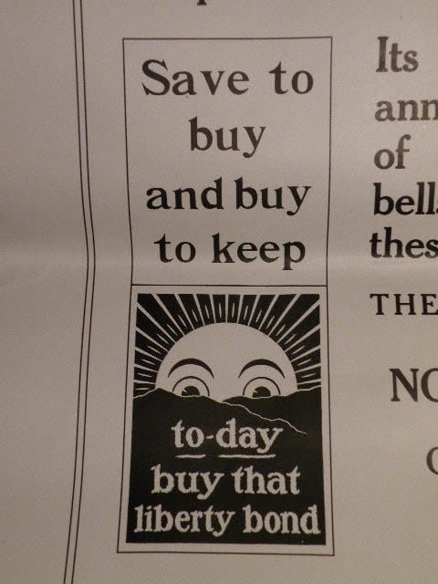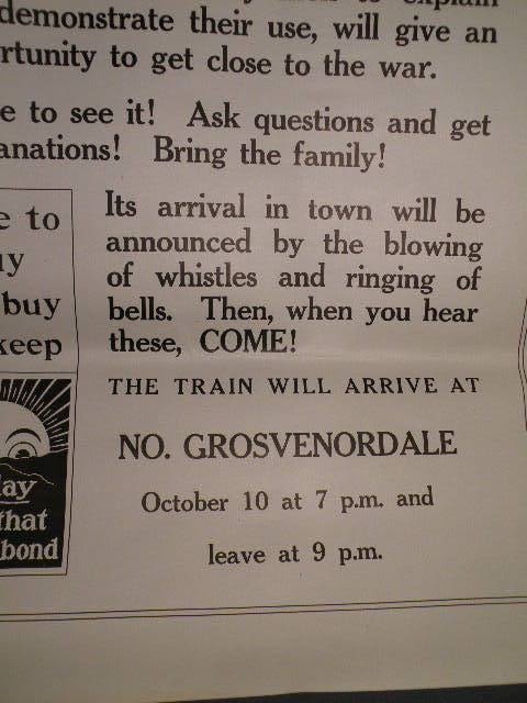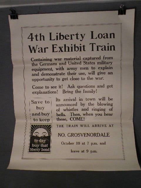 WWI Poster for the "War Exhibit Train" which was a train loaded with captured weapons, uniforms and insignia. The train exhibit was used as a fund raising tool for the 4TH Liberty Loan. Approx 22 x 28 inches.
