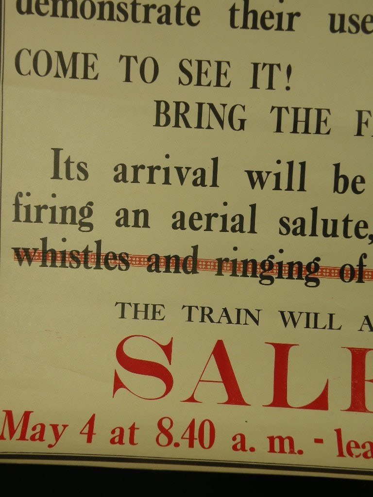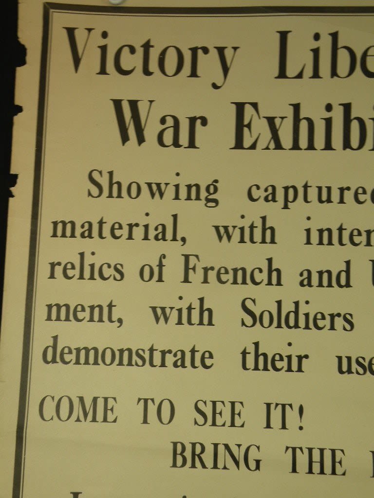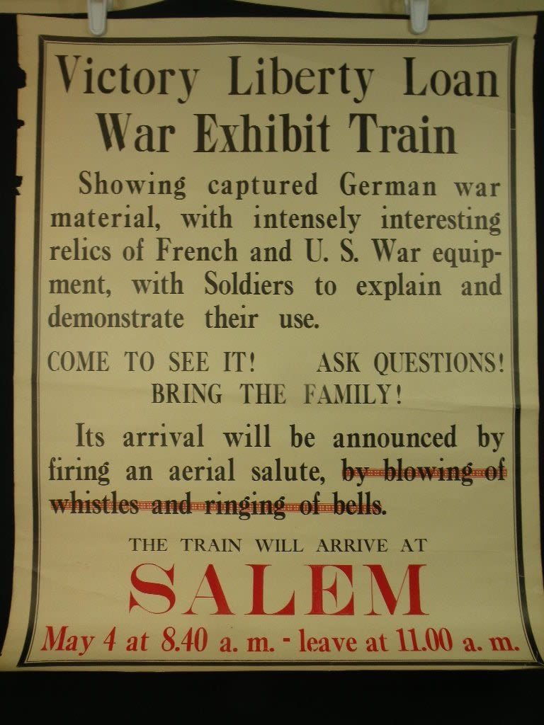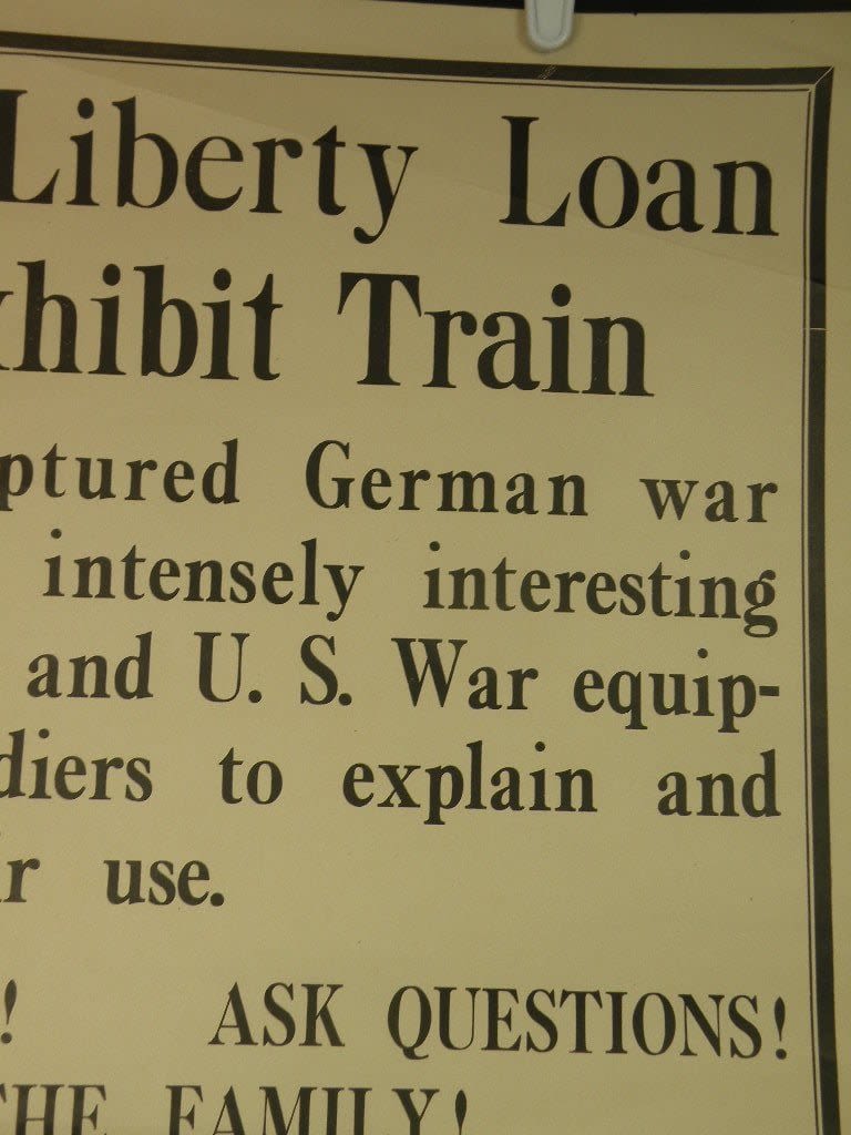 Scarce WWI Liberty Loan War Train Poster. This train carried captured souvenirs and would stop in various cities. The train was a traveling museum and the money paid would go to the Liberty Loan. A couple of tears, easily mended. The chipping to the upper left will be covered when framed. Approx 22 x 28 inches.