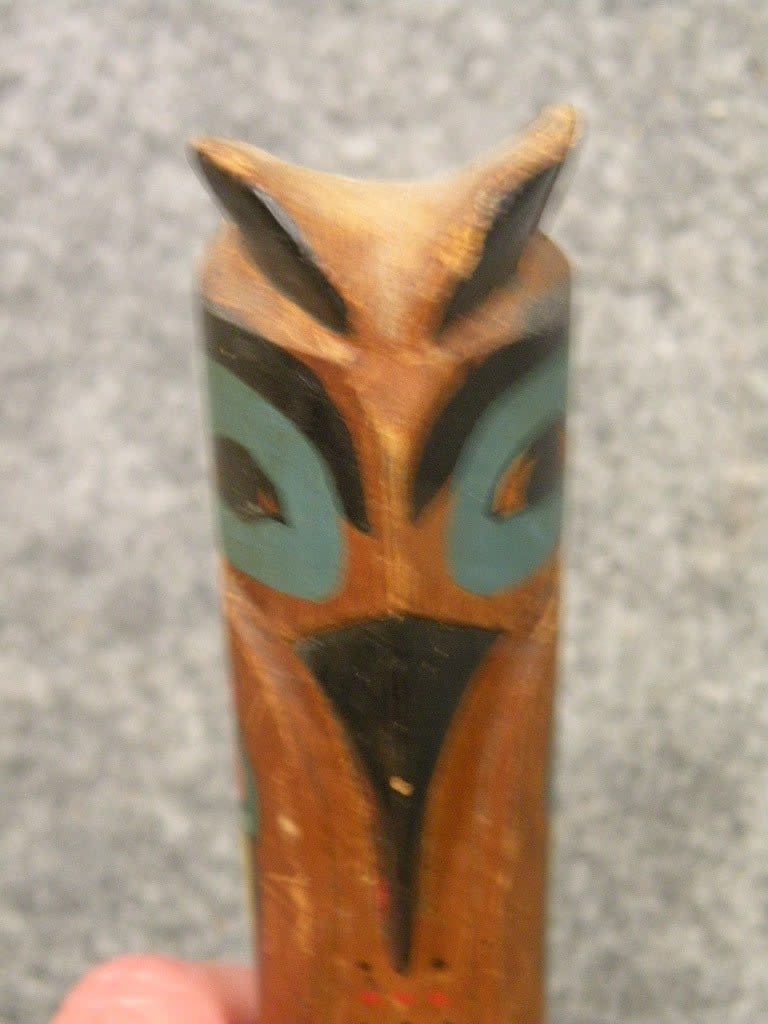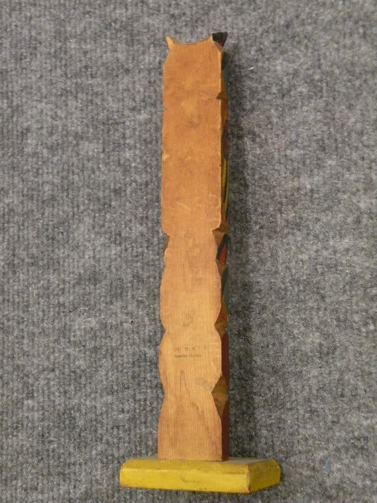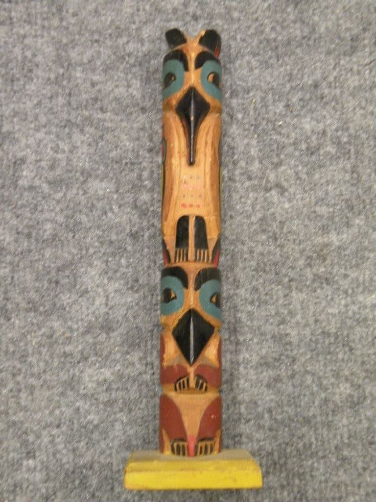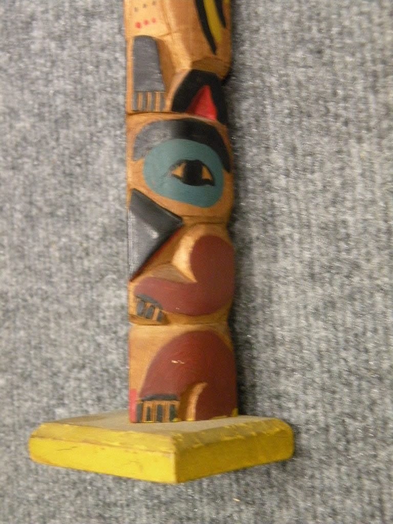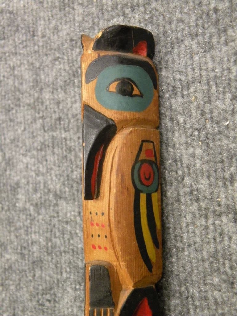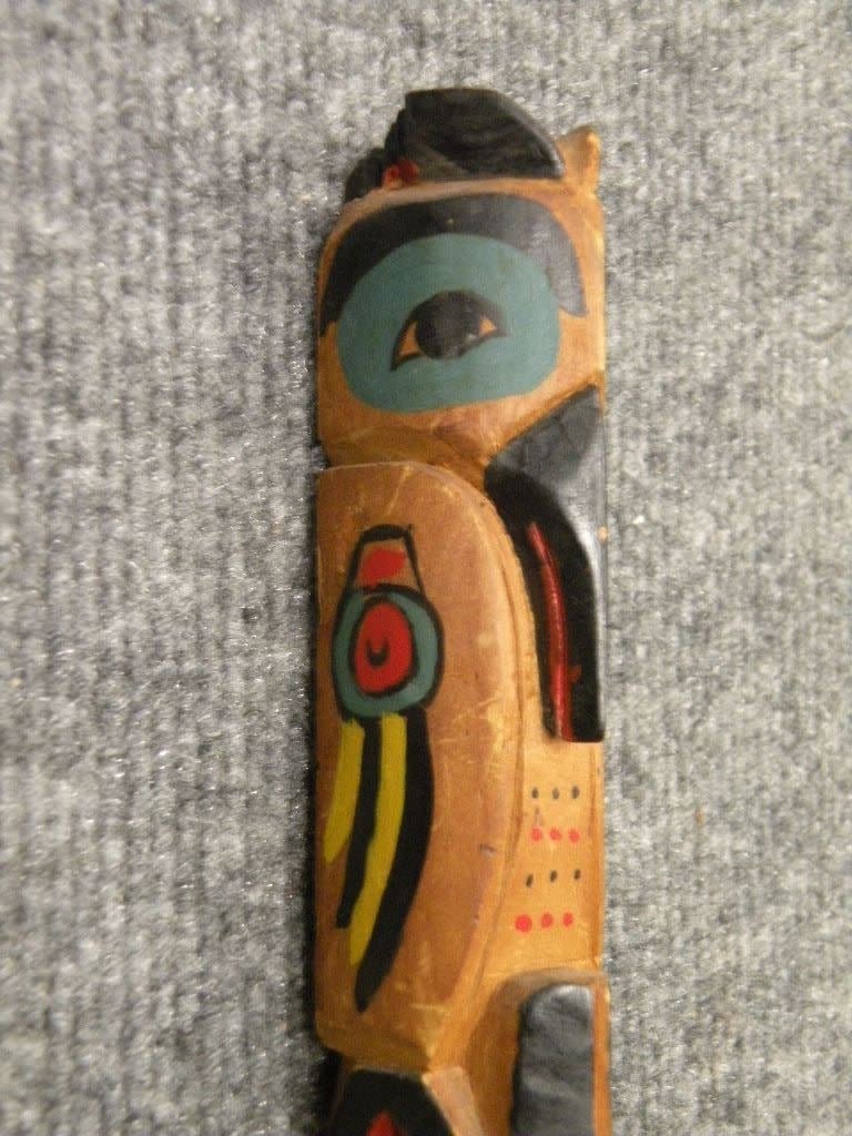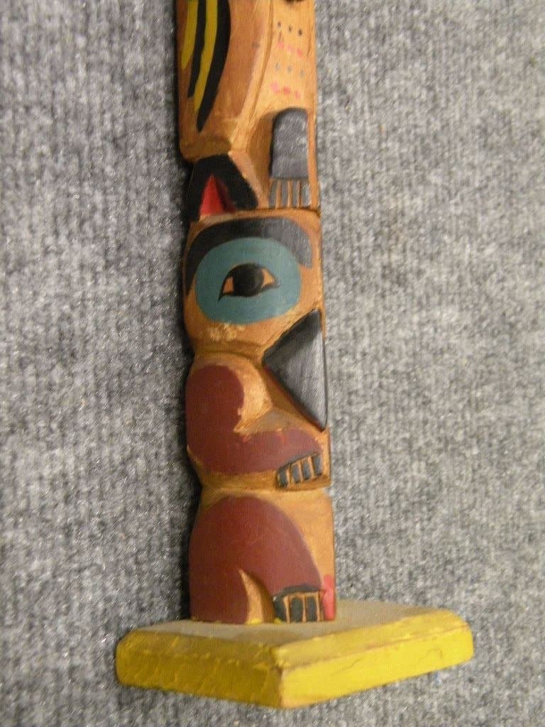 Carved and painted Northwest Coast Totem Pole model. 10 inches in length. Dates to the 1930s-40s