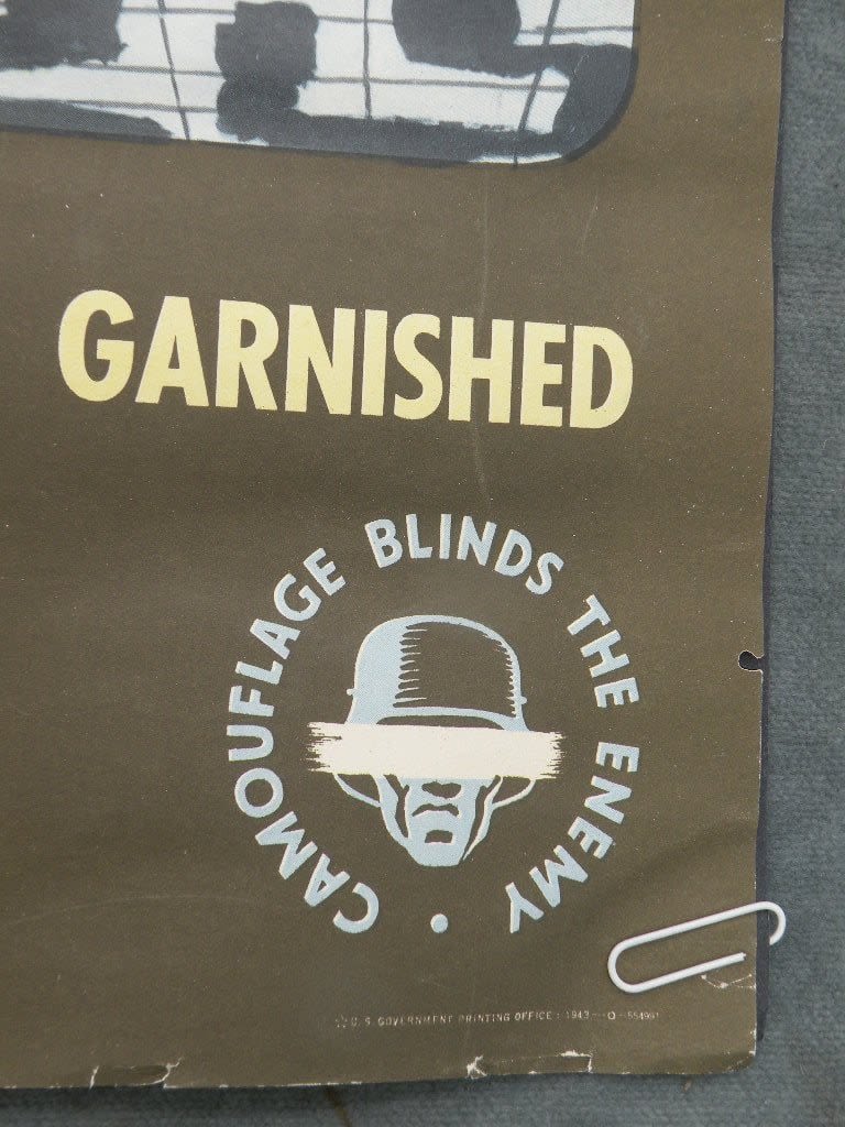 Very unusual 21 x 13 inch WW2 Camouflage related War Info poster. Some edge chipping and tears as shown.