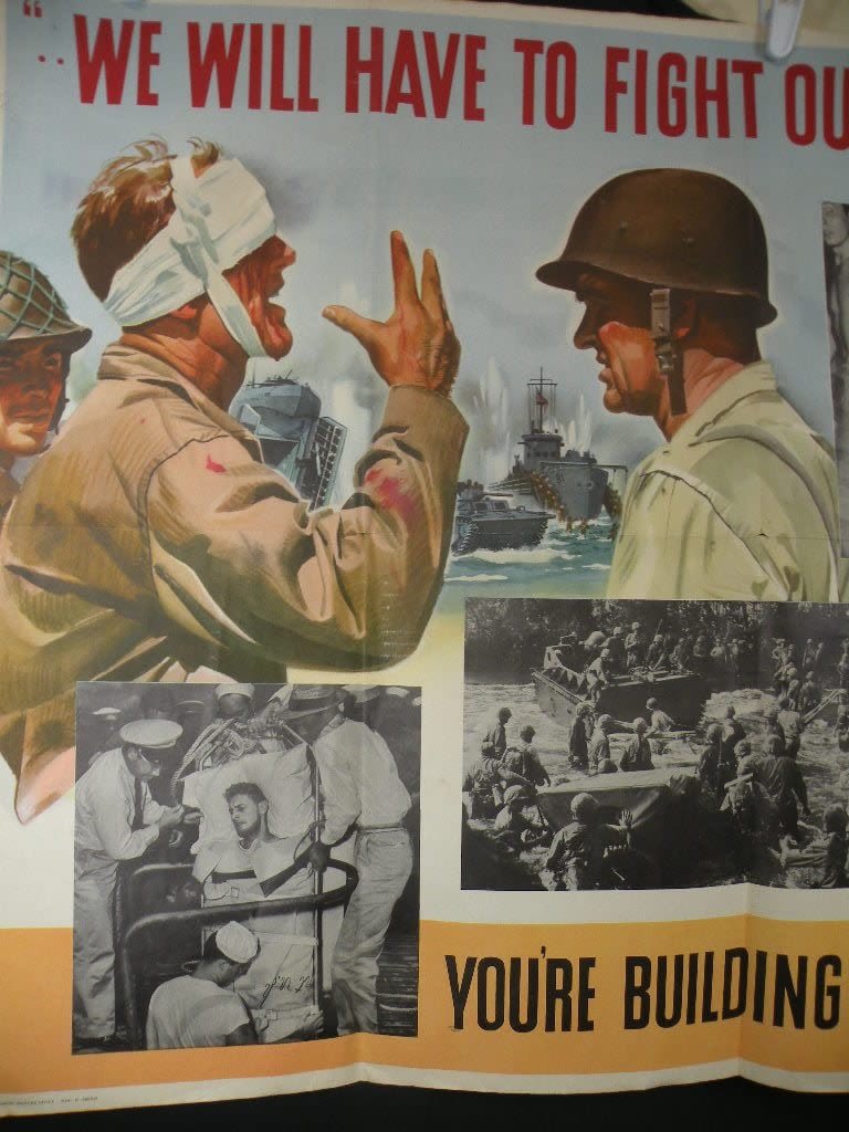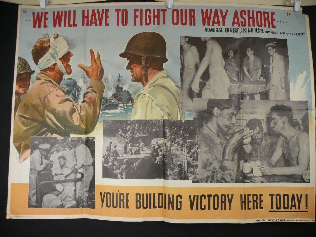 WW2 poster showing Naval Amphibious activities. Measures 28.5 x 39.5.