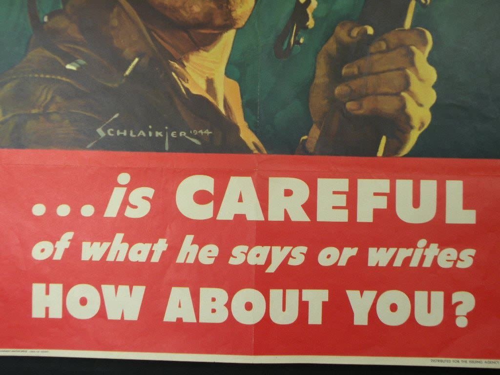 Very nice WW2 propaganda poster designed to keep people from talking about sensitive subjects. 19.5 x 27.5 inches.