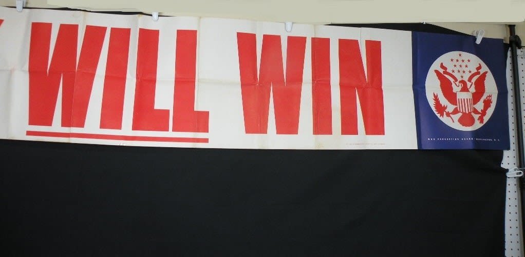 HUGE!! 1942 dated "Work Will Win" factory propaganda banner. Measures an amazing 10 feet in length by 17 inches.