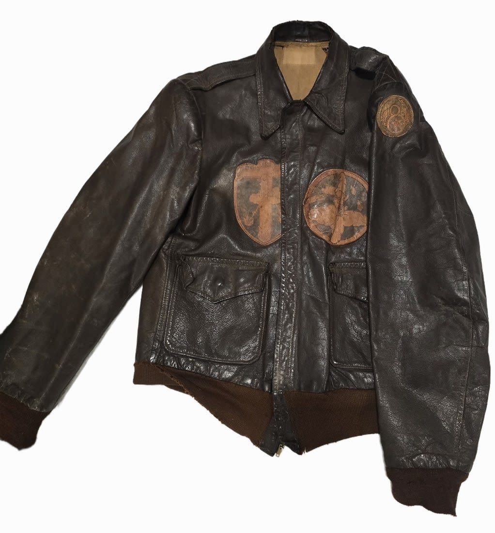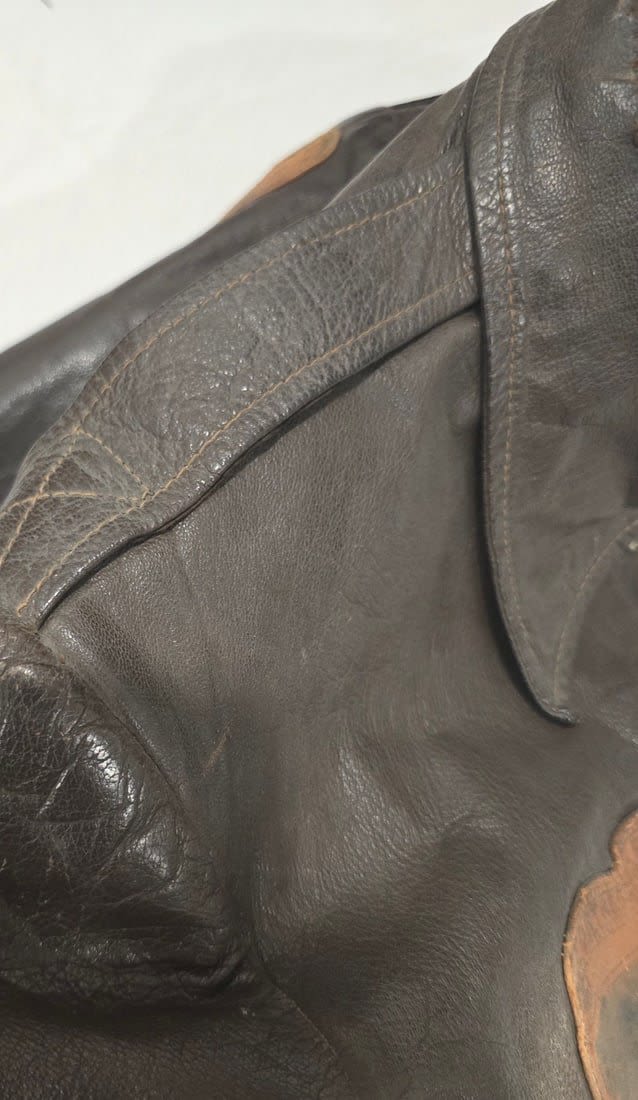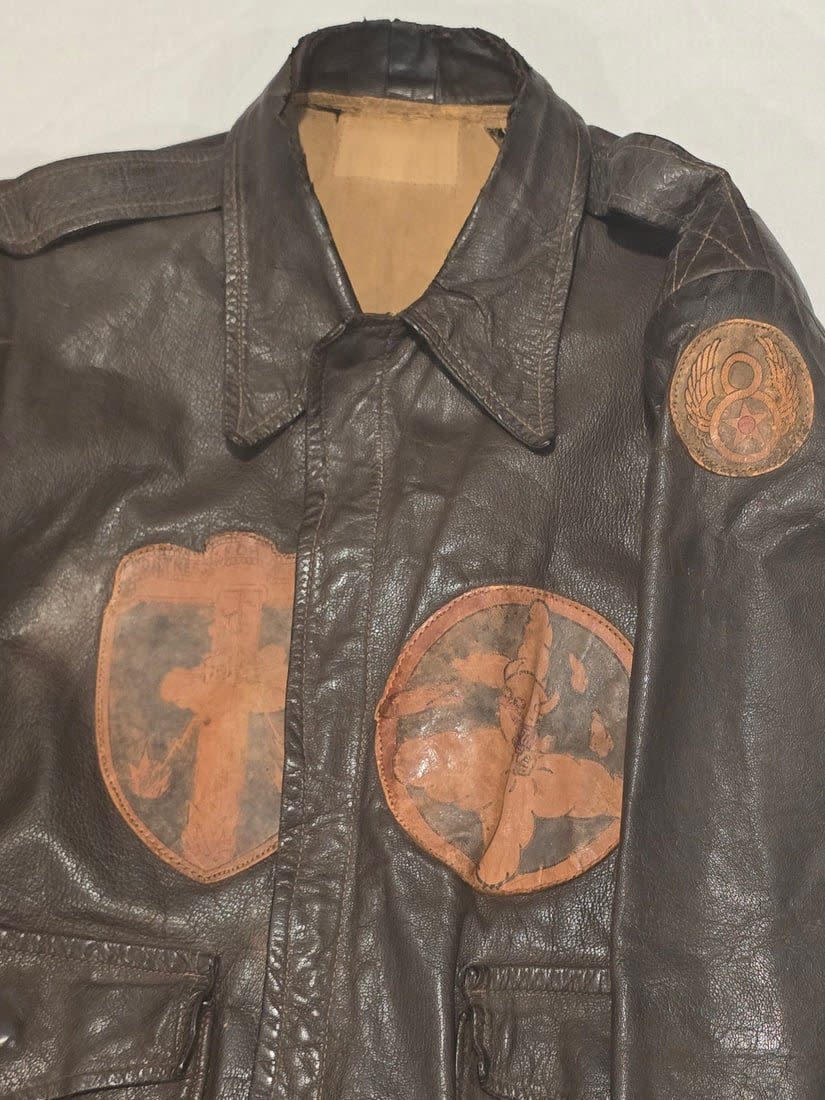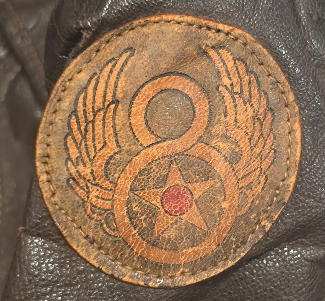 Double-patched Original 8th AAF A-2 Jacket. Beautiful A2 from the 388th Bomb Group 560th Bomb Squadron 3 patched A2, all original. Leather is in amazing condition with not rips or tears. If someone wanted to add some conditioner to it it might soften the leather more, but it currently does not crack or have issues when moving it. Patch has a Gremlin Gus on it. Small fraying on cuffs, and interior lining is well used. The tag was removed well prior to owning jacket, not sure when. Was not identified.