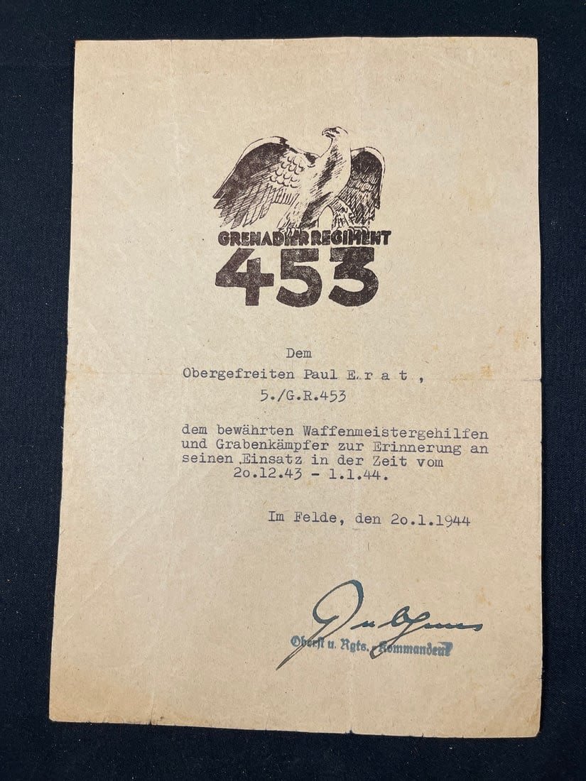 Unit awrd document given for fighting during Christmas 1943 around Bobruisk. Quite scarce. Well-researched.
