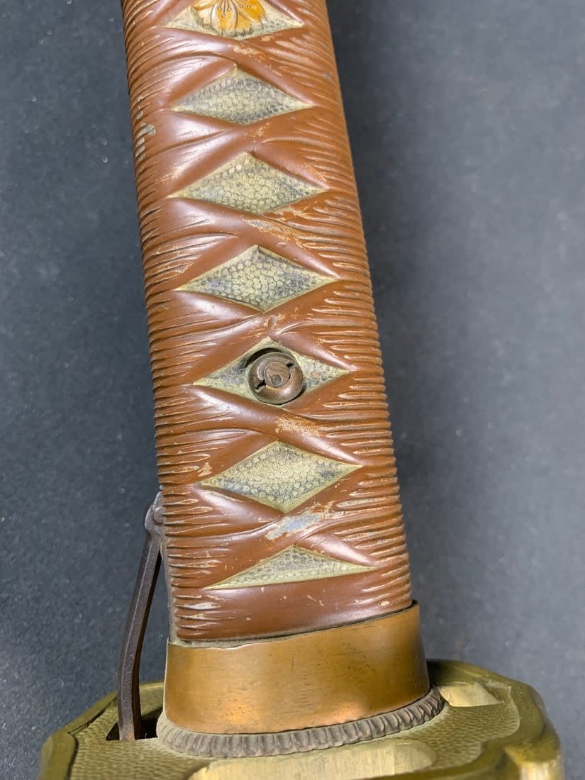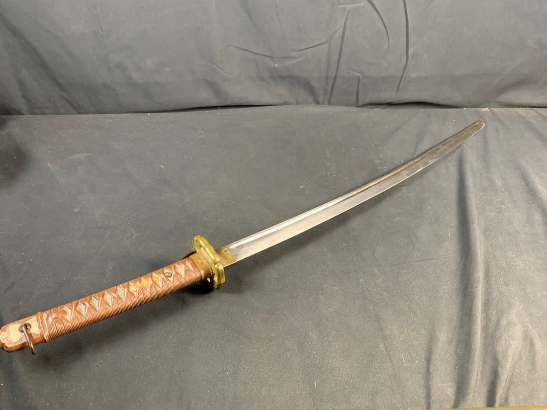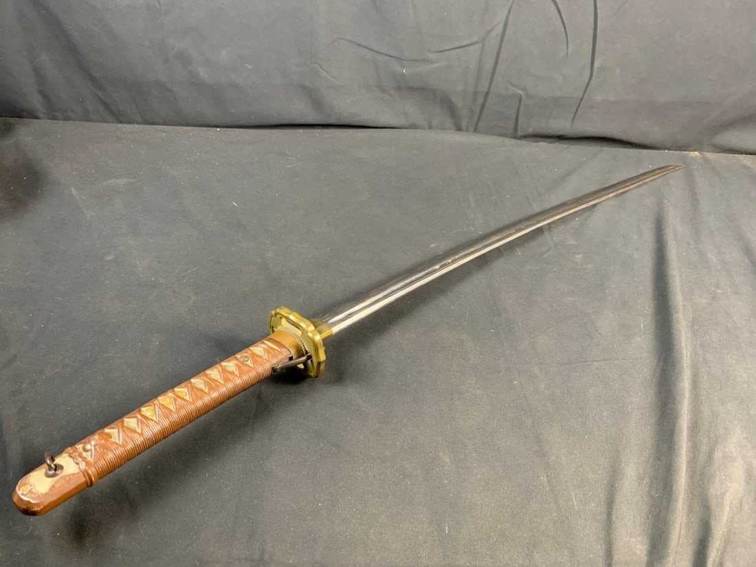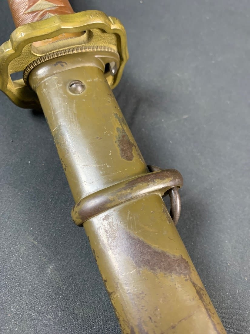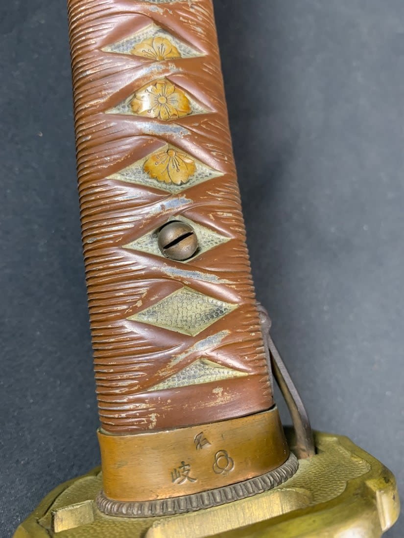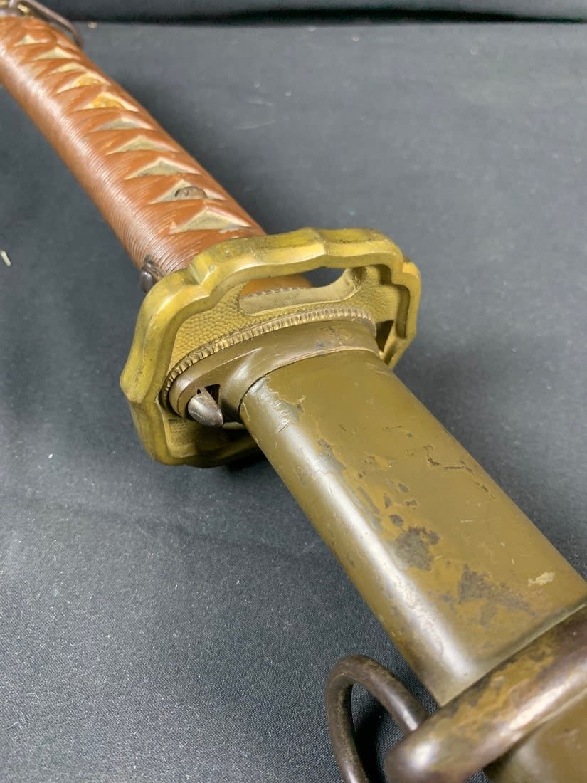 WW2 Period Japanese army NCO Gunto Sword. The aluminum handle shows service wear with some of the brown paint missing. The fuchi hilt collar bears the mark of the kokura arsenal as well as nagoya inspection stamp and the Gifu Sword Company Makers mark.The positioning of the serial number on the sword blad indicaties this blad was manufactured at the nagoya arsenal but produced under the kokura arsenal administration.The blade and Scabbard have Matching Serial numbers. Blade has spots of grey but no chips or active rust.