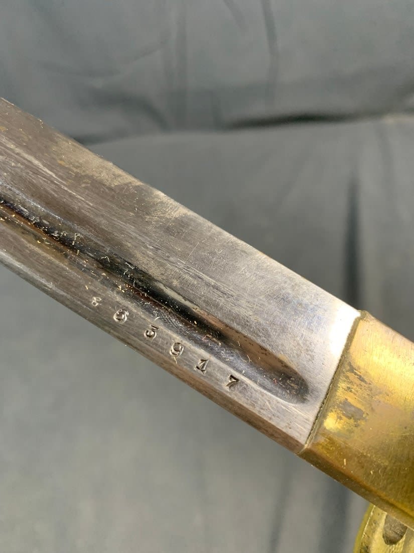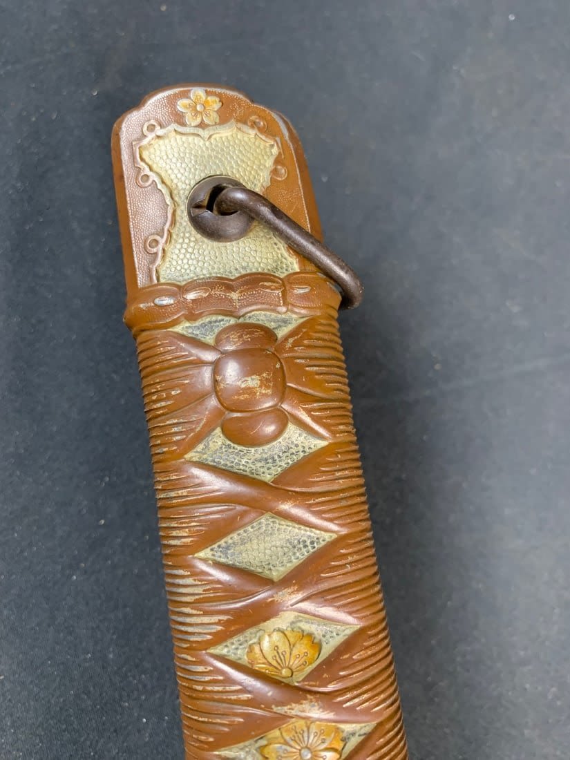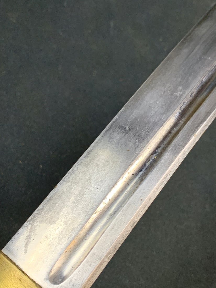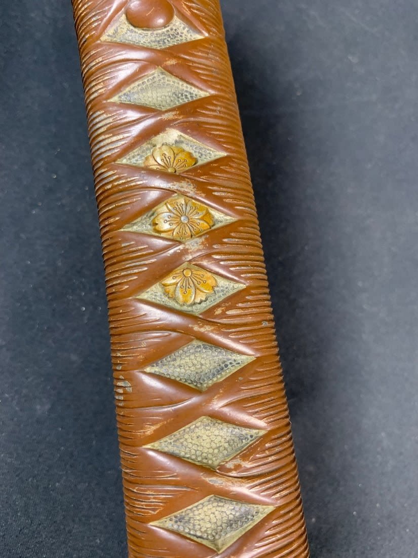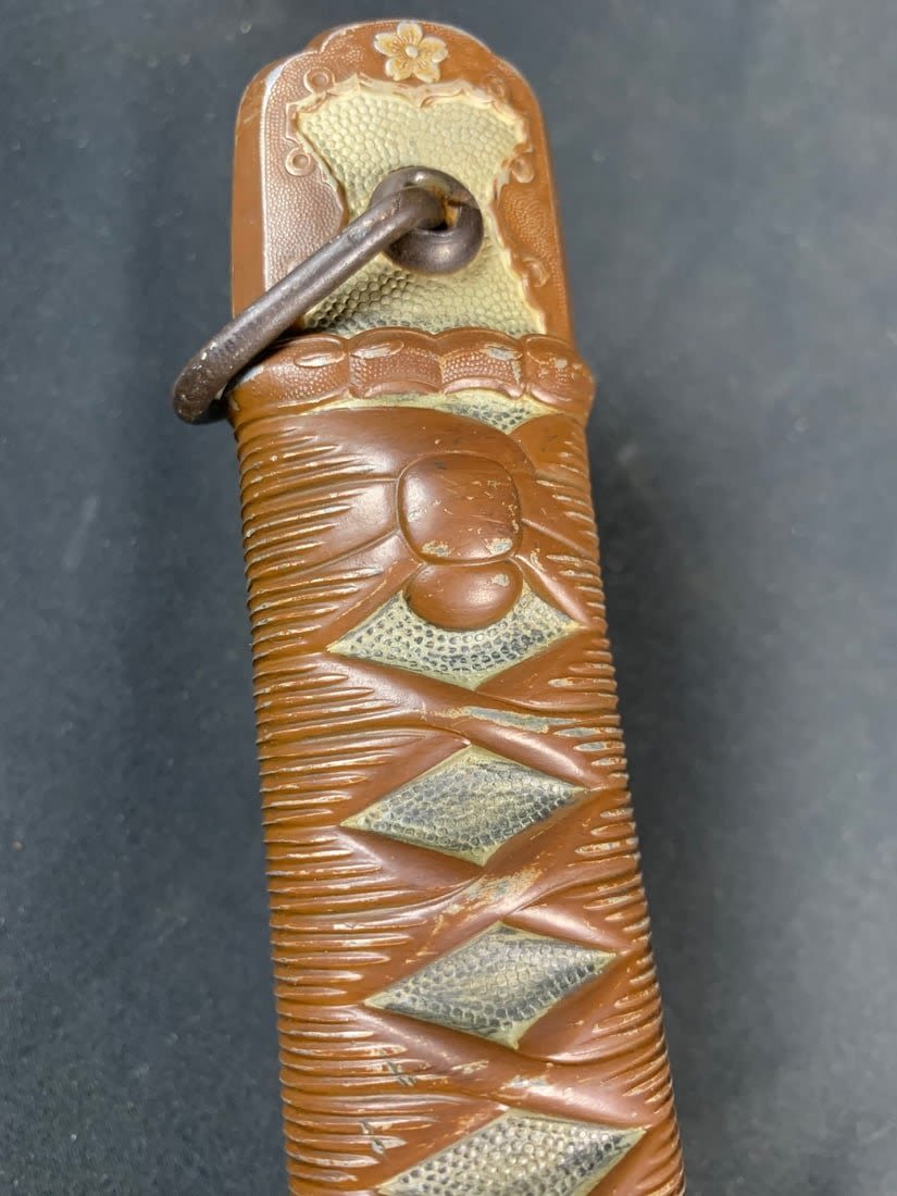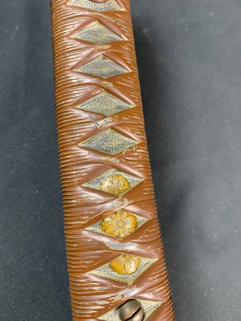 WW2 Period Japanese army NCO Gunto Sword. The aluminum handle shows service wear with some of the brown paint missing. The fuchi hilt collar bears the mark of the kokura arsenal as well as nagoya inspection stamp and the Gifu Sword Company Makers mark.The positioning of the serial number on the sword blad indicaties this blad was manufactured at the nagoya arsenal but produced under the kokura arsenal administration.The blade and Scabbard have Matching Serial numbers. Blade has spots of grey but no chips or active rust.