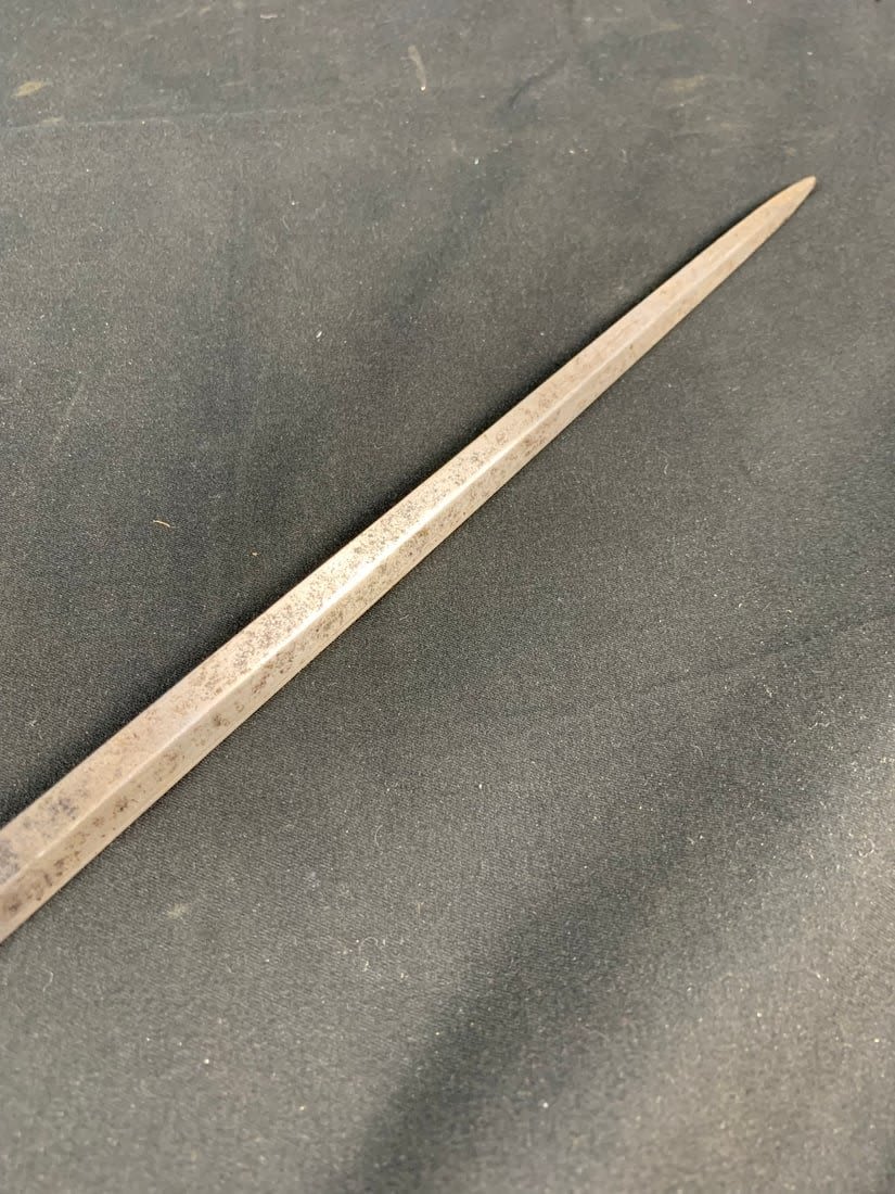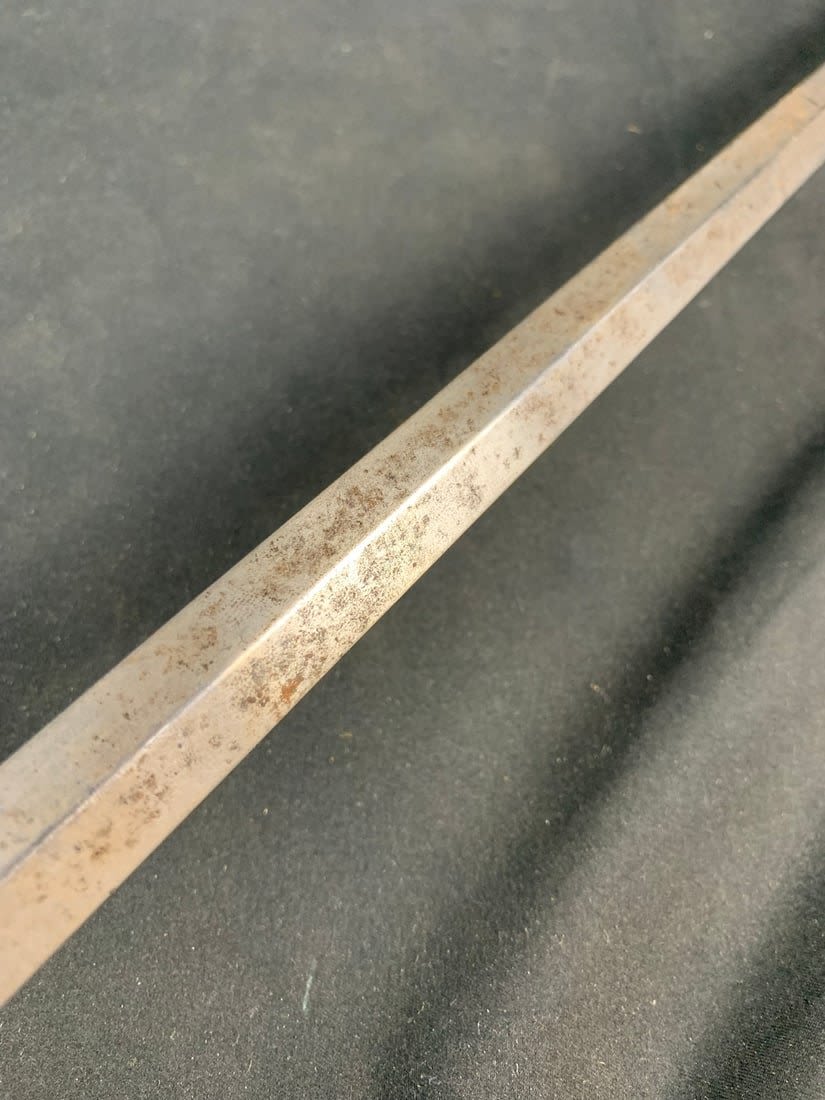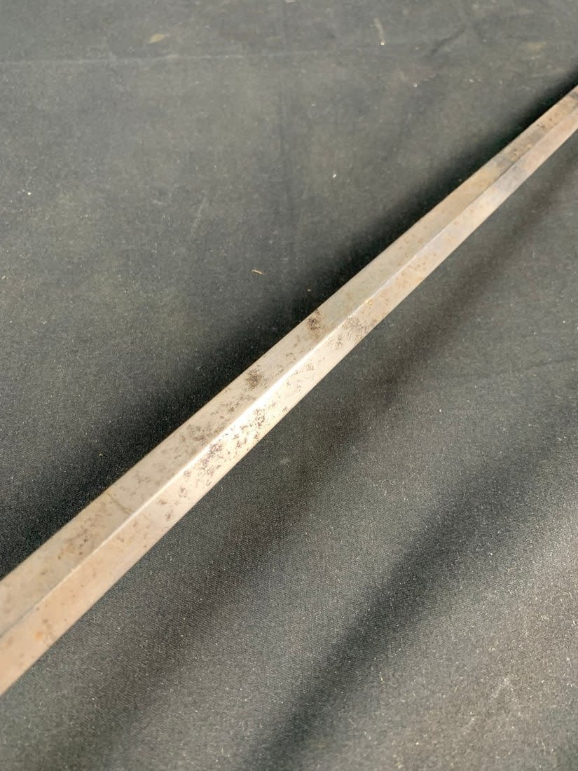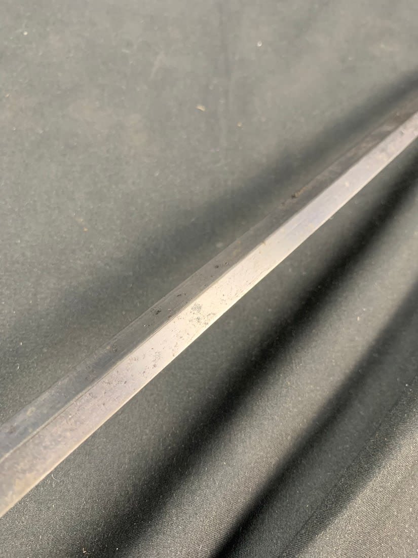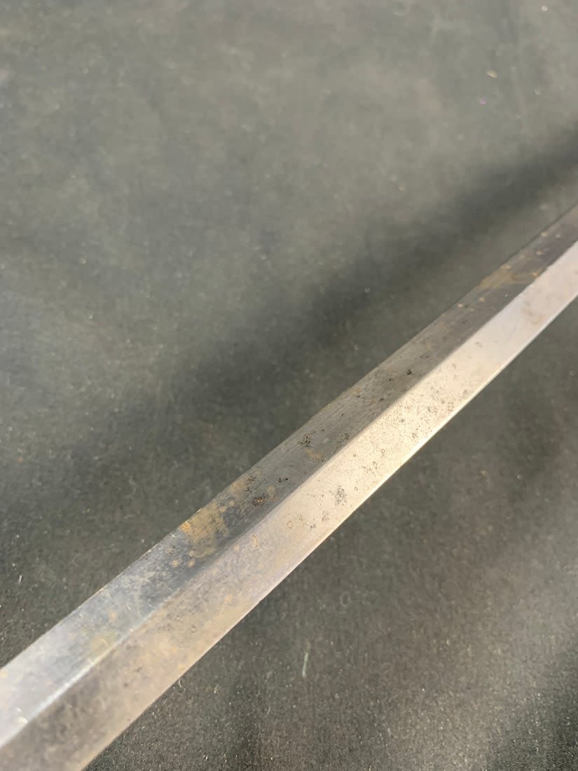 No Scabbard. Blad hassigns of graying and rust. Handle wrap is a little worn and blade measures roughly 40"
