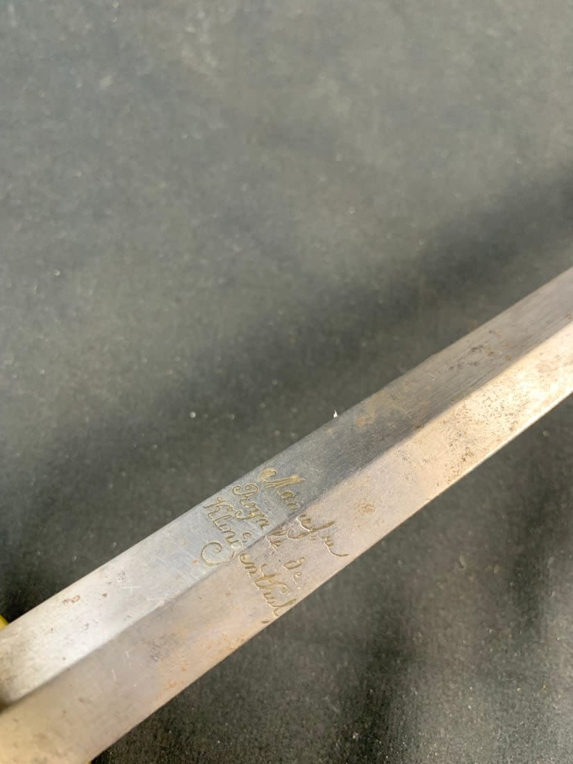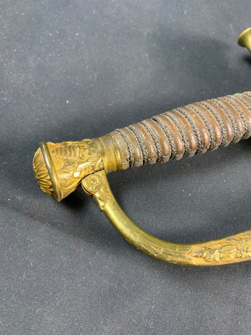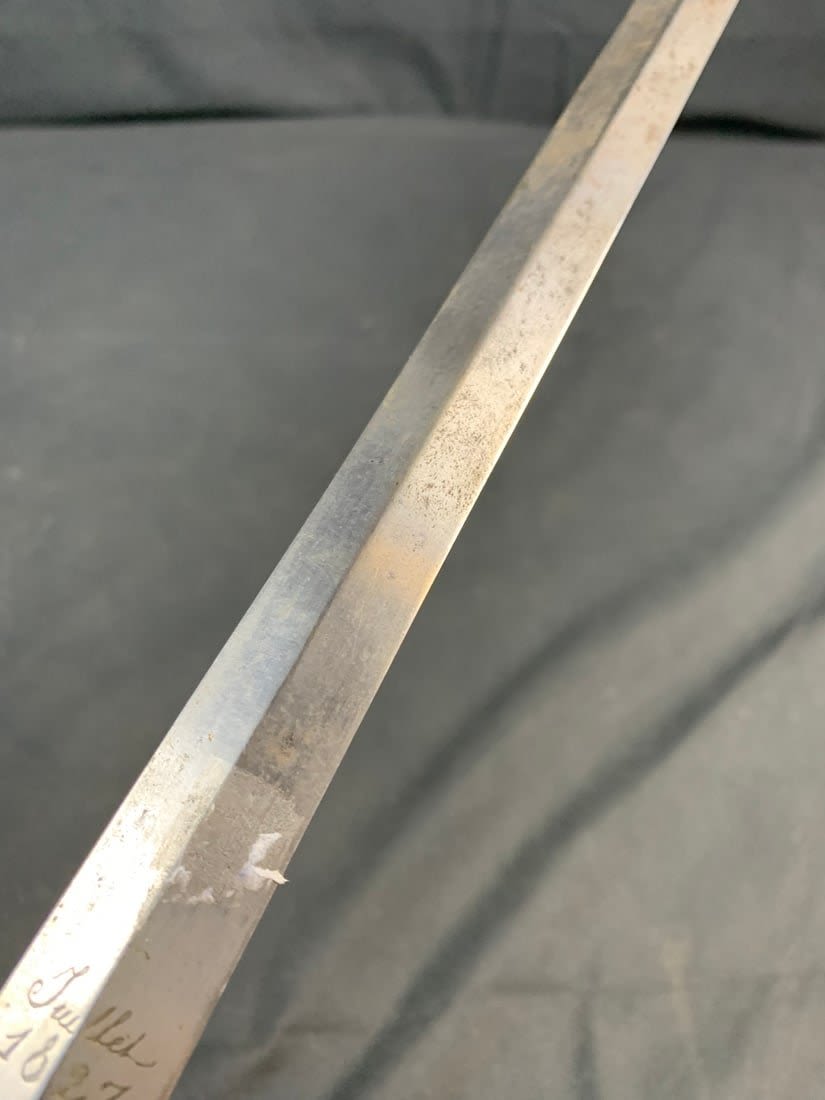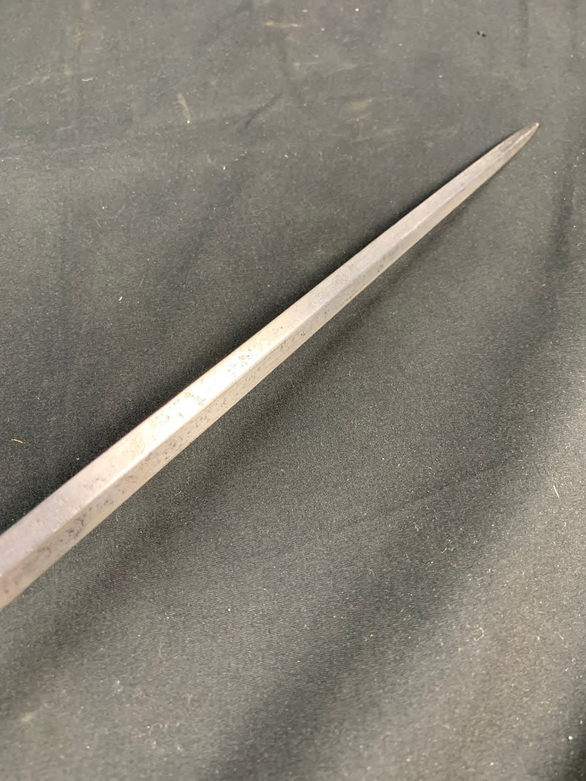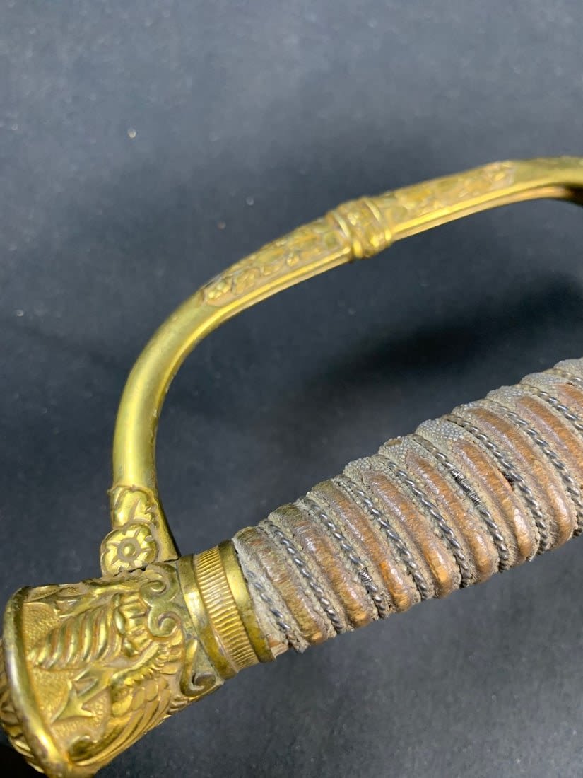 No Scabbard. Blad hassigns of graying and rust. Handle wrap is a little worn and blade measures roughly 40"