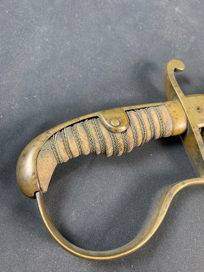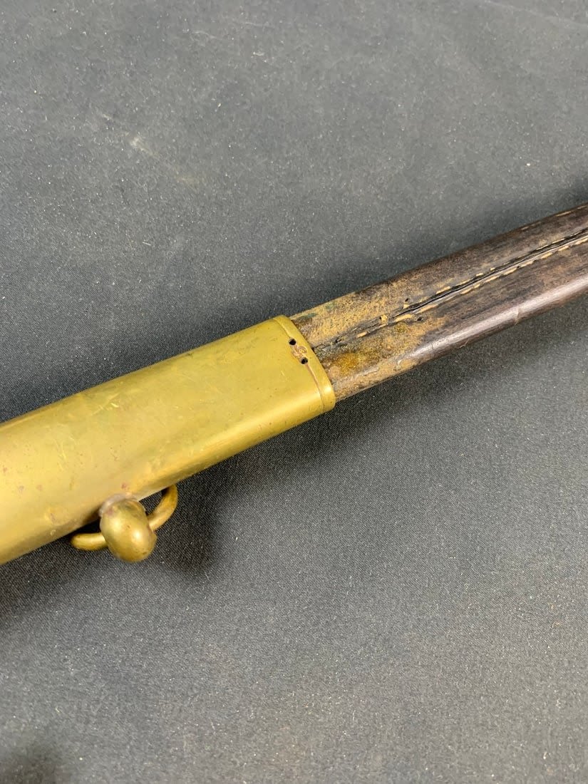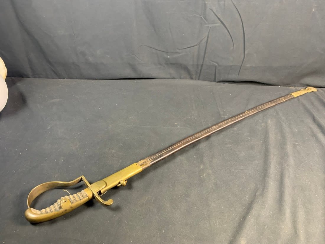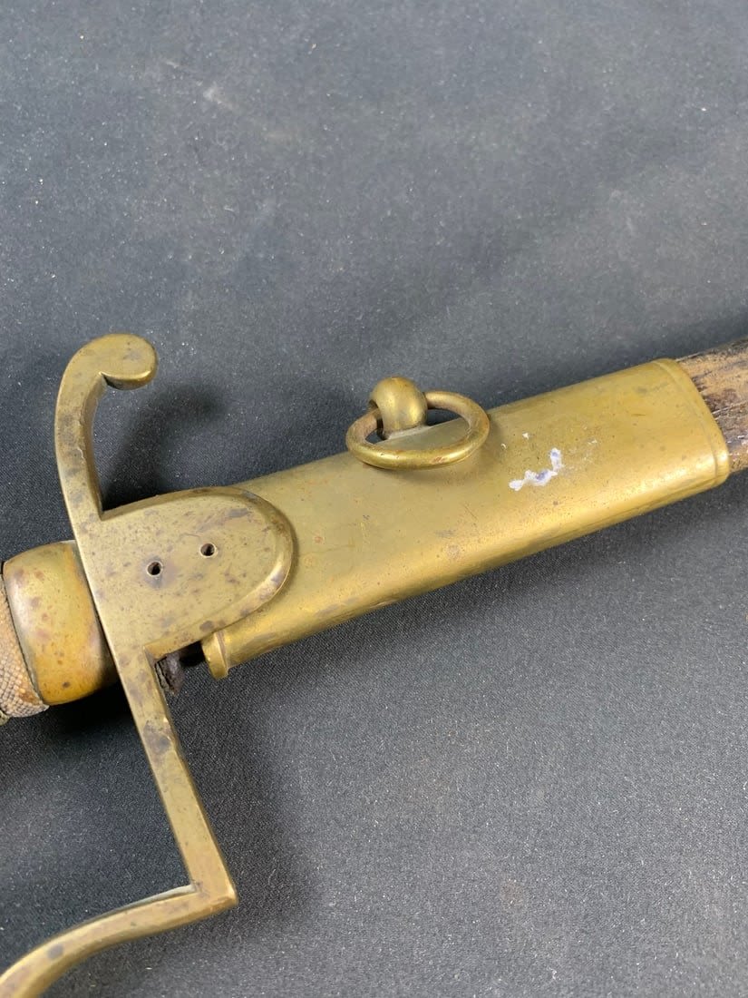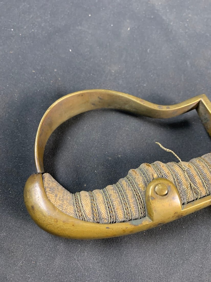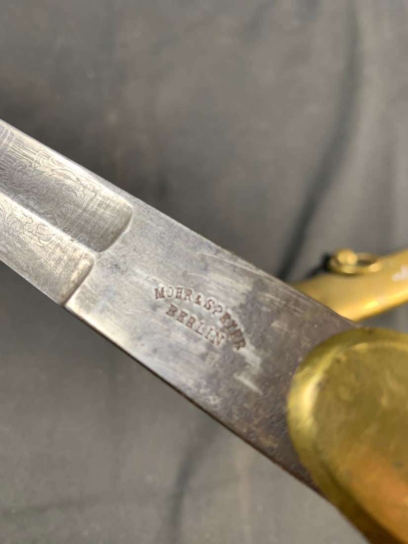 Marked Mohr & Seyers Berlin. Please note sword has signs of graying on blade.Scabbards upper brass ring is no longer connected to scabbard and slides freely. There is cracks in the leather. Tinsel wires have begun to loose from sword handle. Roughly 39" in length