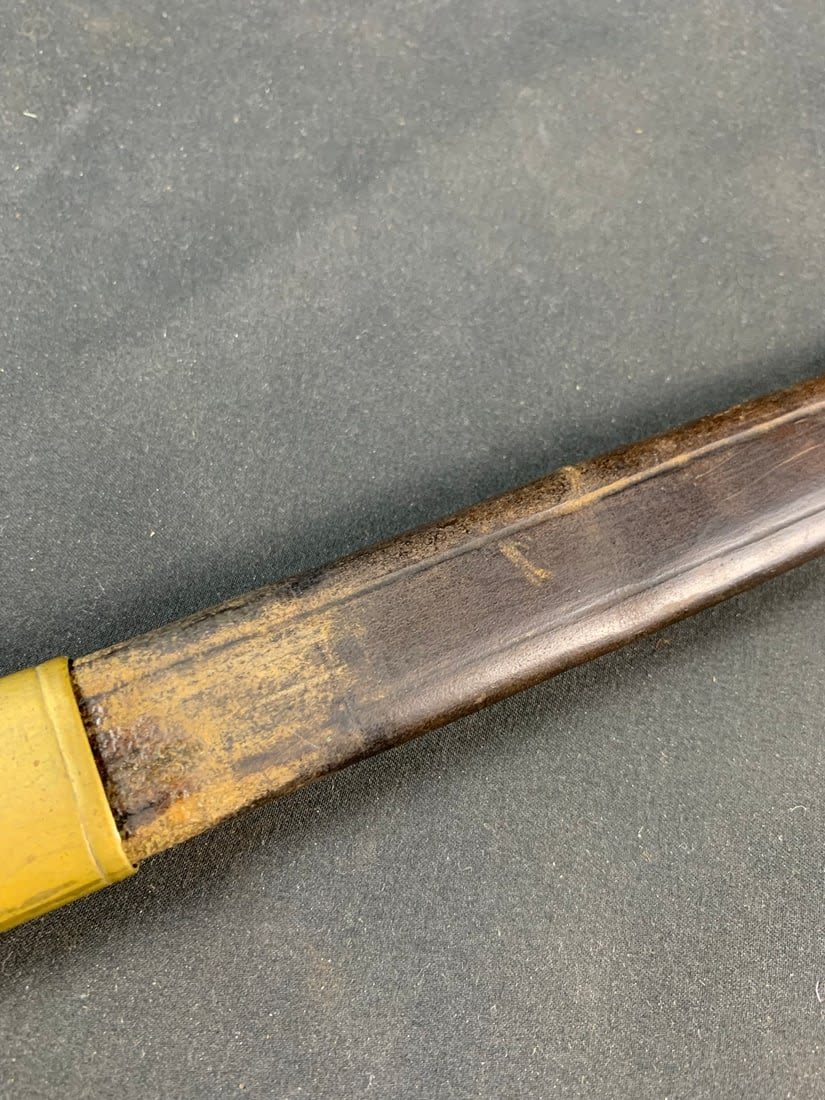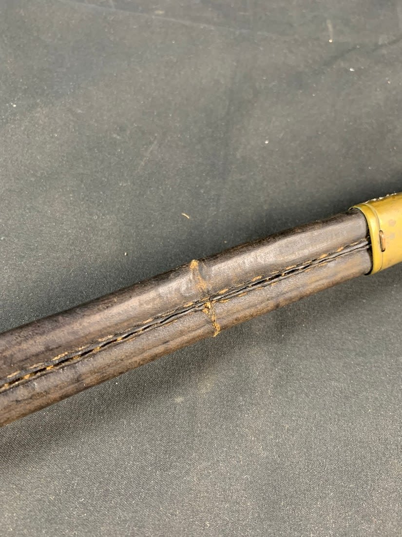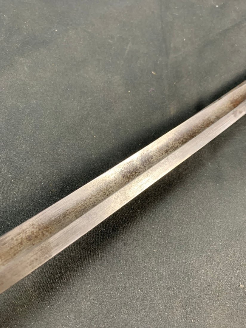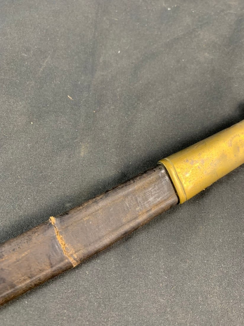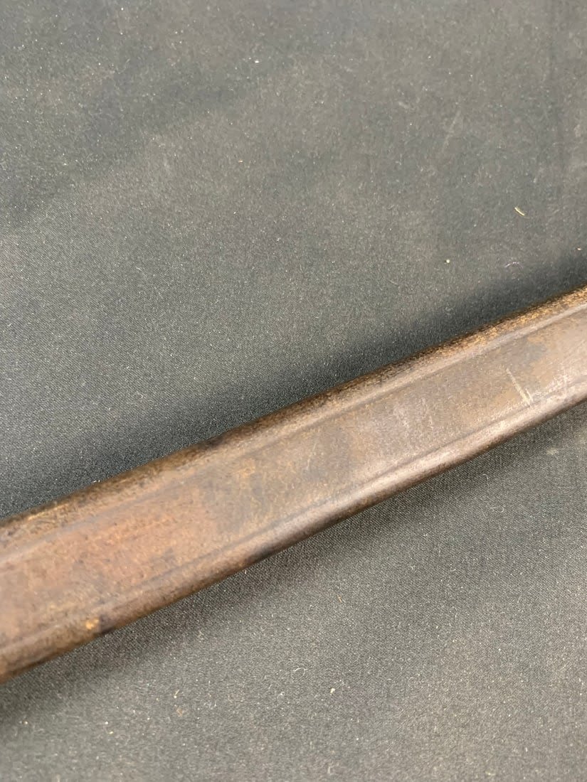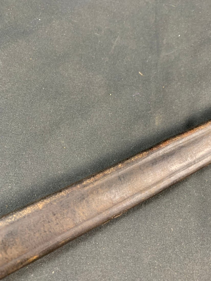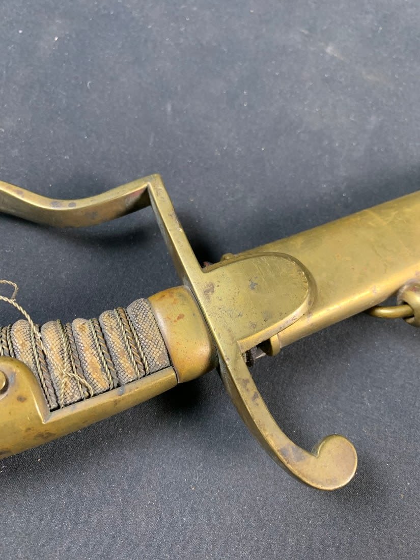Marked Mohr & Seyers Berlin. Please note sword has signs of graying on blade.Scabbards upper brass ring is no longer connected to scabbard and slides freely. There is cracks in the leather. Tinsel wires have begun to loose from sword handle. Roughly 39" in length