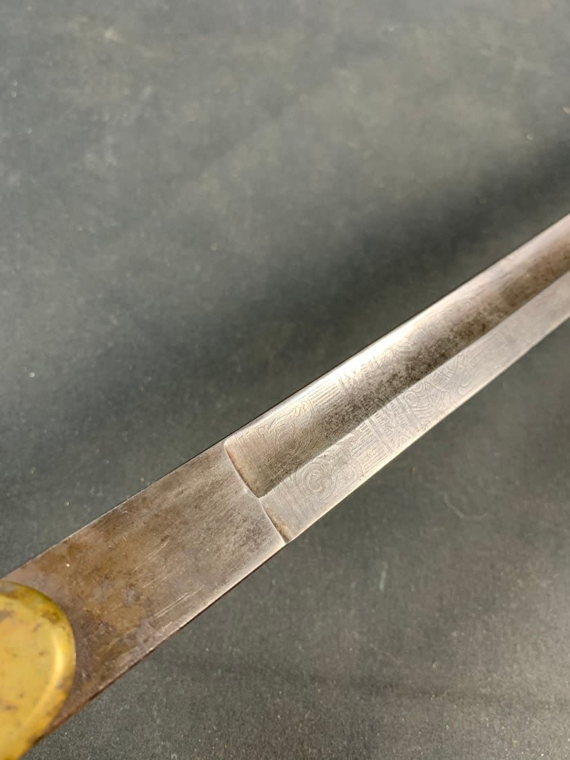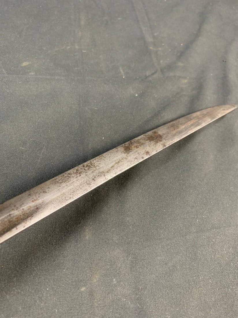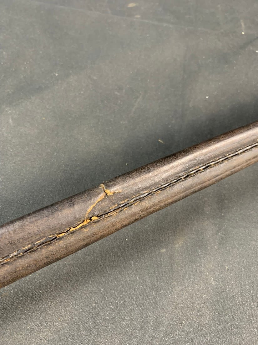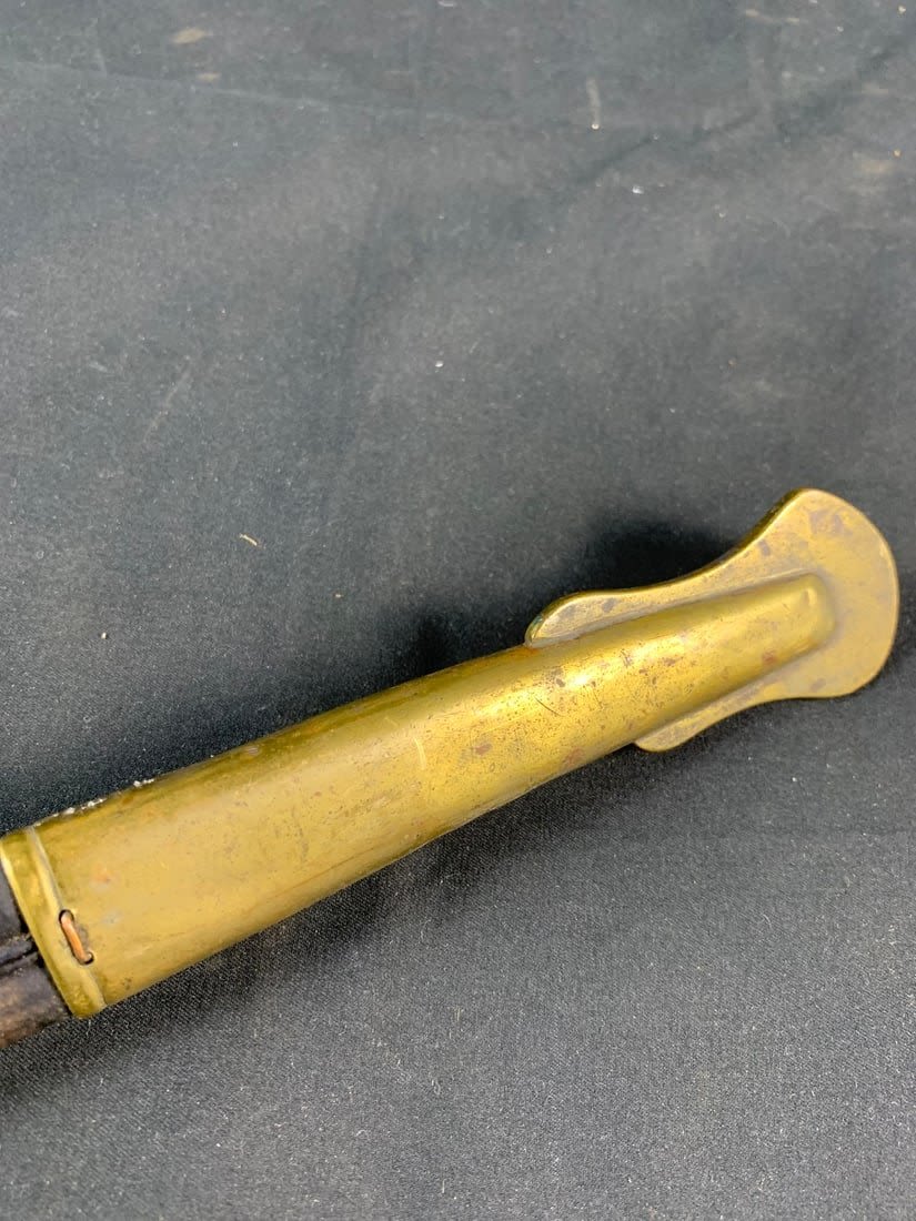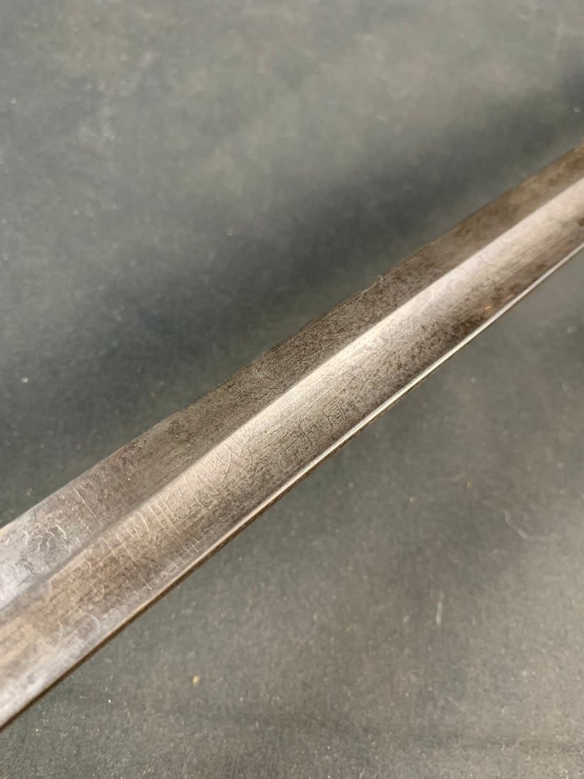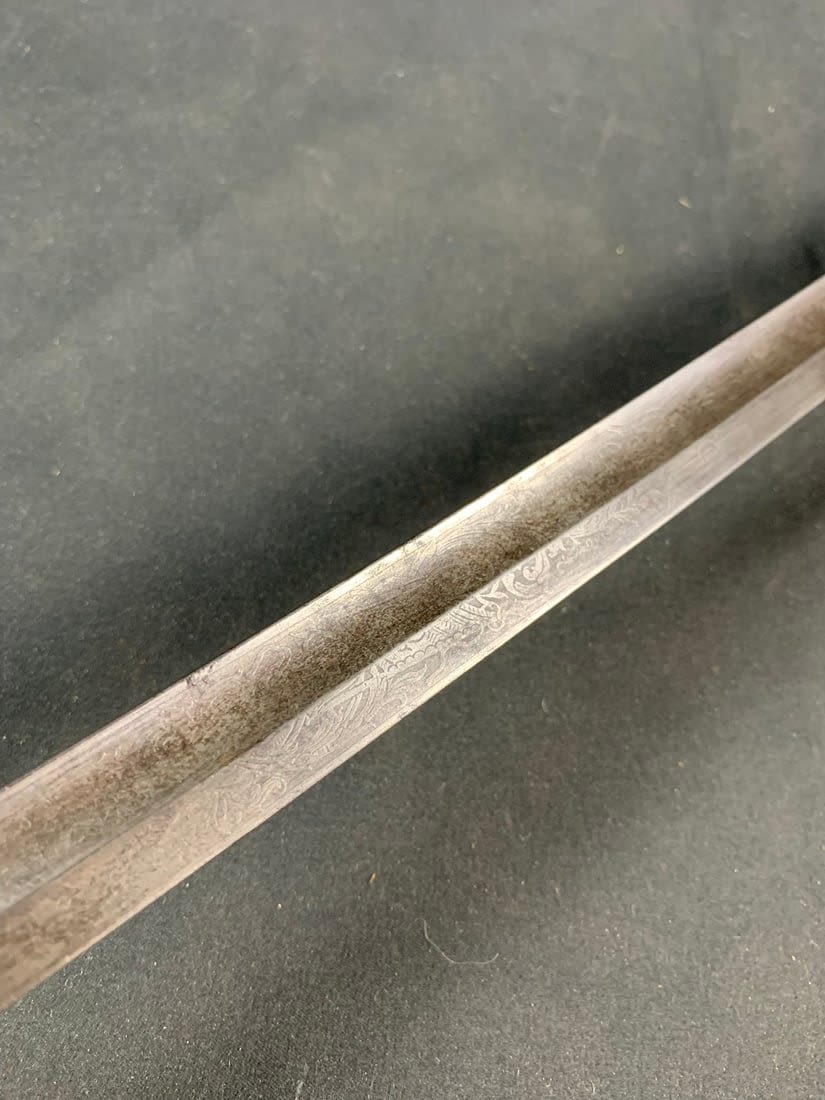Marked Mohr & Seyers Berlin. Please note sword has signs of graying on blade.Scabbards upper brass ring is no longer connected to scabbard and slides freely. There is cracks in the leather. Tinsel wires have begun to loose from sword handle. Roughly 39" in length