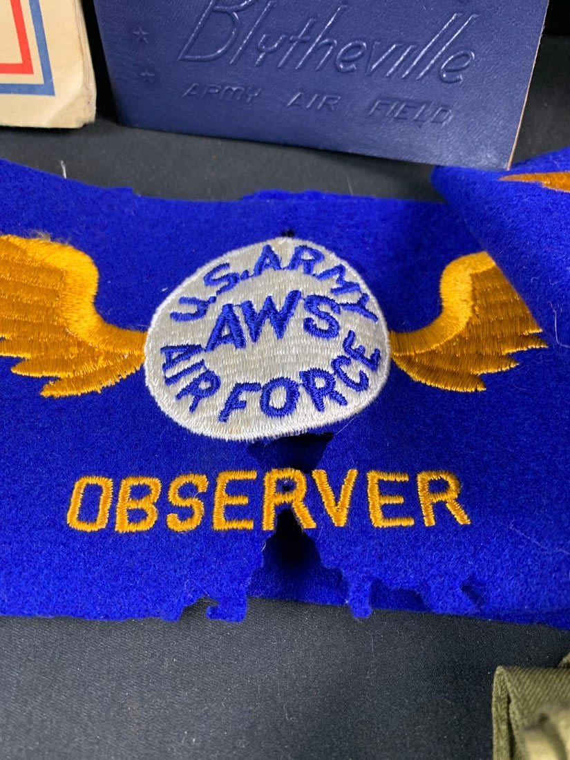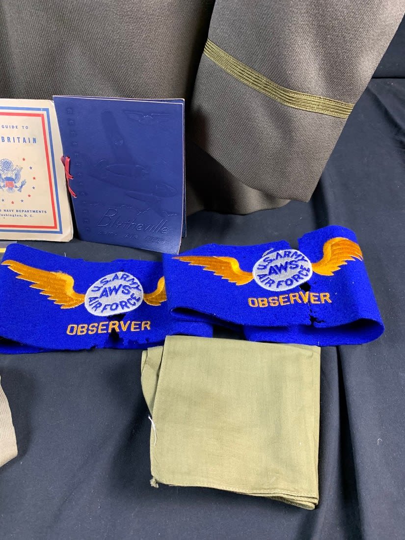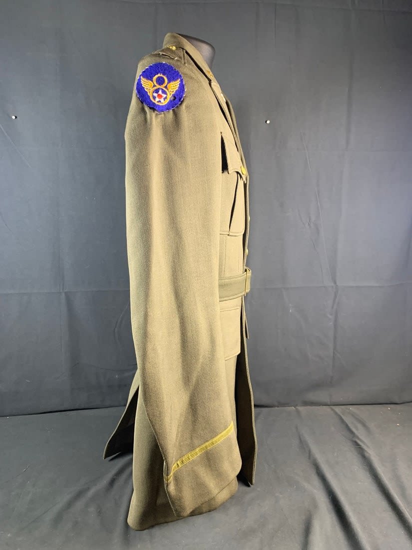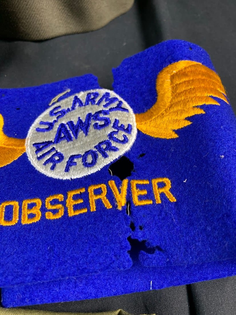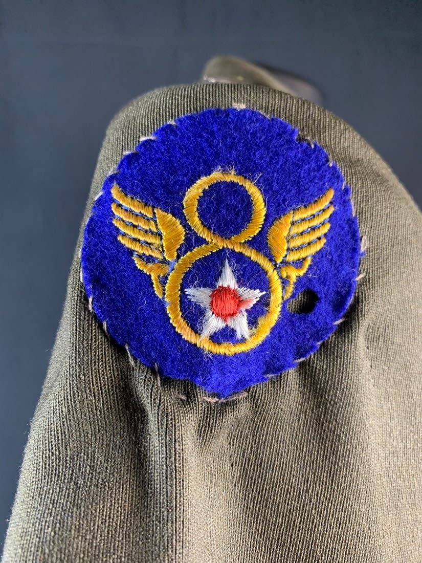 Named to a Lt. Features 4 pocket uniform with a wool stubby wing 8th patch on right arm. Also included is flight observers armbands that do have mothing. Bottom button of jacket has been replaced and patch shows a little sign of mothing