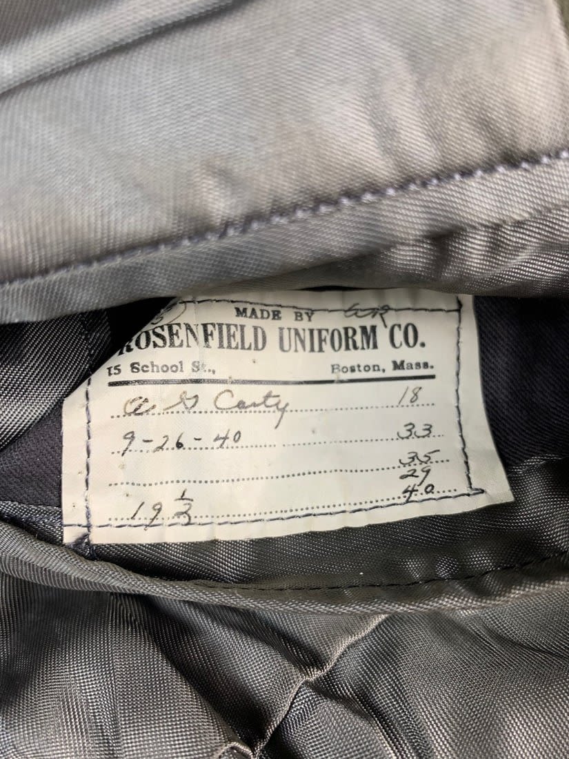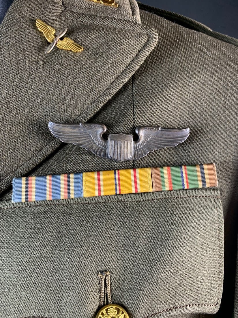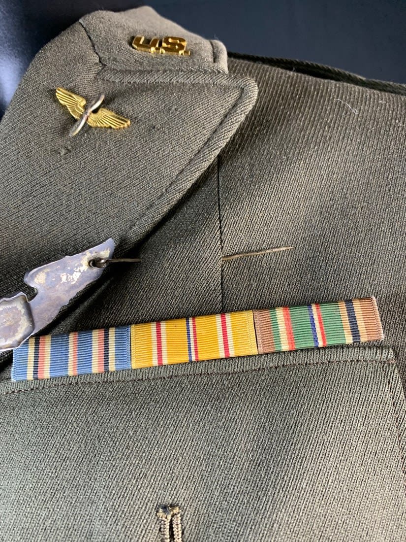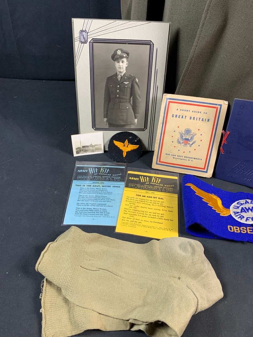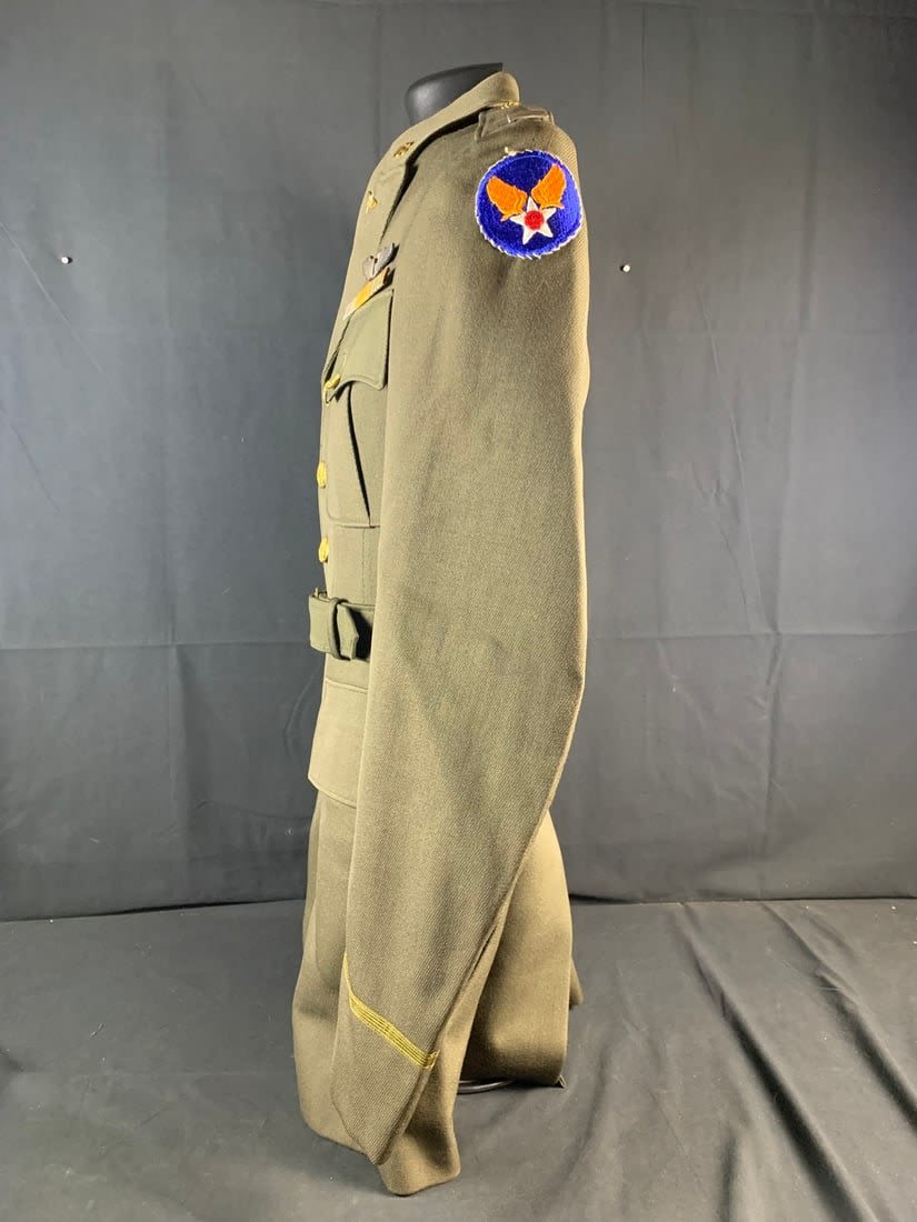 Named to a Lt. Features 4 pocket uniform with a wool stubby wing 8th patch on right arm. Also included is flight observers armbands that do have mothing. Bottom button of jacket has been replaced and patch shows a little sign of mothing