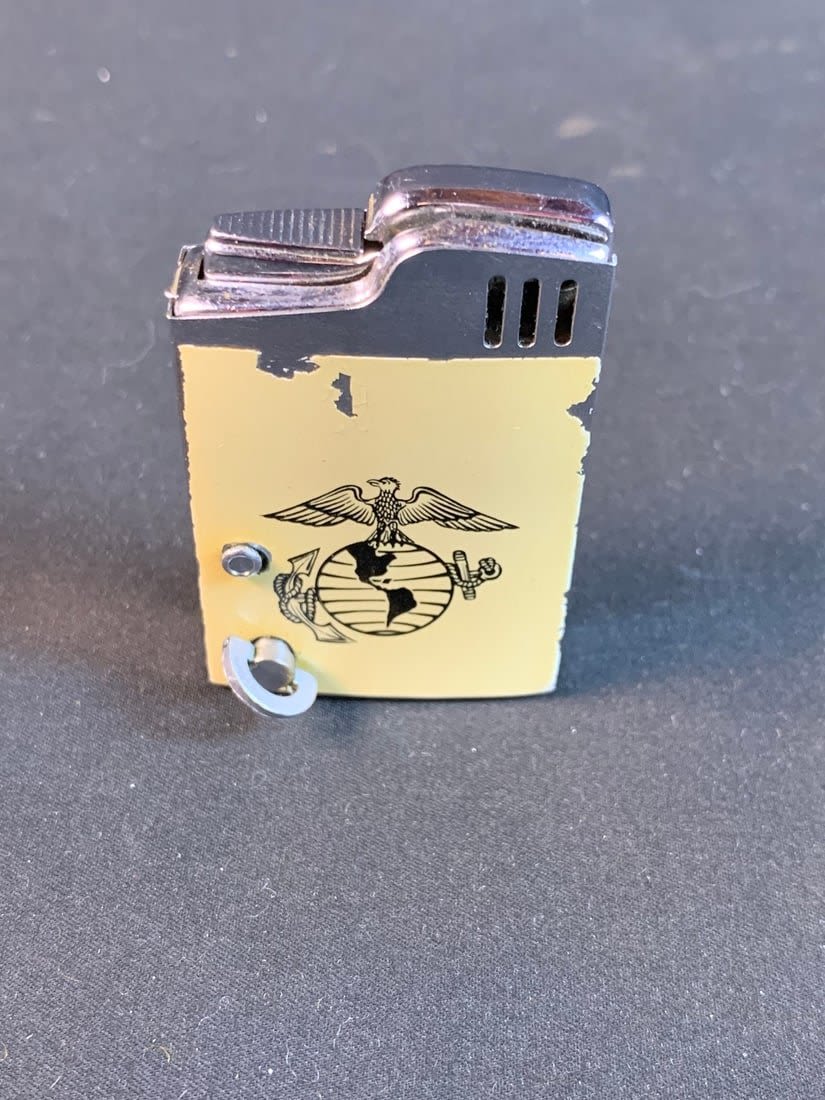 Lighter not tested. Music does wind and works. Plays USMC anthem. Some paint loss on artwork of lighter