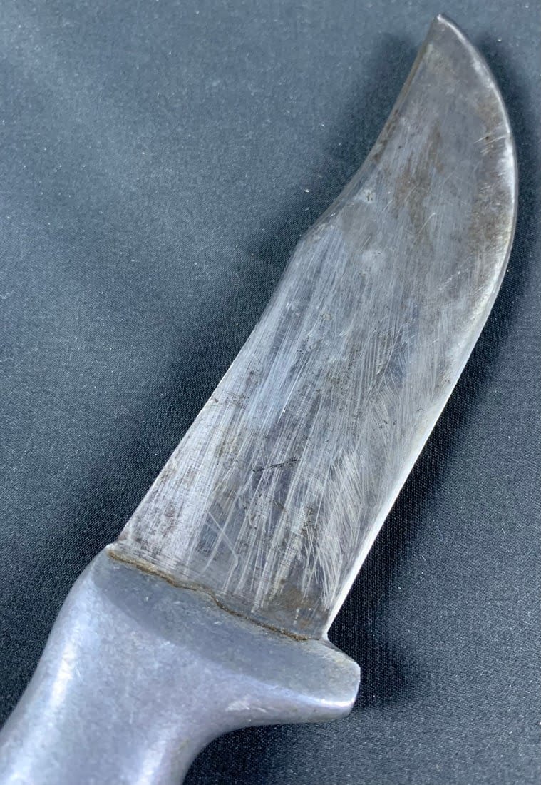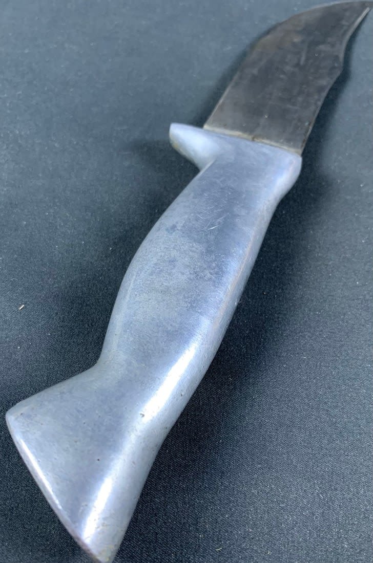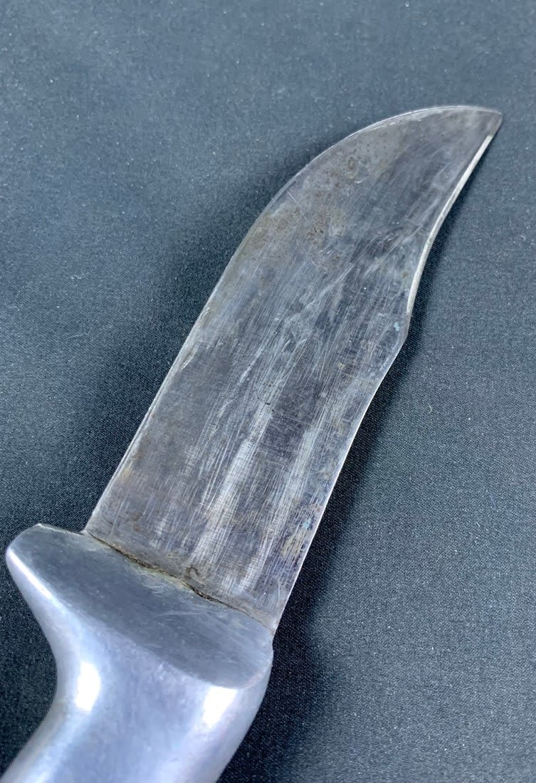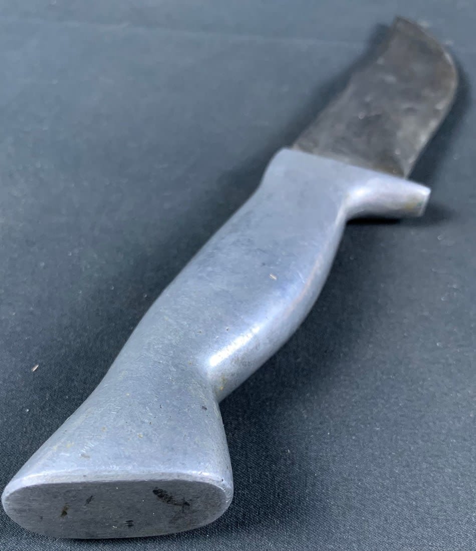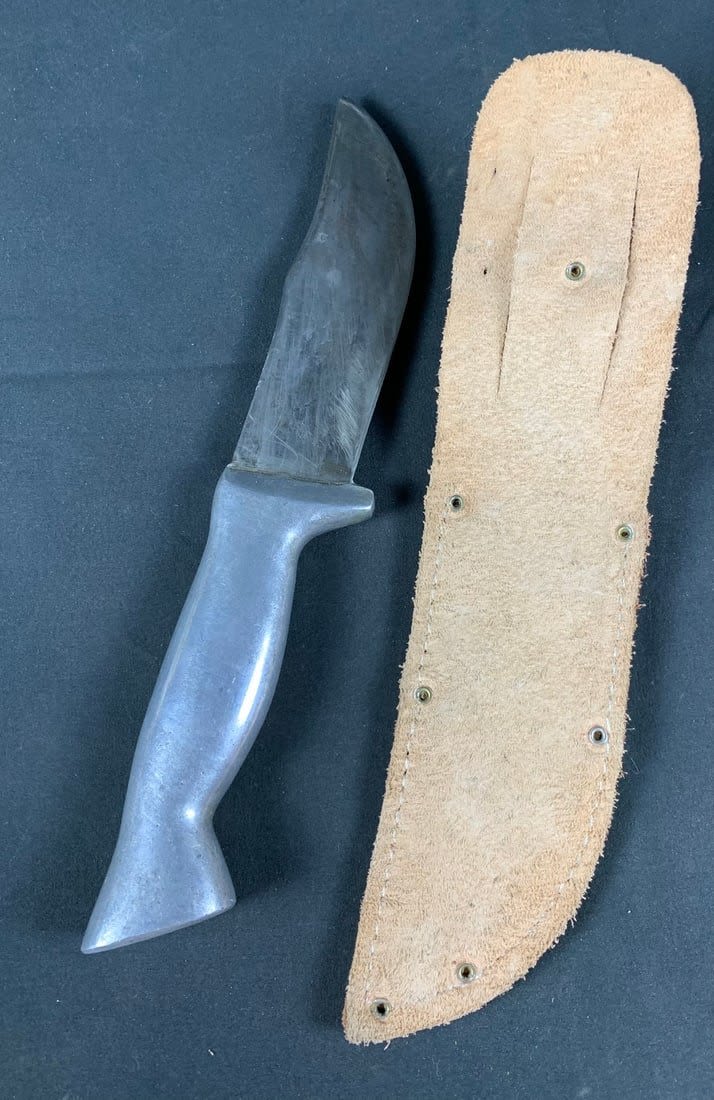 Aluminum handle. Roughly 9.5" long with sheath. Possibly Moore Made Knife