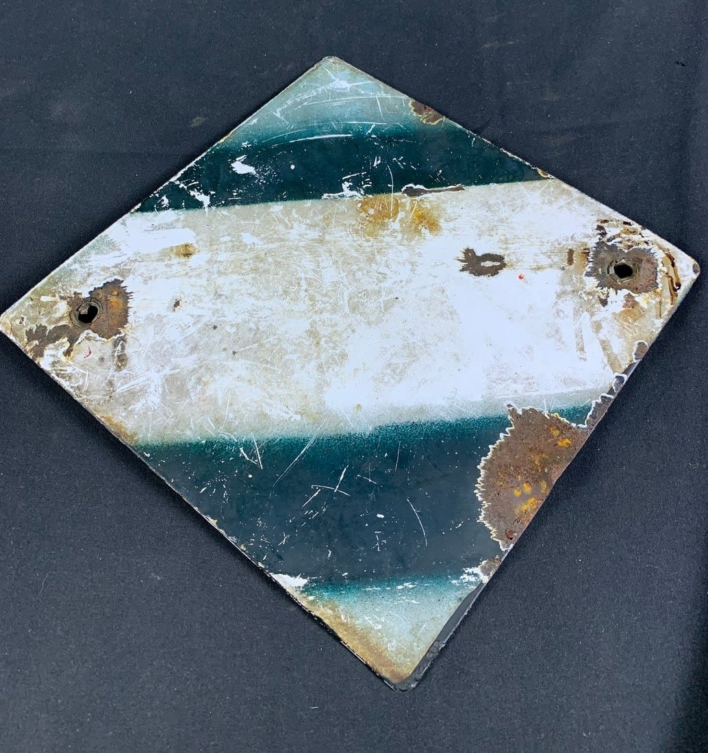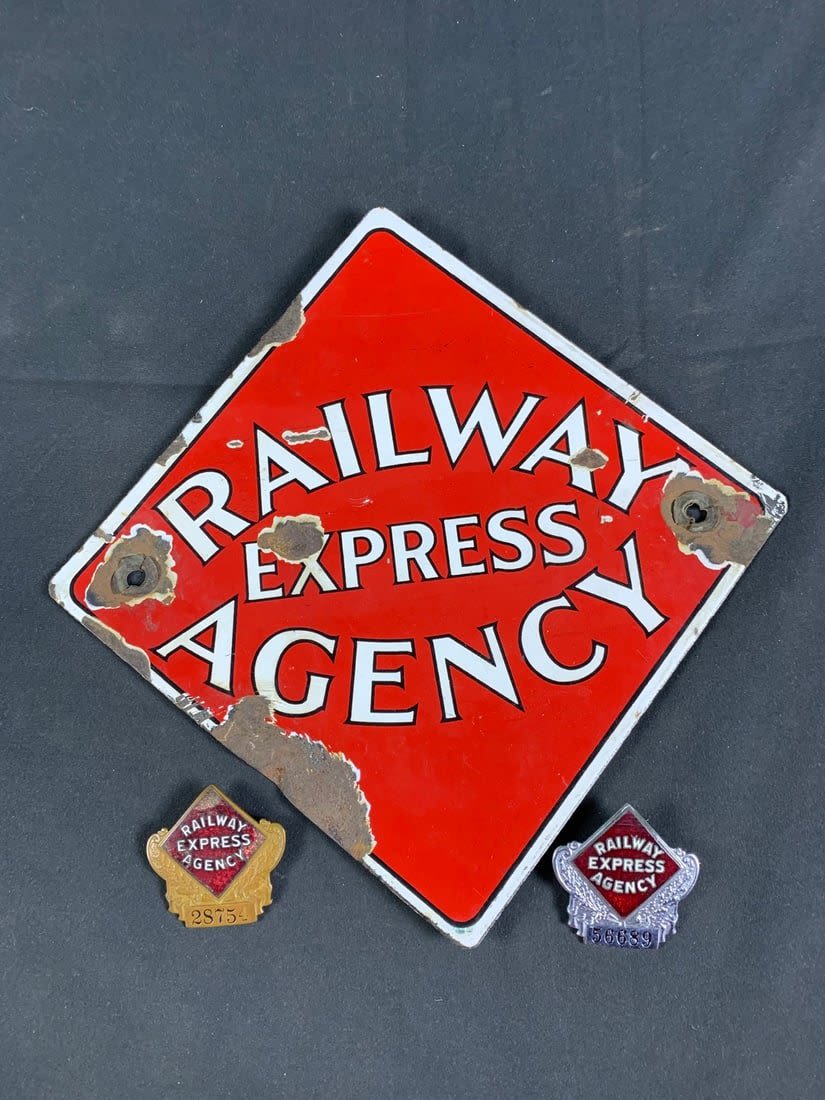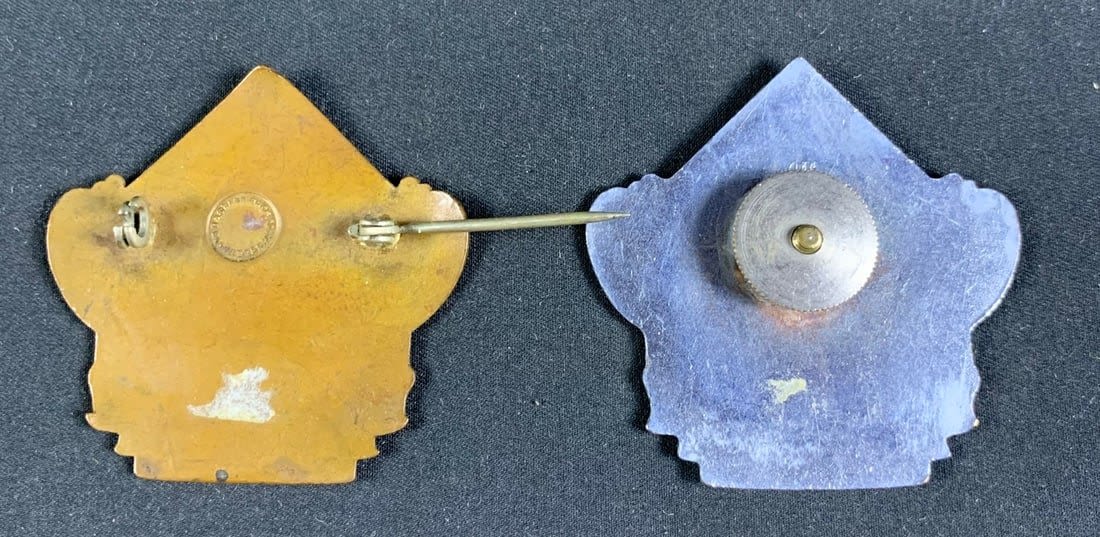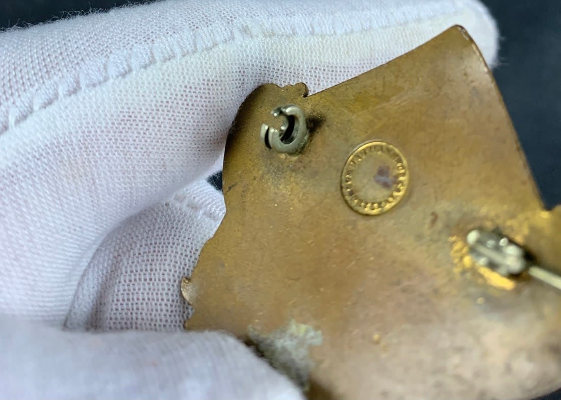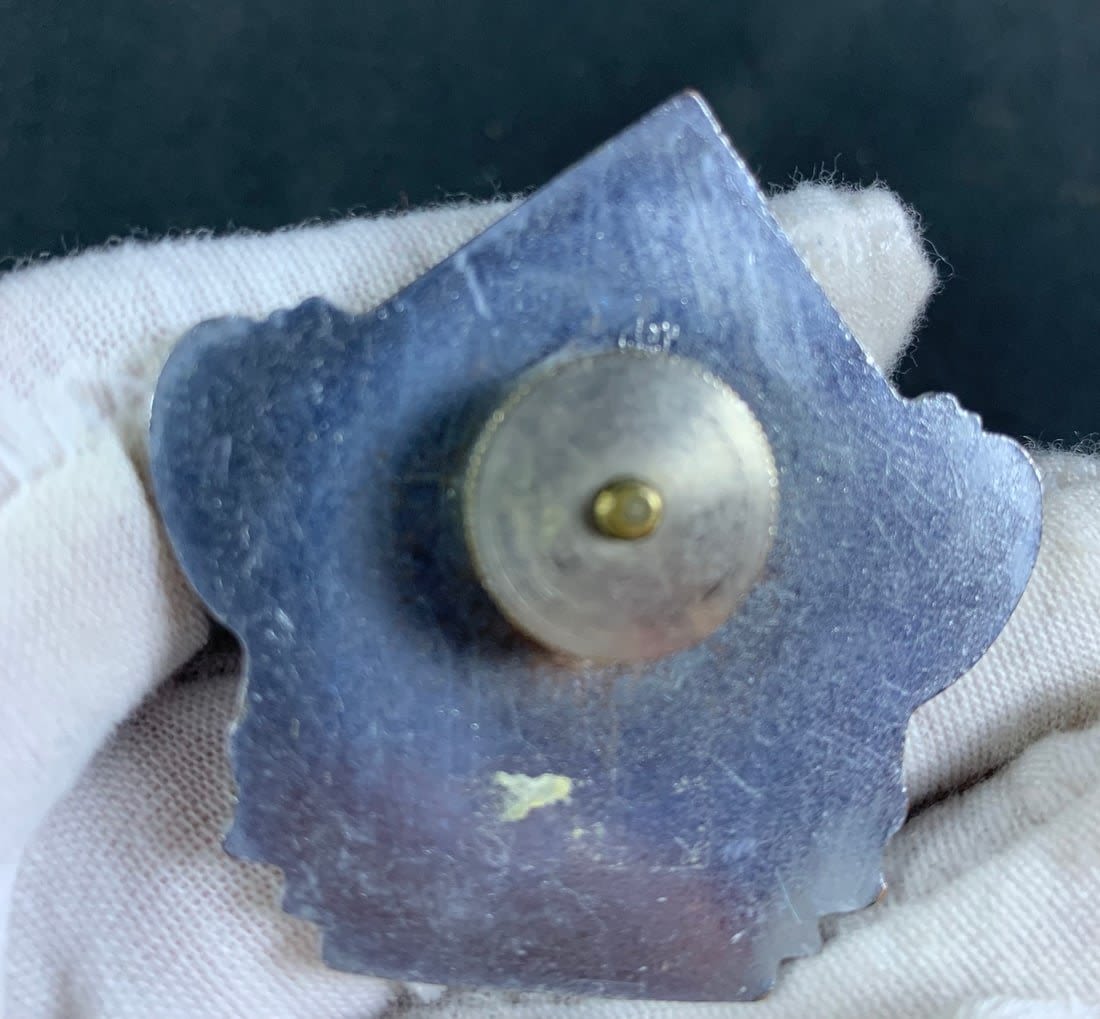 Sign measures 8" and has some wear but displays well. Gold tone badge has some enamel loss and roller catch is broke