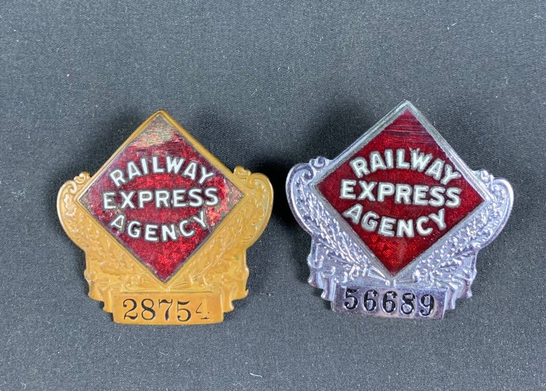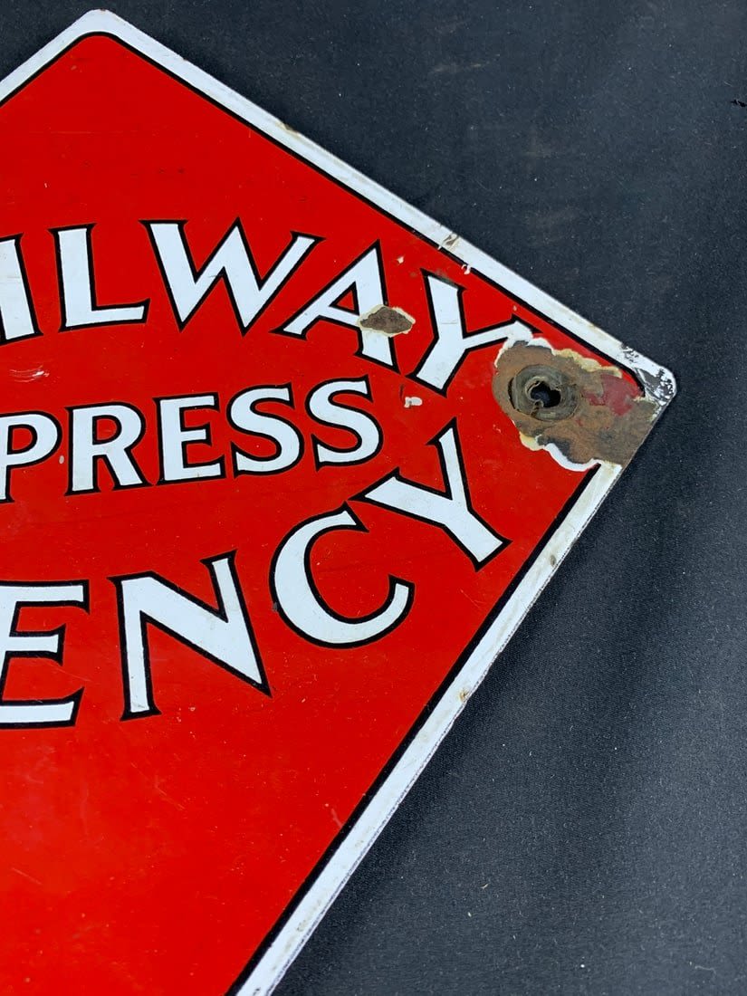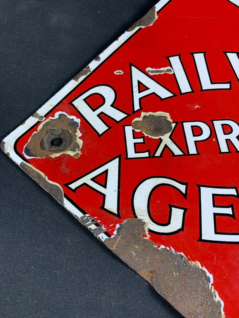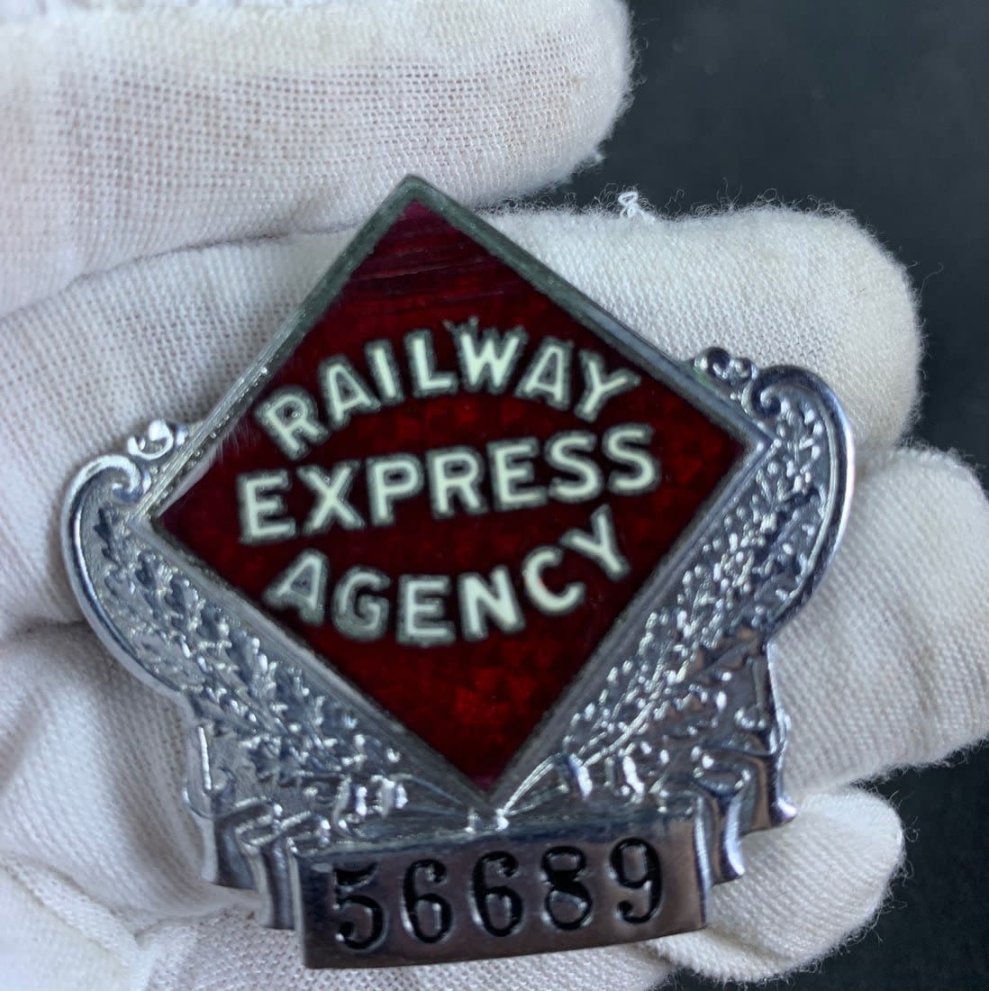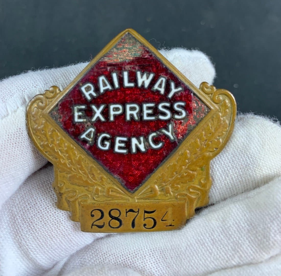 Sign measures 8" and has some wear but displays well. Gold tone badge has some enamel loss and roller catch is broke