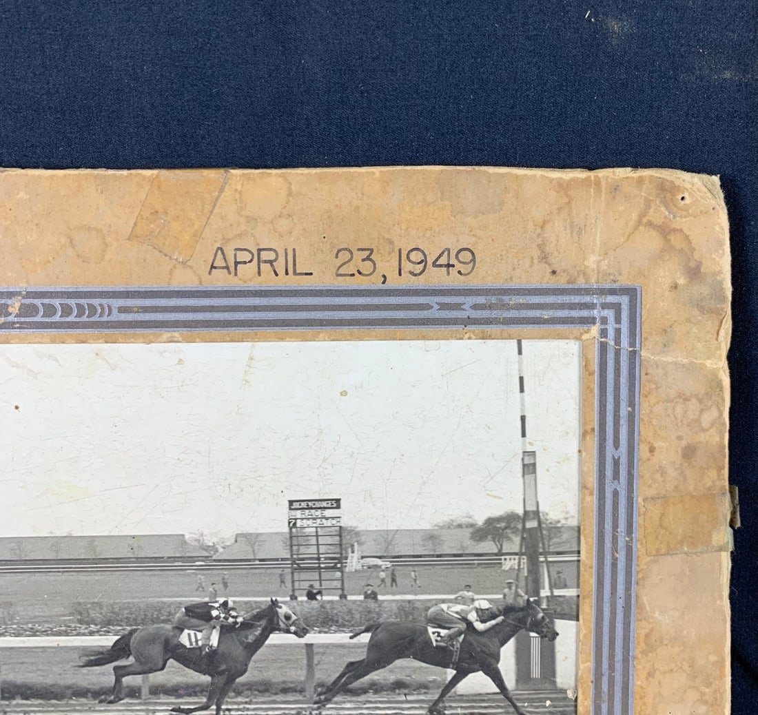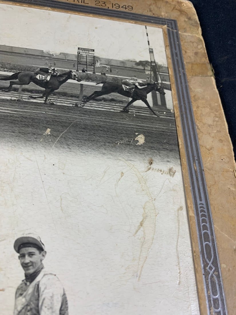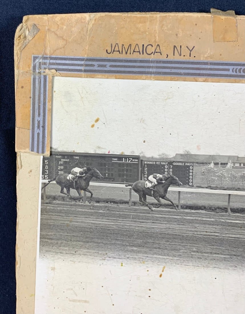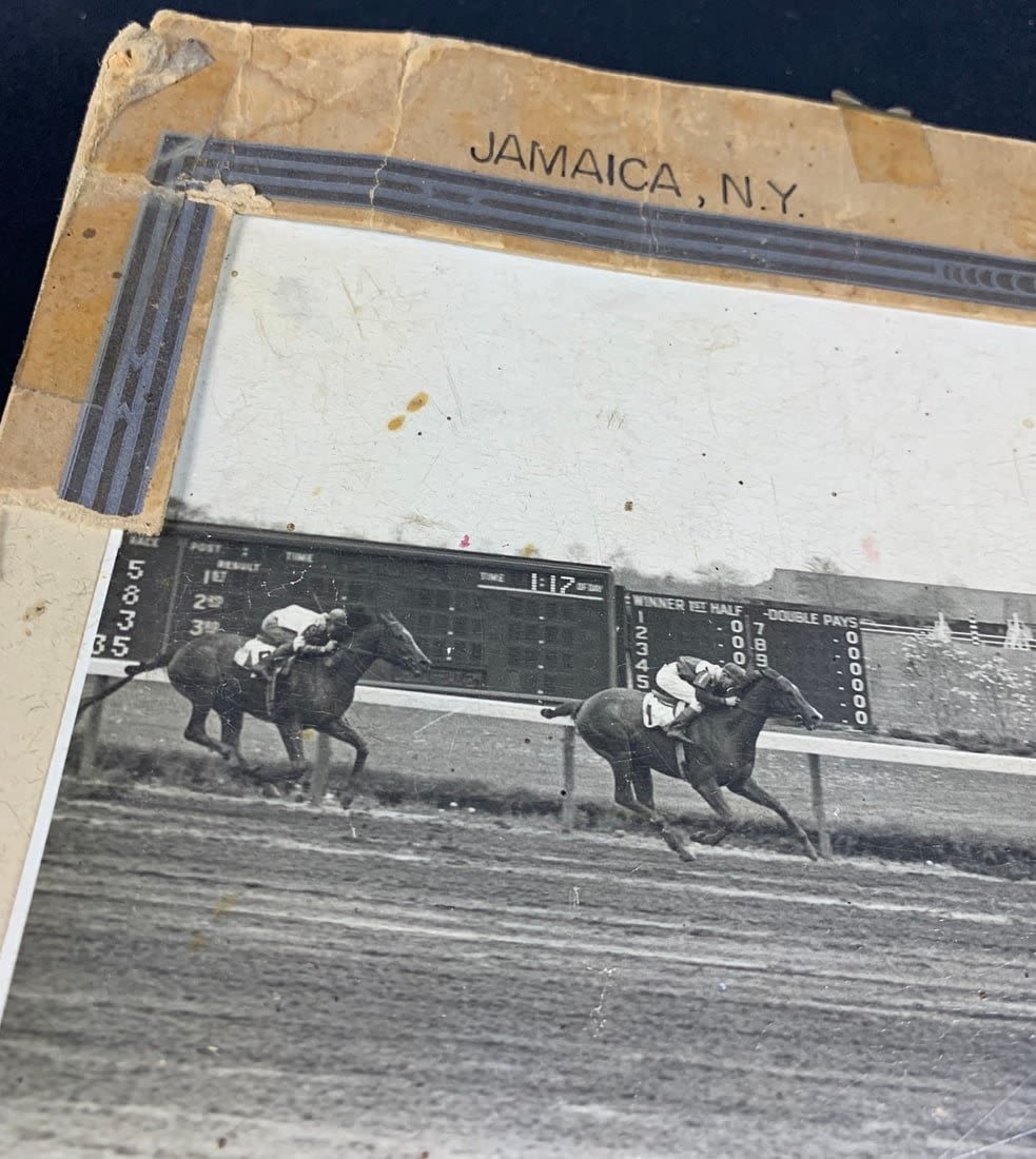 From the 1949 Race at the Jamaica Racetrack. This photo shows signs of wear and stains. Partial border is missing and has broken off. Roughly 17"x12"