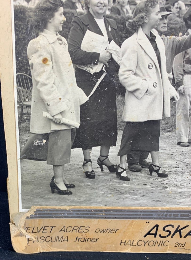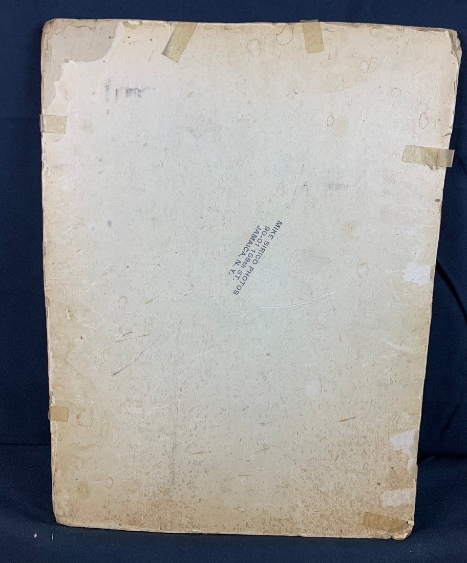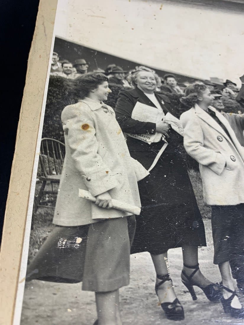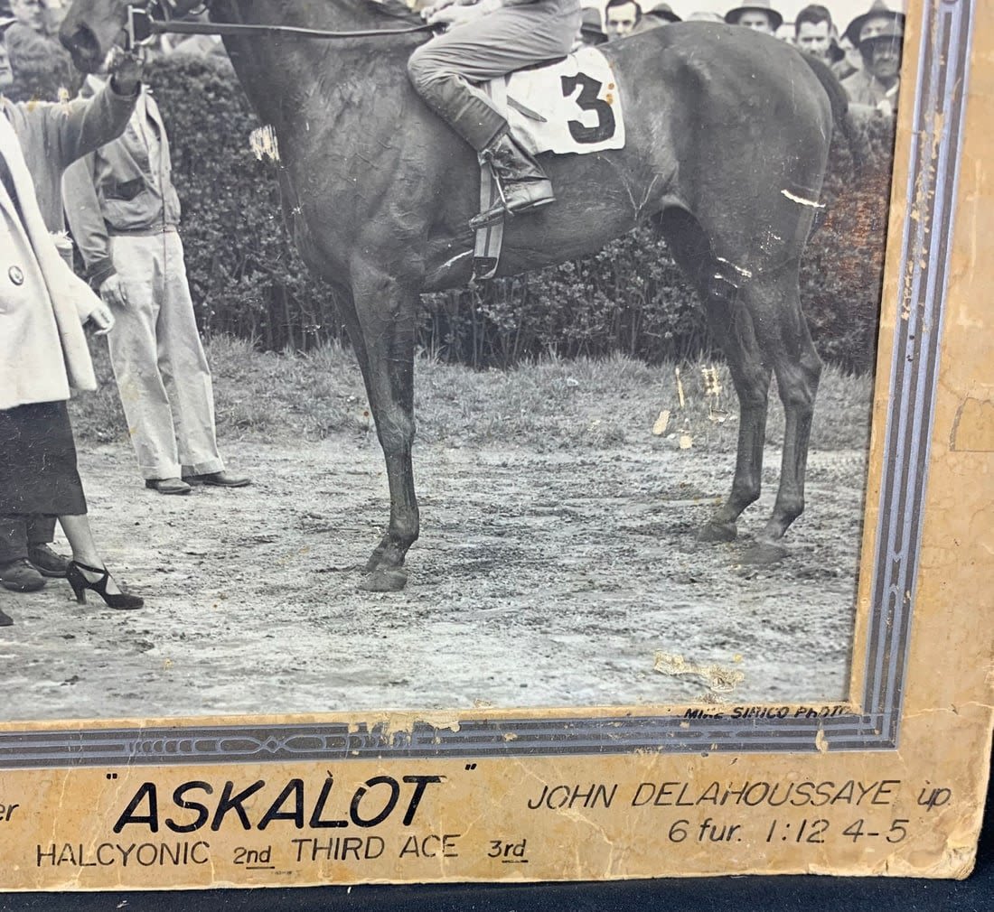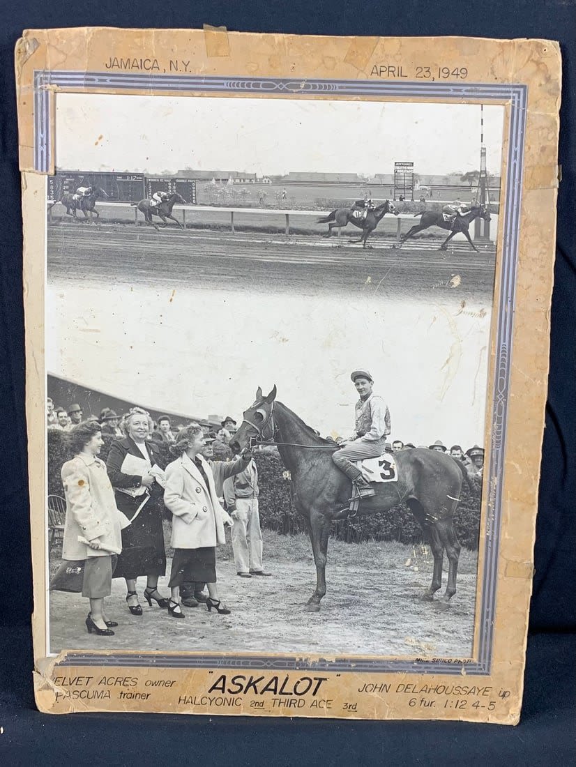 From the 1949 Race at the Jamaica Racetrack. This photo shows signs of wear and stains. Partial border is missing and has broken off. Roughly 17"x12"